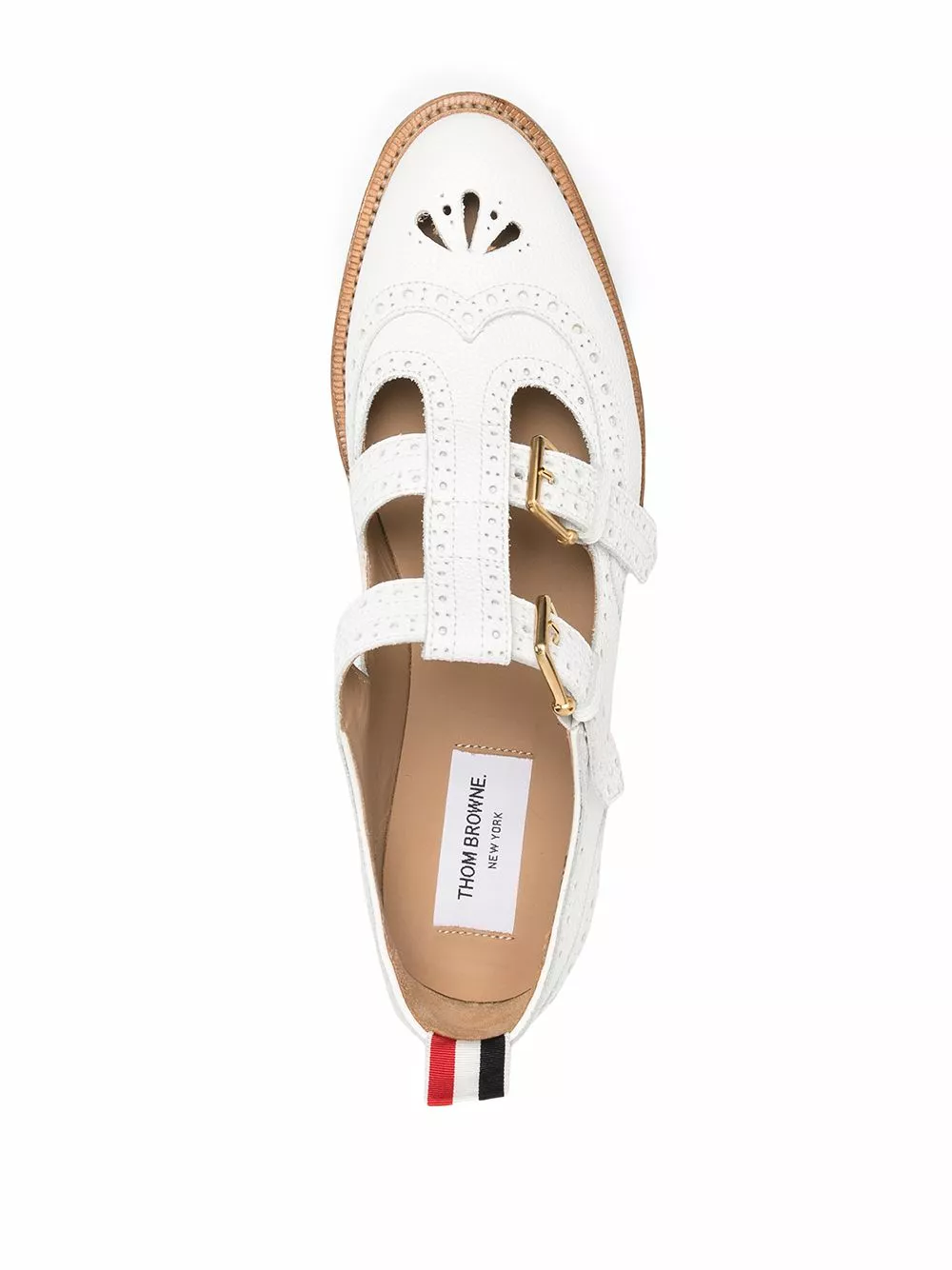We love the unique combo design of this Thom Browne pair. Crafted in white calf leather, these 2-strap T-bar shoes with their brogue detailing boast a Mary Jane and a brogue style in-one. The result is striking. Featuring an almond toe, a cut out detail, brogue detailing, a pull tab at the rear and a leather sole.
