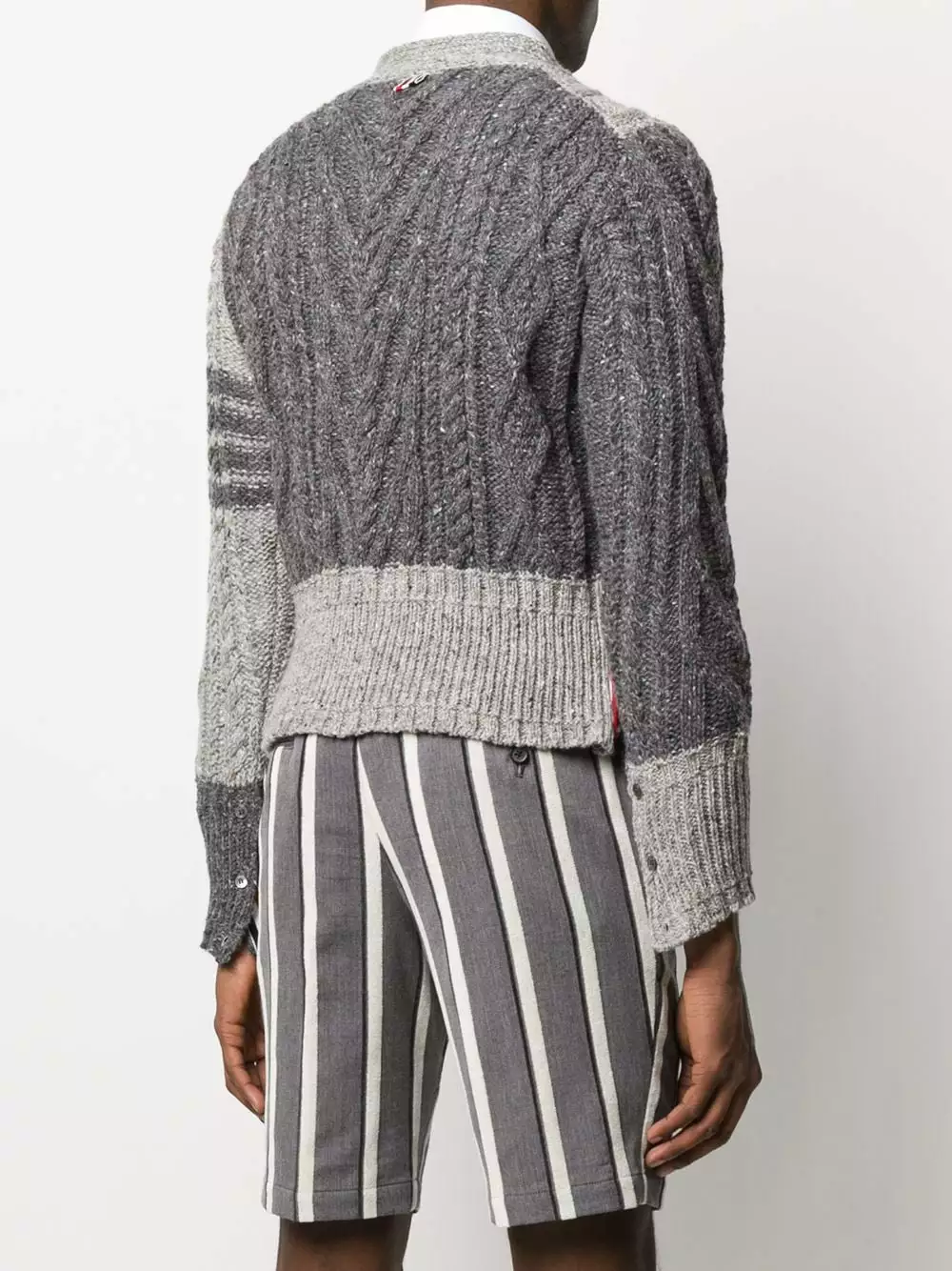 Four strikes and you’re Thom Browne. Crafted from tonal grey wool, this Aran knit cardigan from Thom Browne is unique in its shrunken design and 4-Bar stripe detailing to the left arm. Elevate your knitwear game. Featuring a v-neck, a front button fastening, an aran knit, a side button fastening and two front pockets.