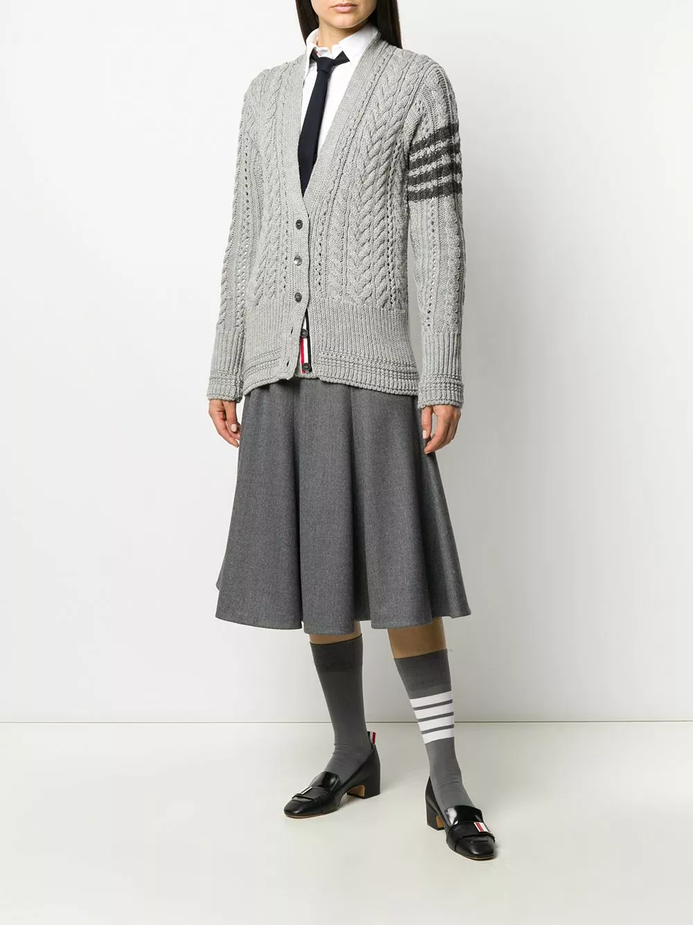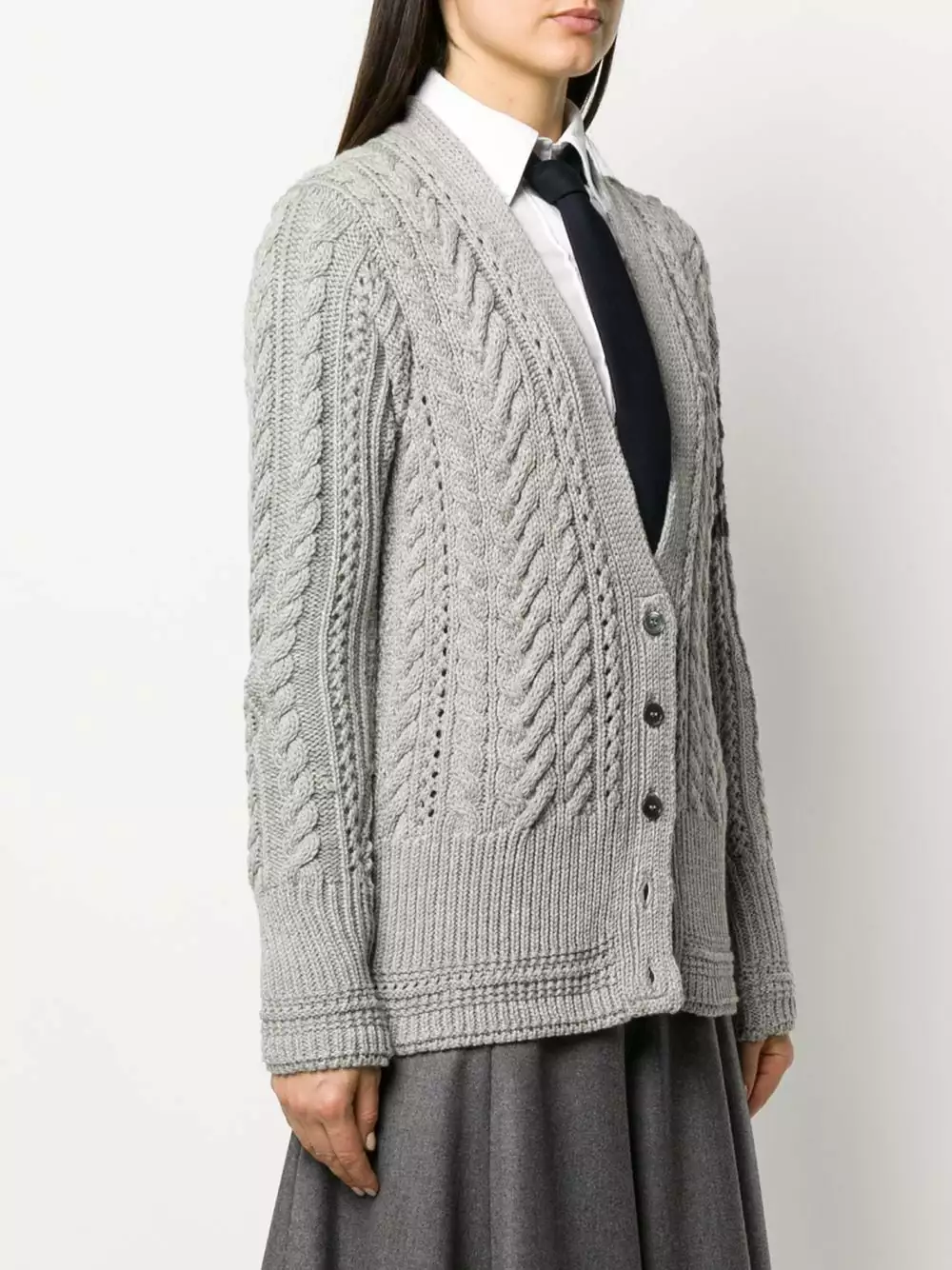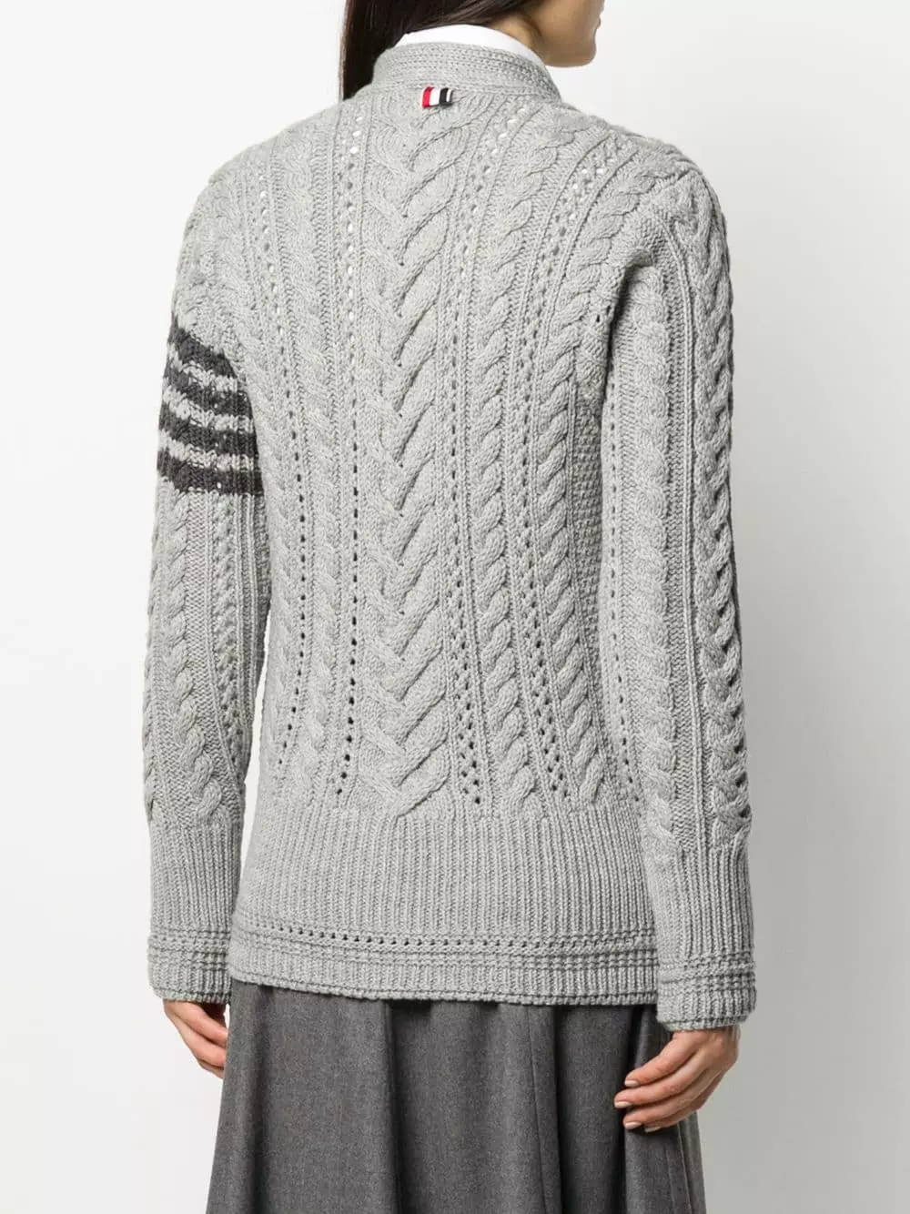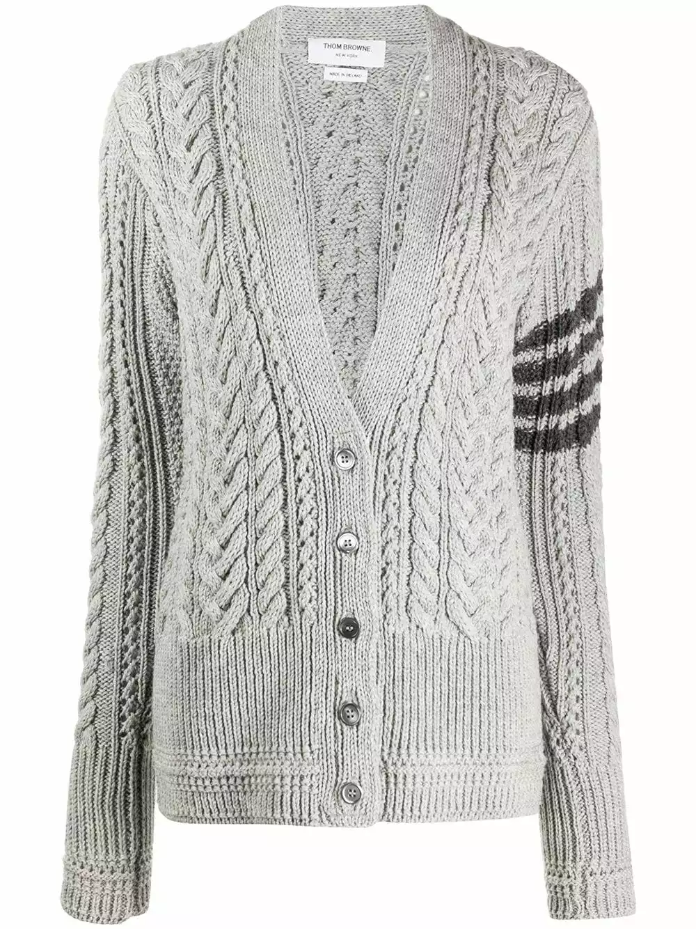 Knitted cardigans are a timeless style. Comfortable, stylish and super easy to match with pretty much everything, this light grey merino 4-Bar Aran cable knit cardigan from Thom Browne is an essential piece. Simple, but so classy. Featuring a deep V neck, a front button fastening, an Aran knit, a stripe detail to the side, long sleeves, a ribbed hem and cuffs and a fitted silhouette.