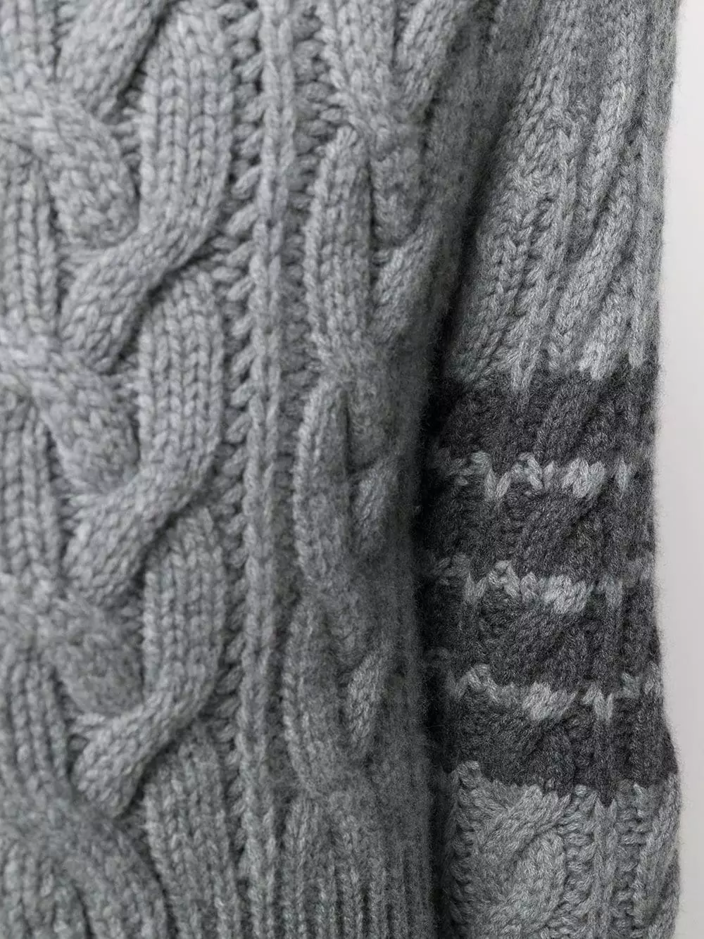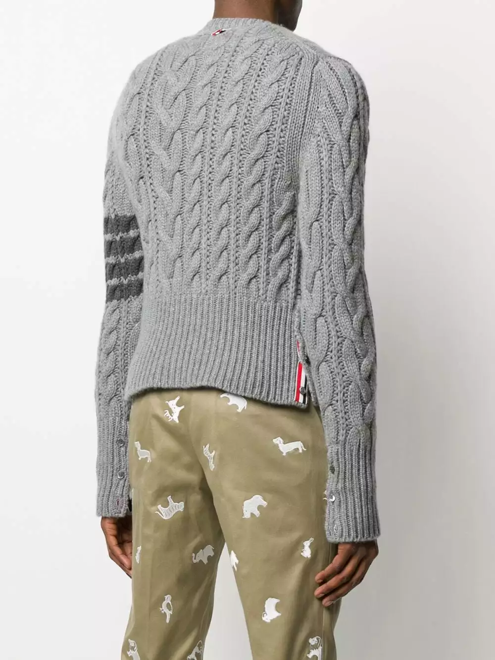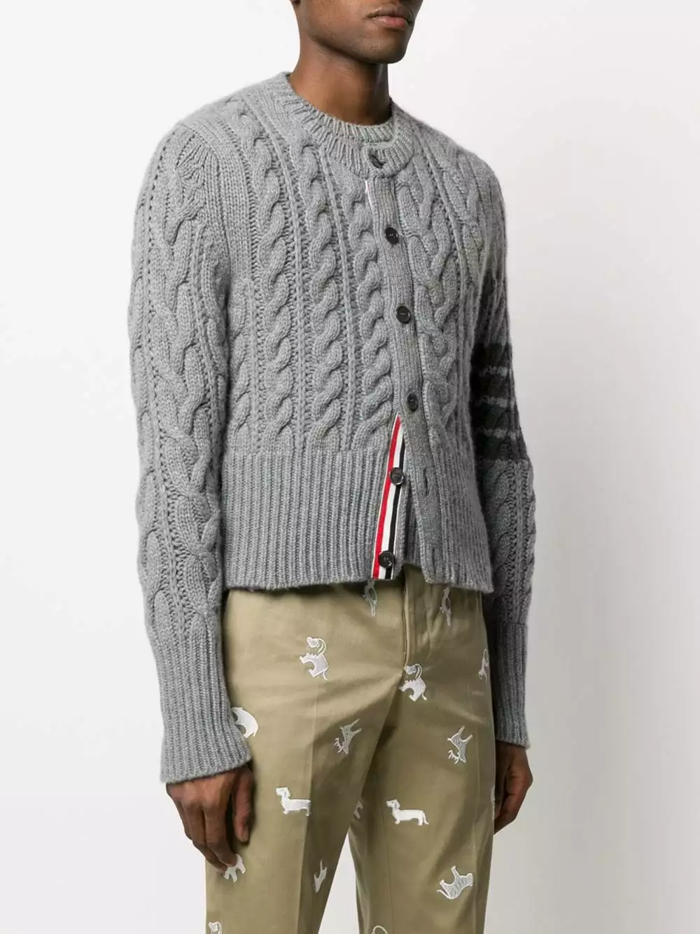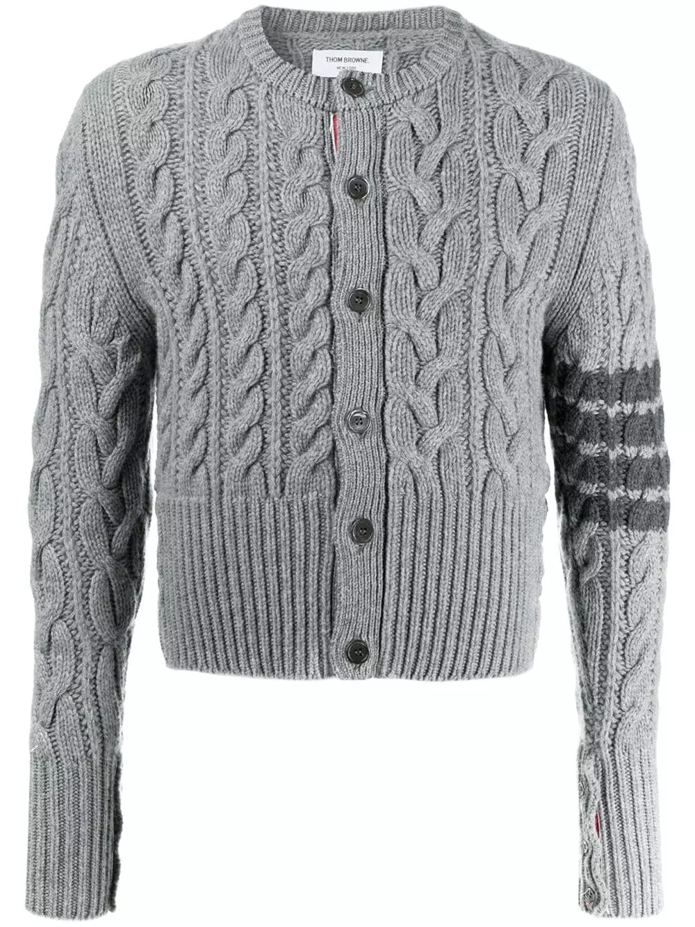 Thom Browne shows us the power of the chunky knit with this Aran cable-knit cardigan. Made from cashmere, this textured piece has been designed with the recognisable 4-Bar stripes to the left sleeve and a signature tricolour striped trim. Stylish and cosy? We’ll take it!