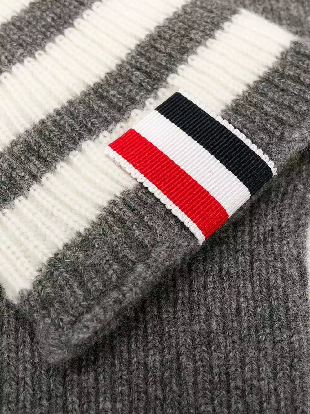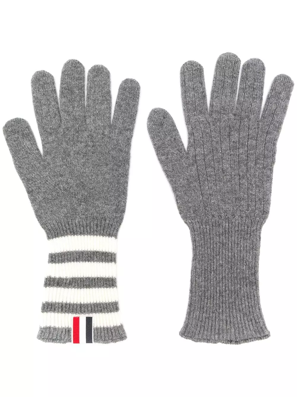 Grey 4-bar Cashmere Gloves from Thom Browne featuring ribbed trimming, four bar stripes and tricolour grosgrain trim to the rear.
