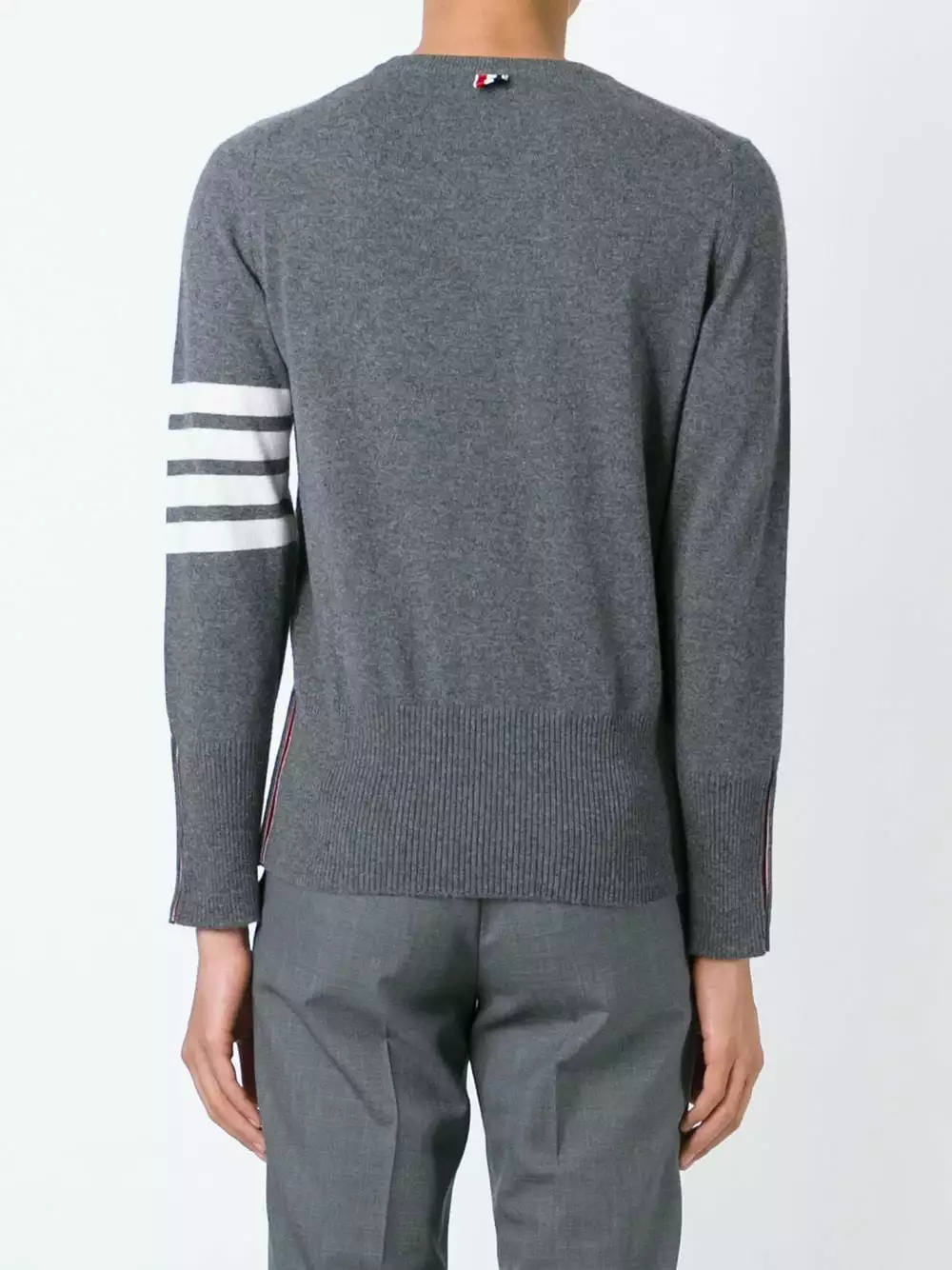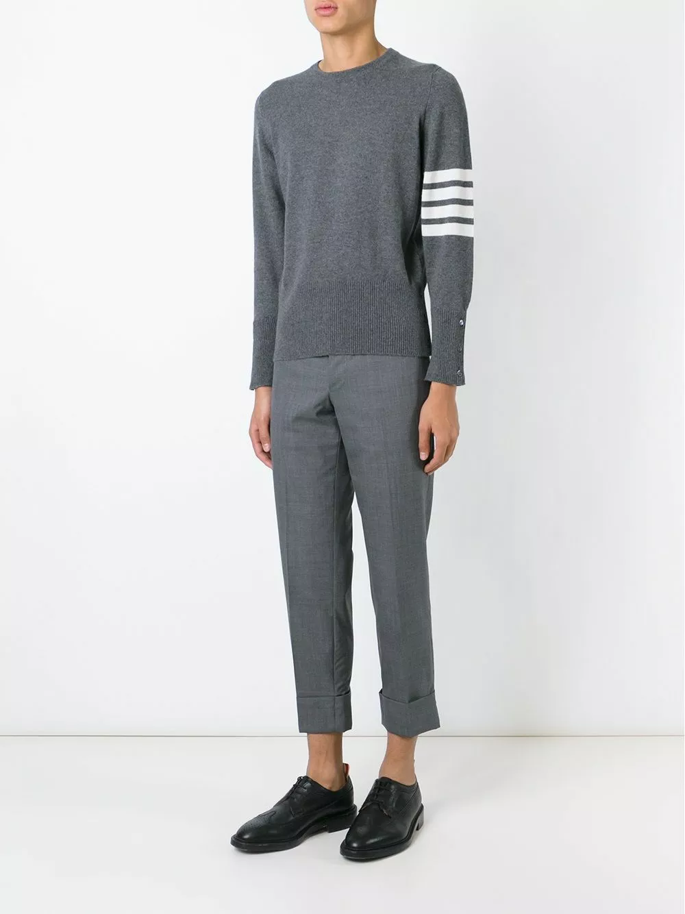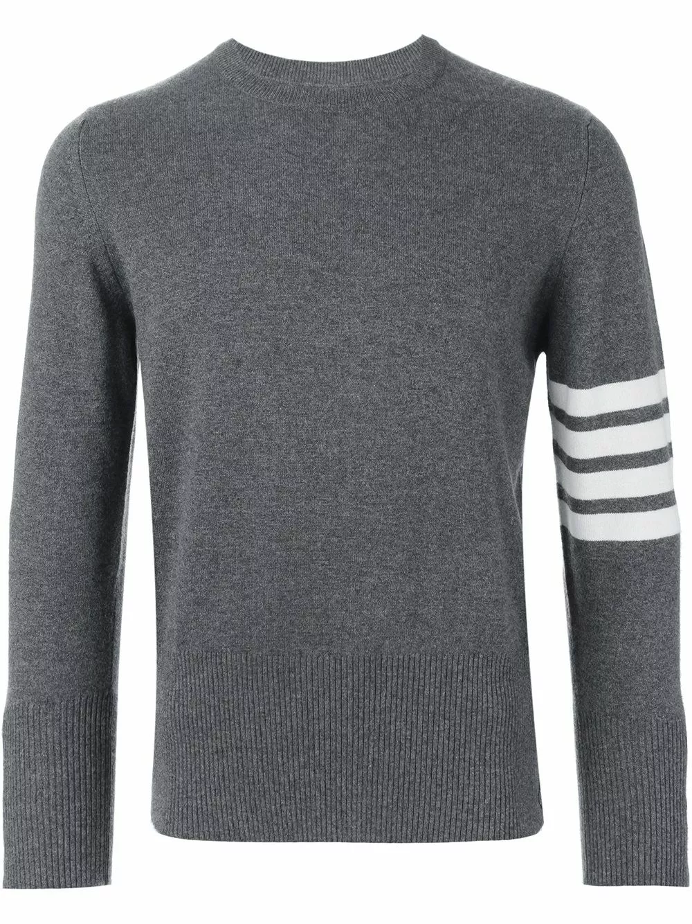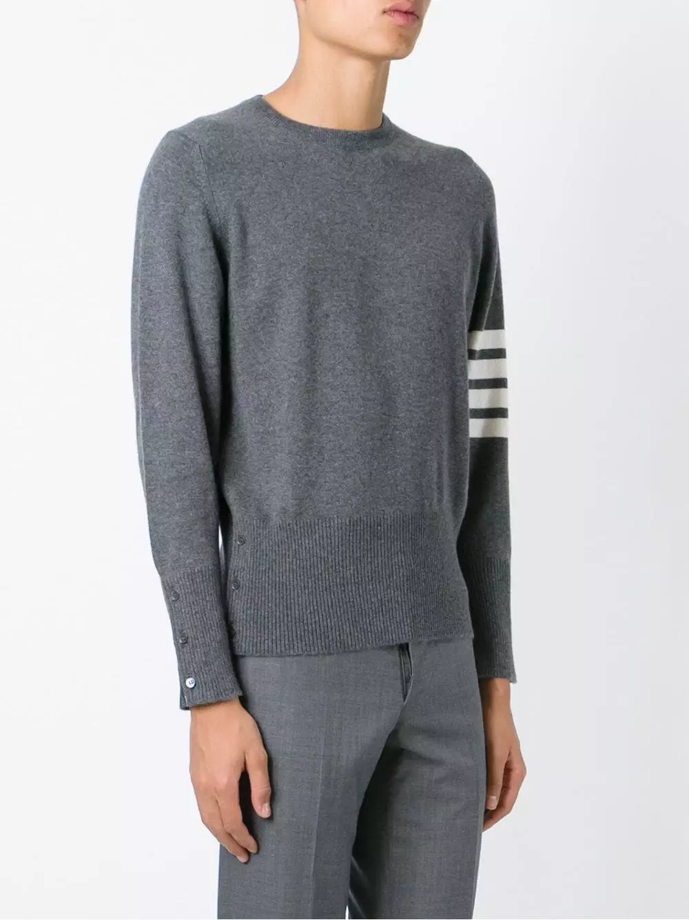 4-Bar Cashmere Pullover from Thom Browne featuring a cashmere knit, a round neck, long sleeves, decorative buttons and white stripes on the left sleeve. This item is true to fit.