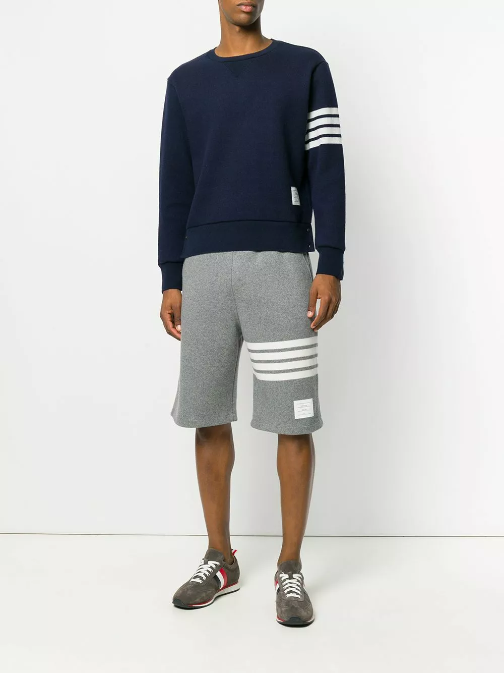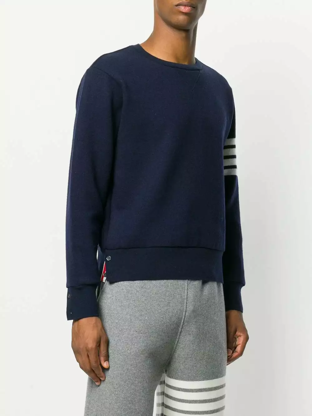 Navy blue 4-Bar Cashmere Shell Sweatshirt from Thom Browne featuring a crew neck, long sleeves, button cuffs, a front logo patch, an elasticated hem, a relaxed fit, buttoned side slits and four white stripes to the left sleeve.