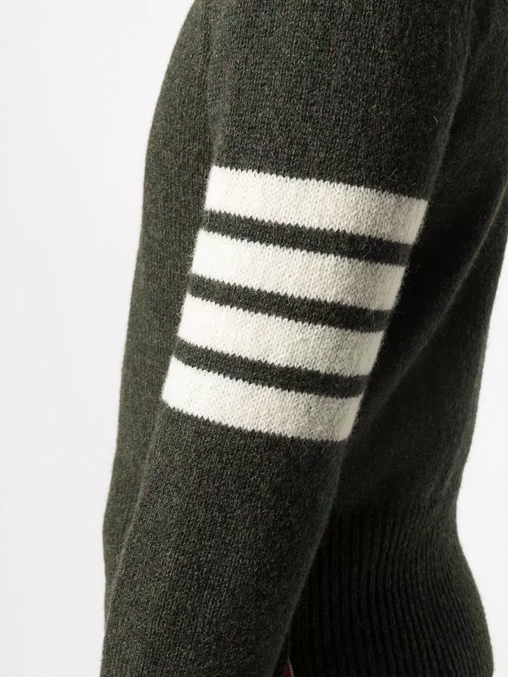 A preppy piece that packs a punch. In a dark green hue and wool construction, this jumper from Thom Browne boasts a 4-Bar motif design and chunky knit. Baby it’s cold outside, so wrap up in Thom Browne.