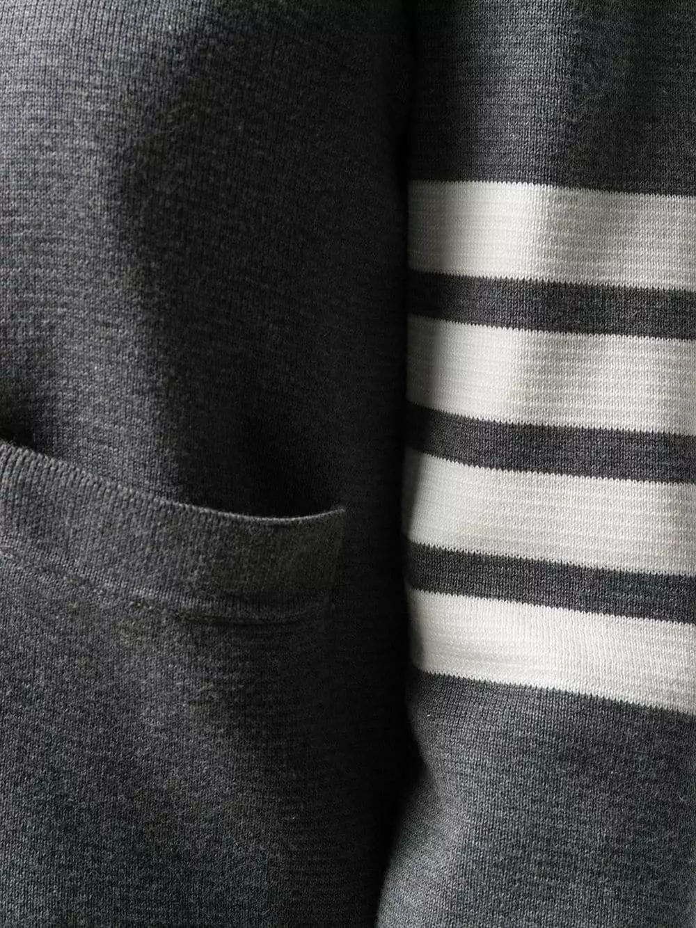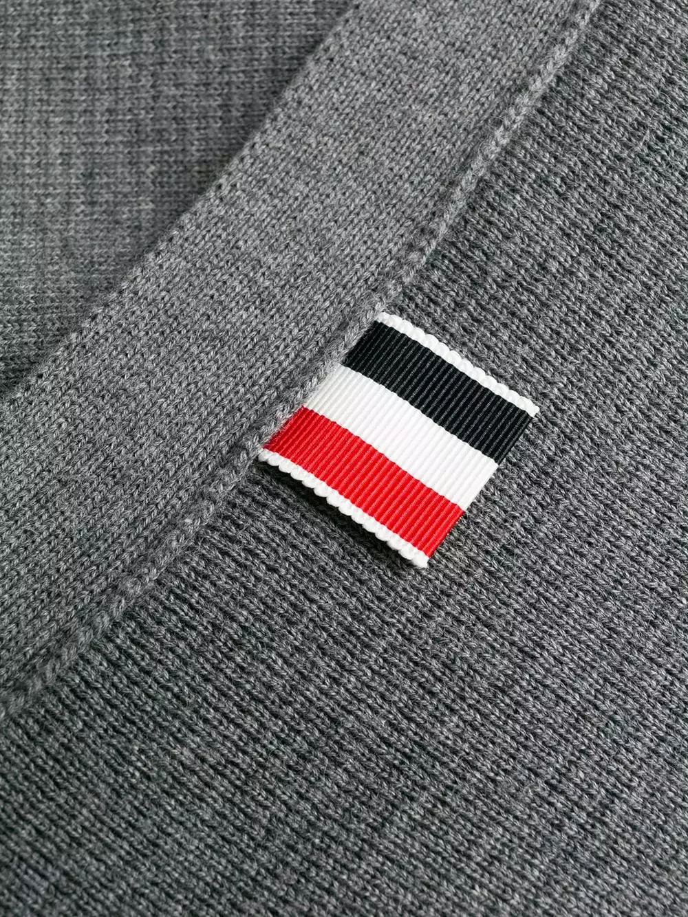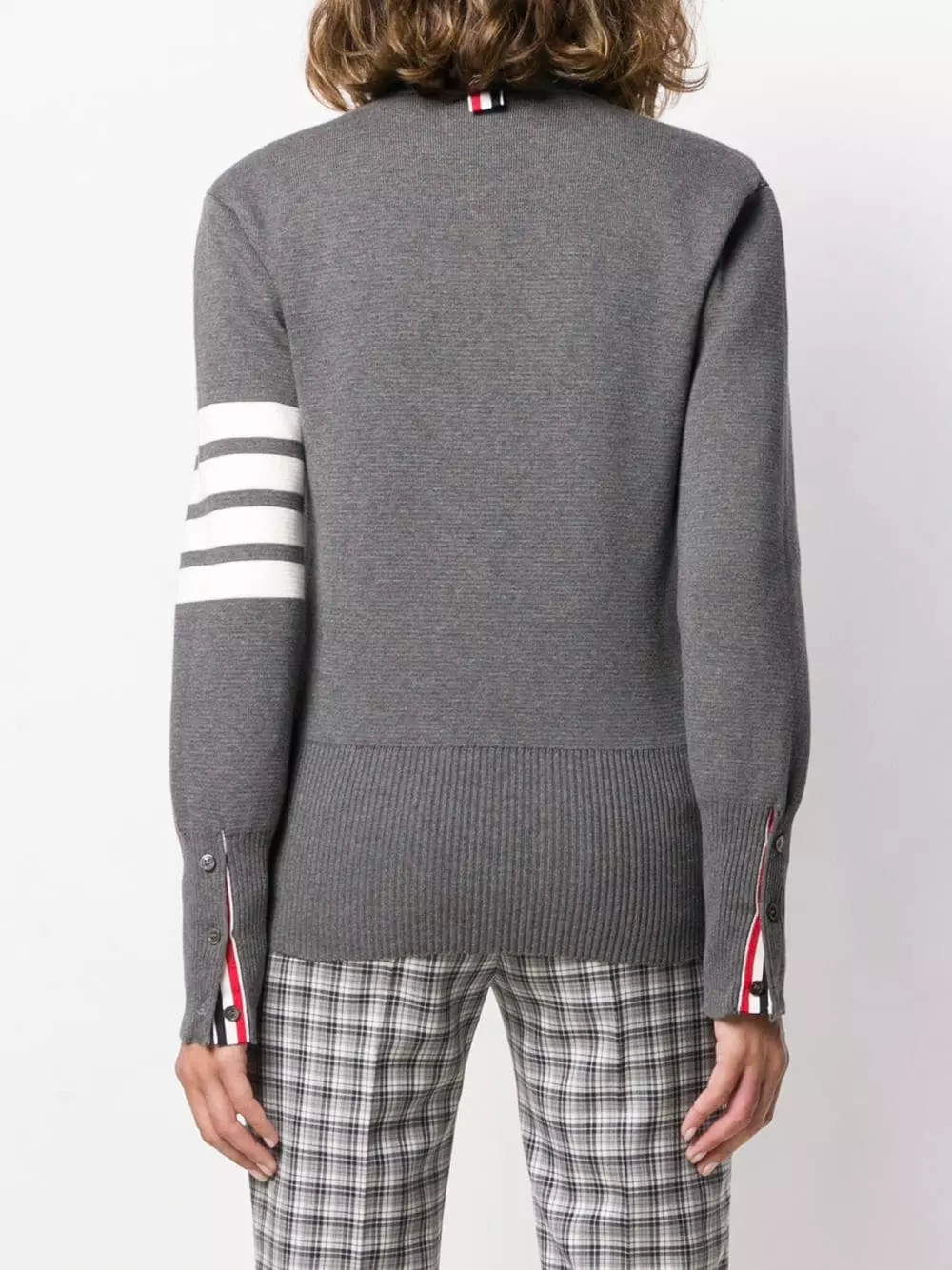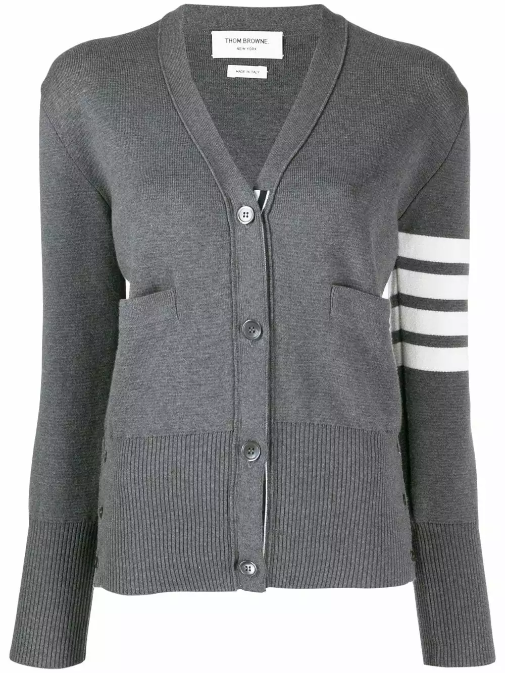 Your old school uniform could never… Thom Browne gives preppy style a grown-up twist with RWB details and a 4-Bar stripe here. And this cardigan doesn’t even come with homework. Featuring a v-neck, long sleeves, a front button fastening, patch pockets, a ribbed hem and cuffs, button cuffs, a side button fastening, a signature grosgrain loop tab, a 4-Bar stripe and RWB details.