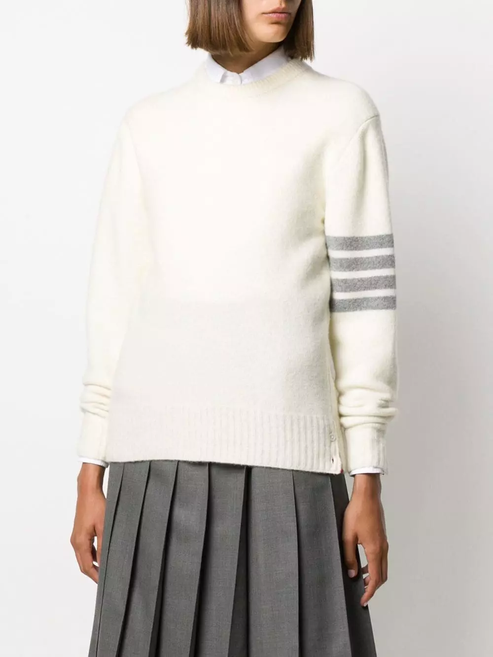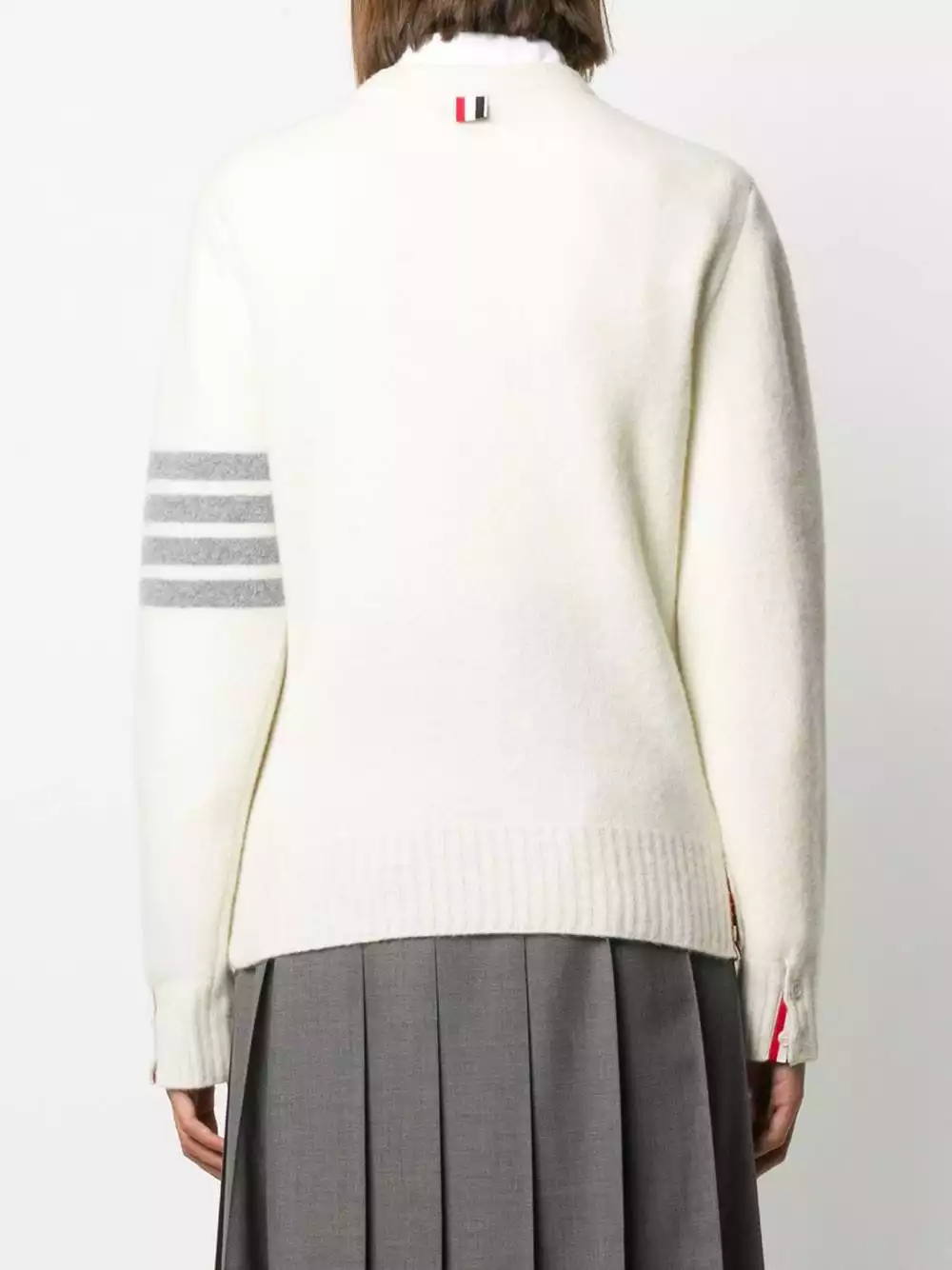 You’ve already got a soft spot for Thom Browne’s designs. Layer up in the latest 4-Bar crew neck jumper. Crafted from a cashmere-wool blend, it features long sleeves and a signature tricolour stripe tab. Sport sophistication comfortably.