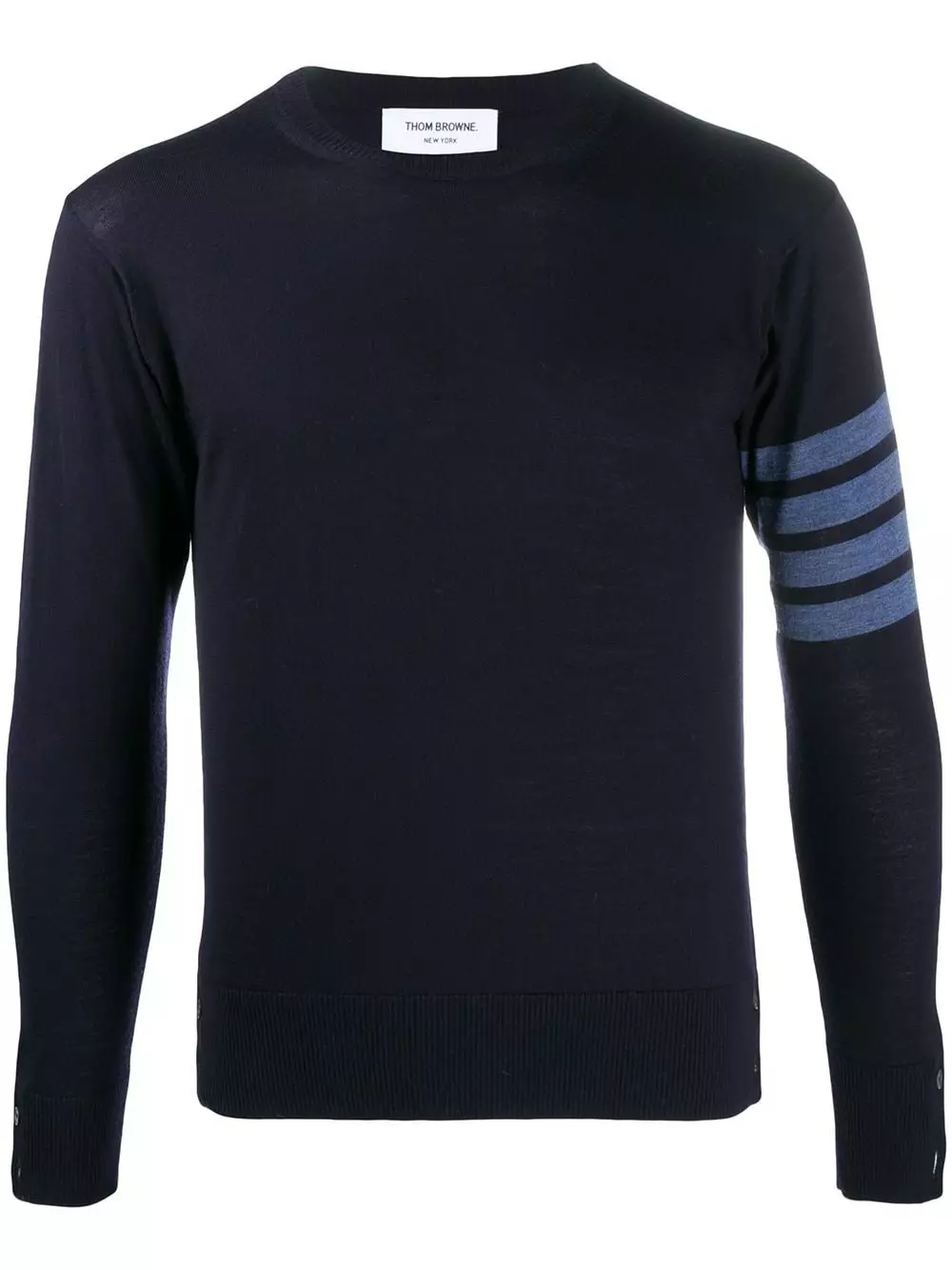 Get ready to meet your new favourite sweater. Fashioned from a navy fine merino wool, this slim fitting crew neck sweater is detailed with tri-colour striped trims and a 4-Bar motif to one sleeve. So classically Thom Browne.