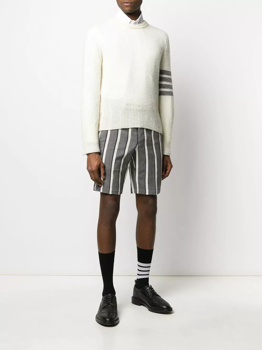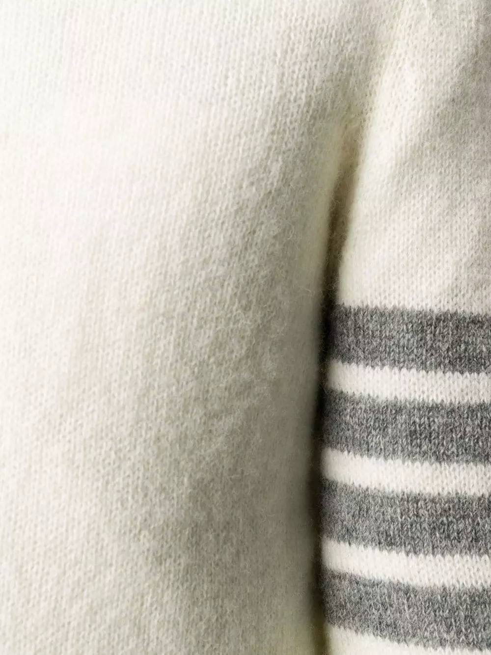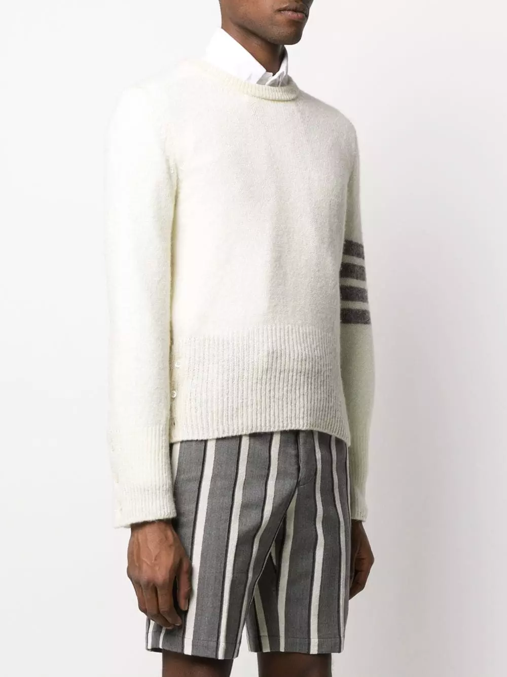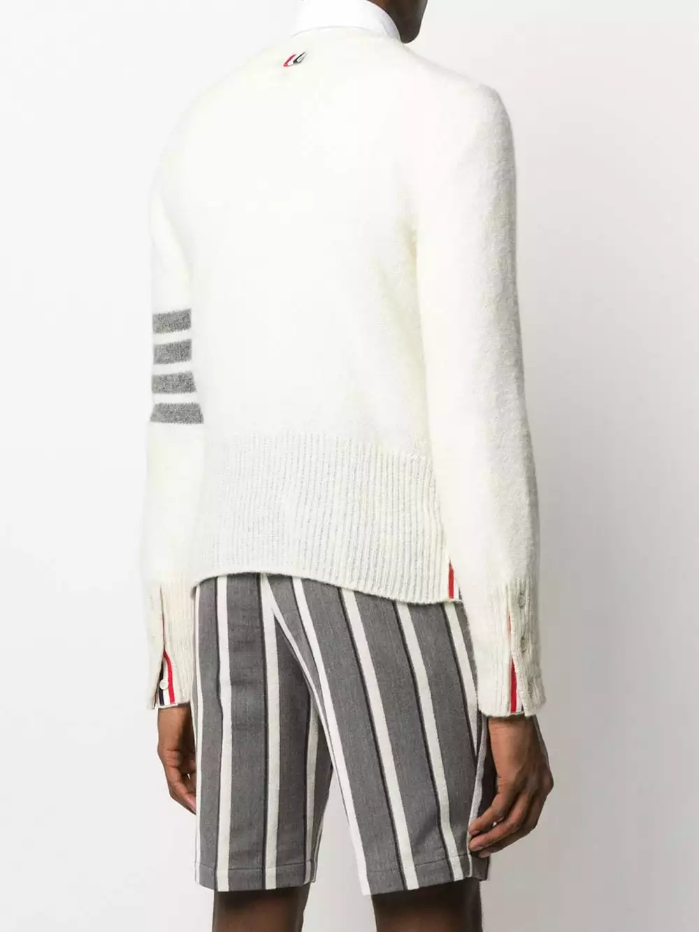 A white Shetland wool jumper is given the Thom Browne treatment. The designer applied its trademark 4-Bar stripes to the left sleeve. A brand staple. Featuring a ribbed crew neck, long sleeves, a stripe detail to the side, a ribbed hem and cuffs and button cuffs.