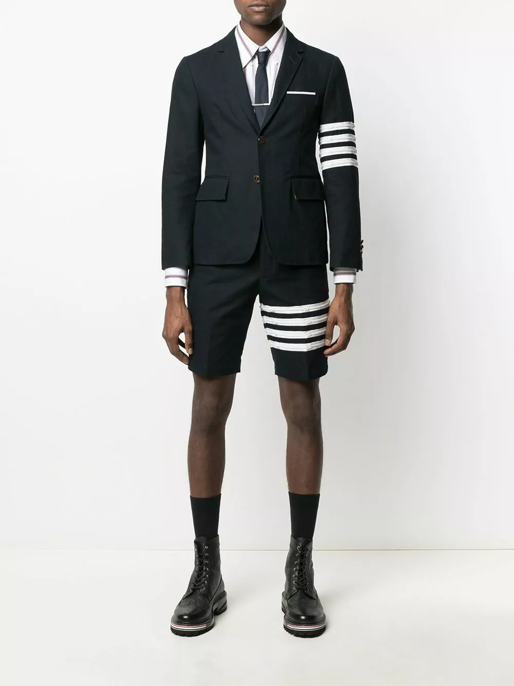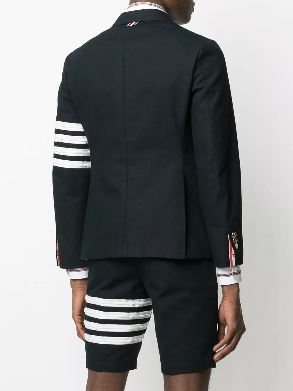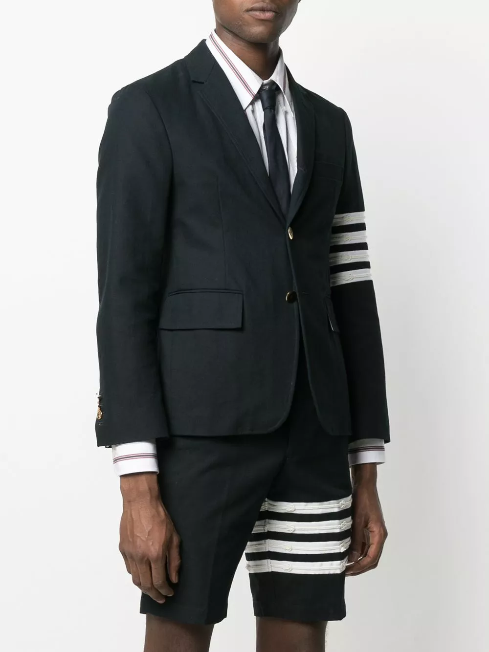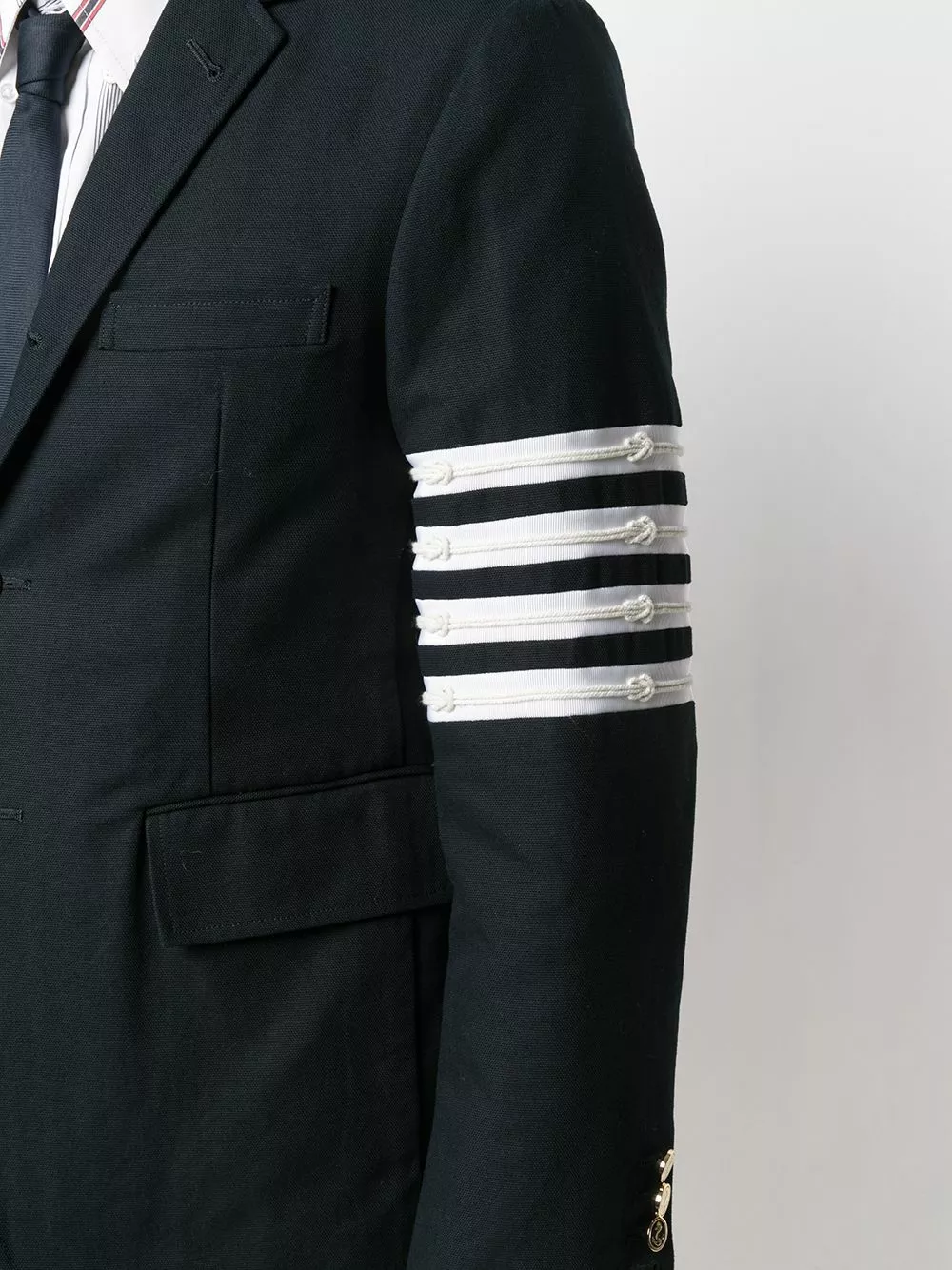 Smarten up. Show everyone you mean business with this navy blue blazer from Thom Browne. The signature 4-Bar stripe on the sleeve adds some extra coolness. Smart and cool, how about that?