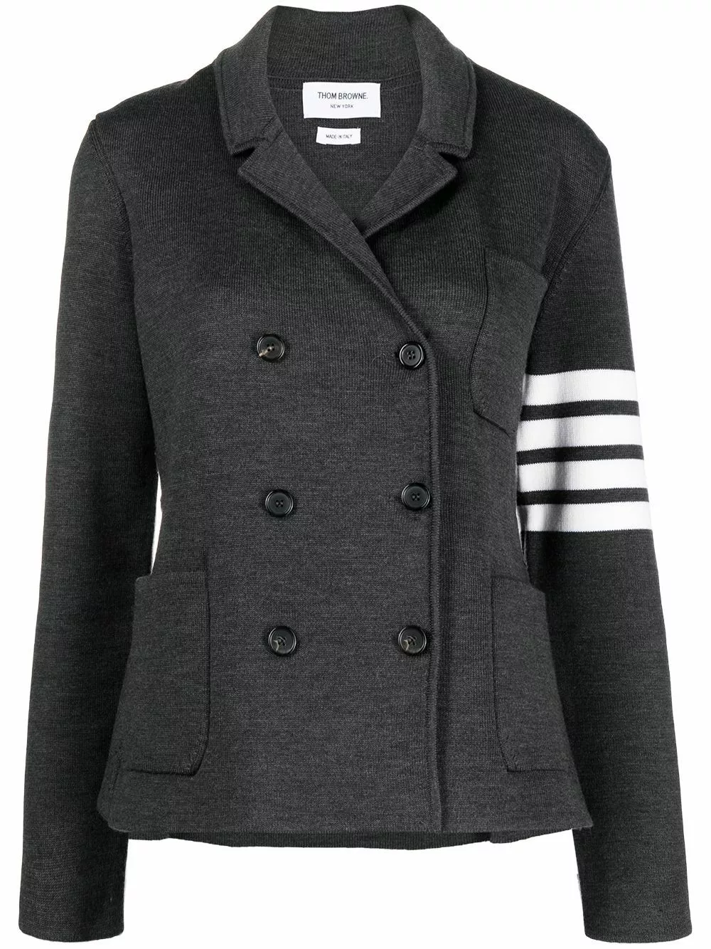 Known for its original take on classic silhouettes, Thom Browne uses high-quality materials to create perfectly crafted pieces with eye-catching details. This knitted jacket is woven from wool and embellished with a 4-Bar strap at the sleeve and a signature RWB tab at the back. It features a double-breasted fastening and a notched collar, adding structure and a tailored look to this casual interpretation of the blazer.
