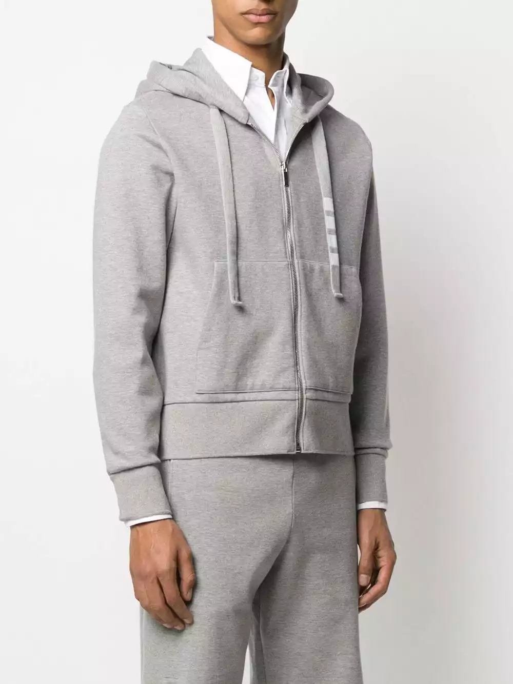 Update your sportswear with this zip hoodie from Thom Browne. Crafted in double-knit cotton, this light grey zip hoodie is detailed with a 4-Bar twill drawstring. The key is in the detail. Featuring a drawstring hood, long sleeves, a front zip fastening and a kangaroo pocket.