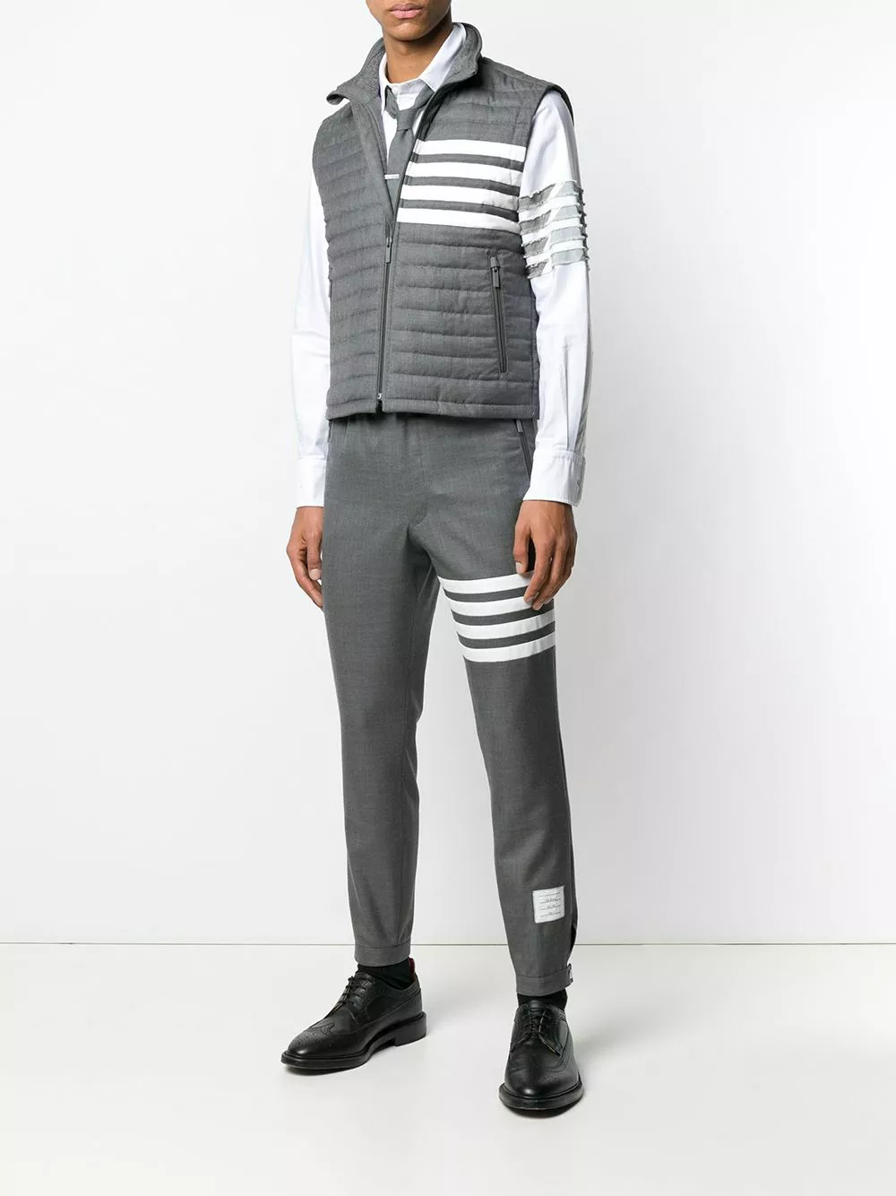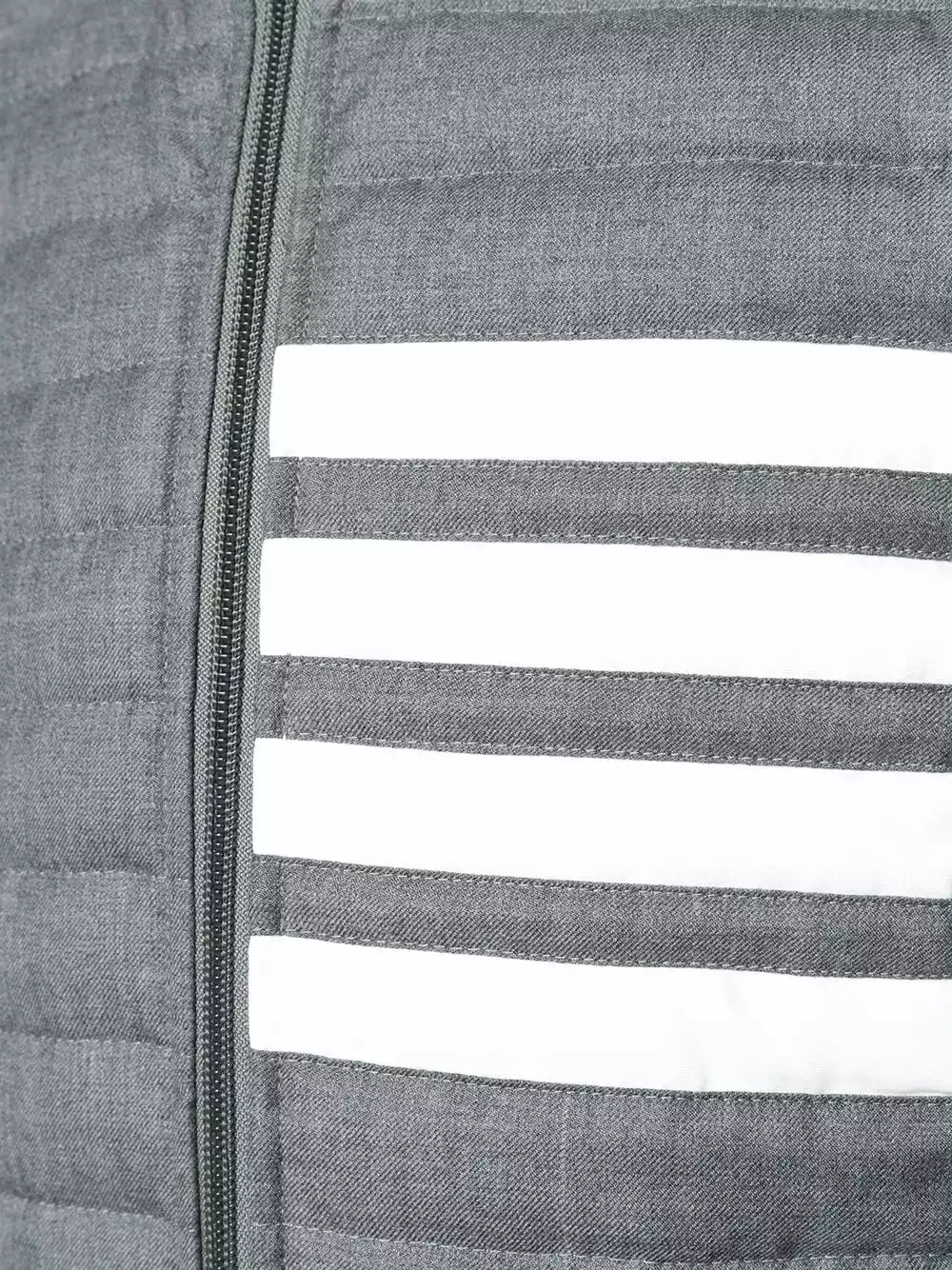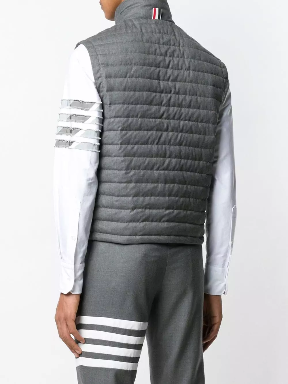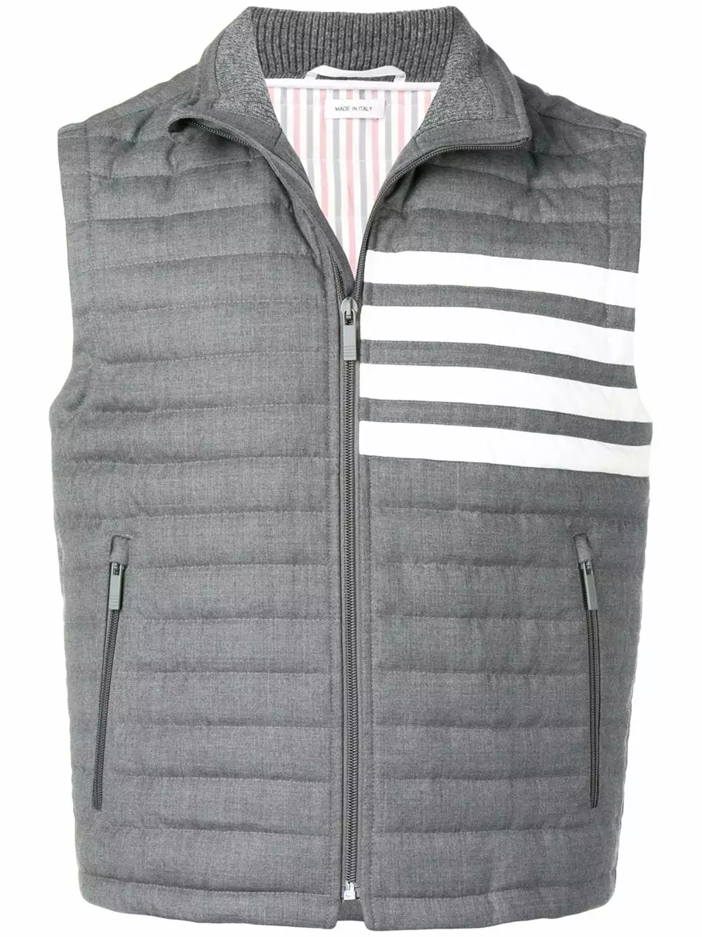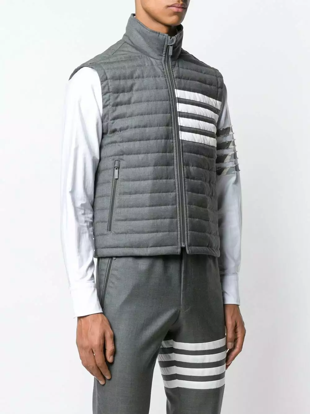 Thom Browne’s latest menswear collection saw a technicolour re-interpretation of archival preppy silhouettes, with the American label boldly pushing the boundaries through garish prints and surreal proportions. This medium grey feather down vest features a funnel neck, a sleeveless design, a front zip fastening, side zipped pockets and signature quadruple white stripes.