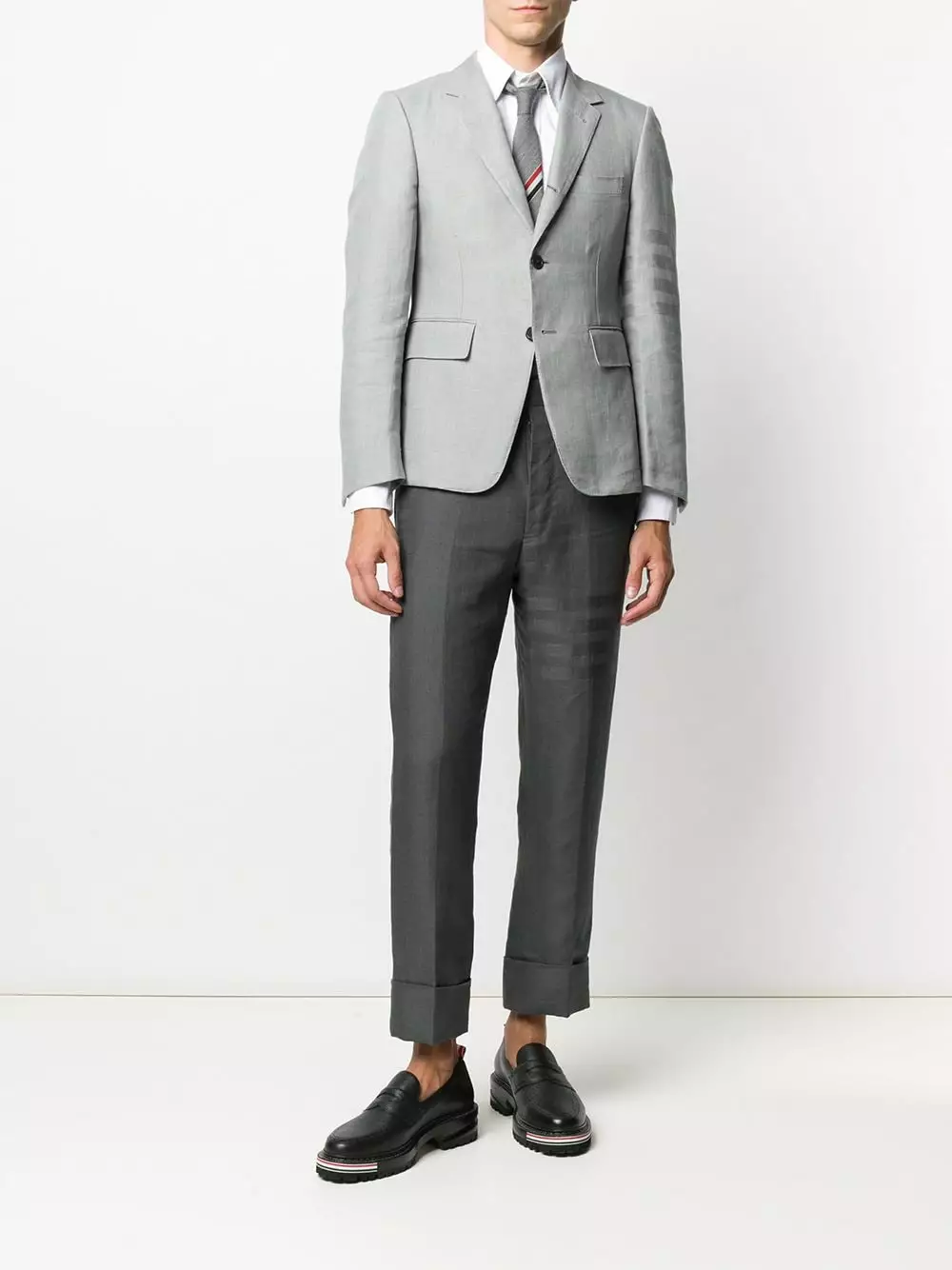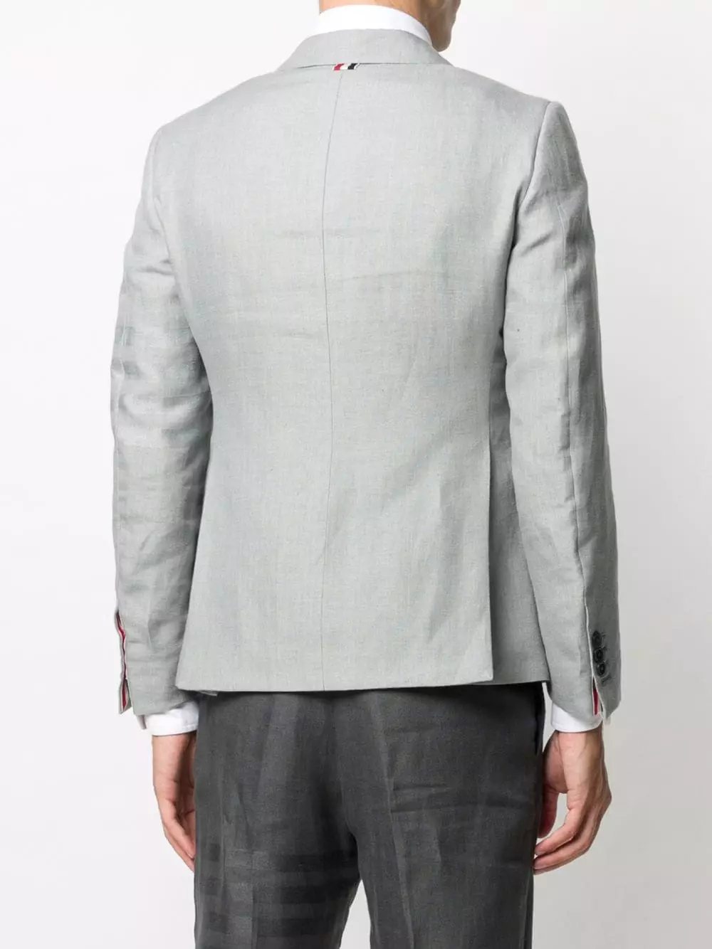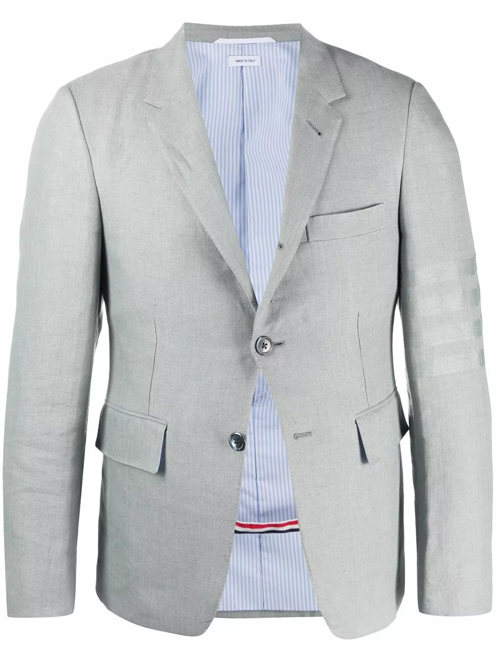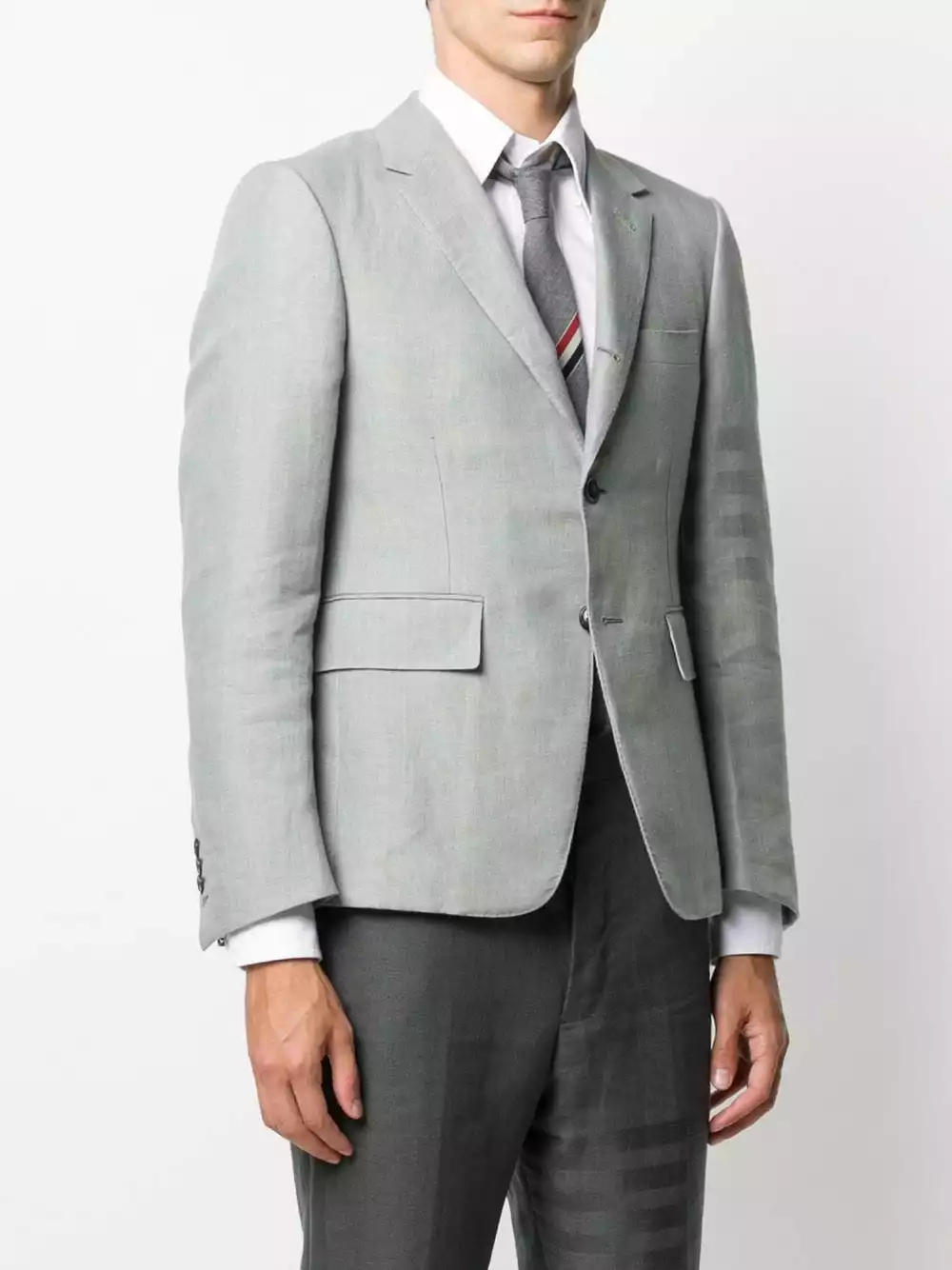 Classic and timeless. Every wardrobe deserves a trusty blazer, so why not make sure you have this 4-bar engineered blazer from Thom Browne. Crafted from light-grey linen, the tailored fit is finished with a signature 4-Bar logo stripe on the arm for added charm.