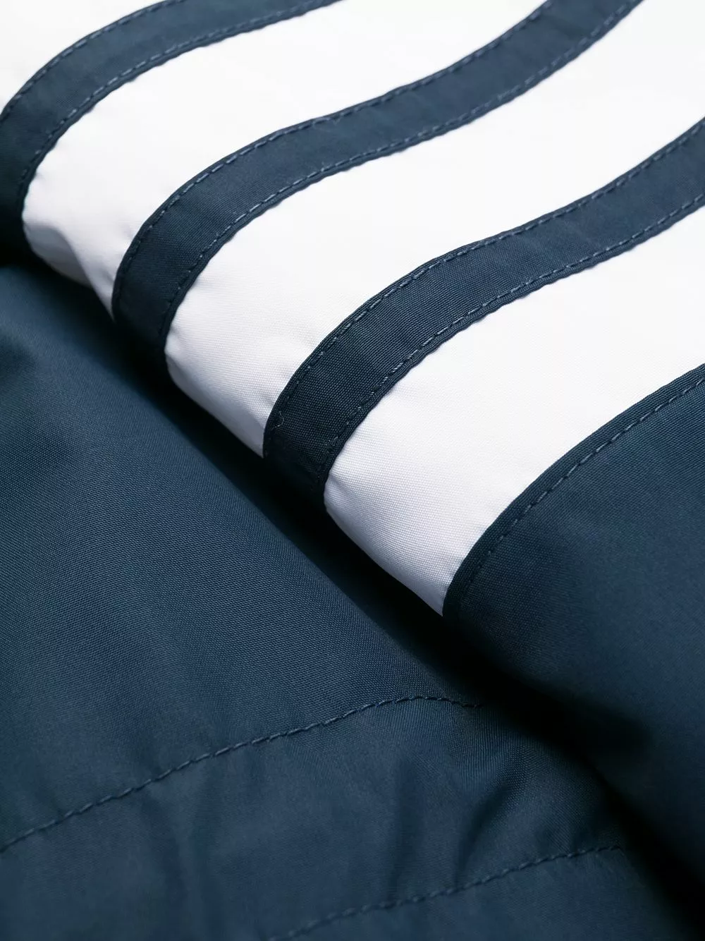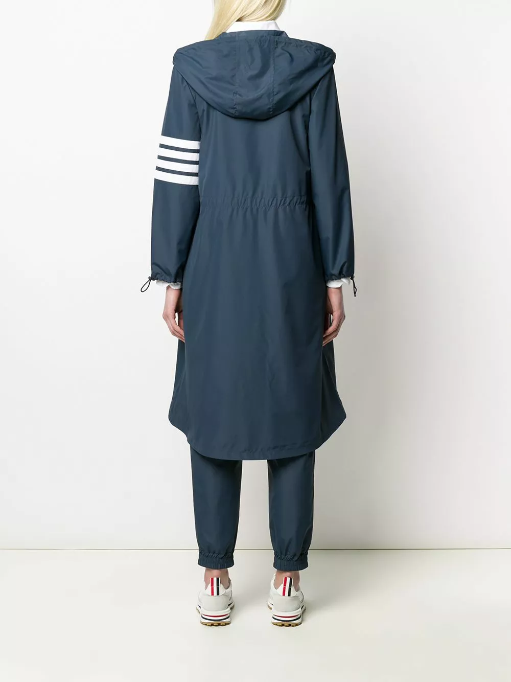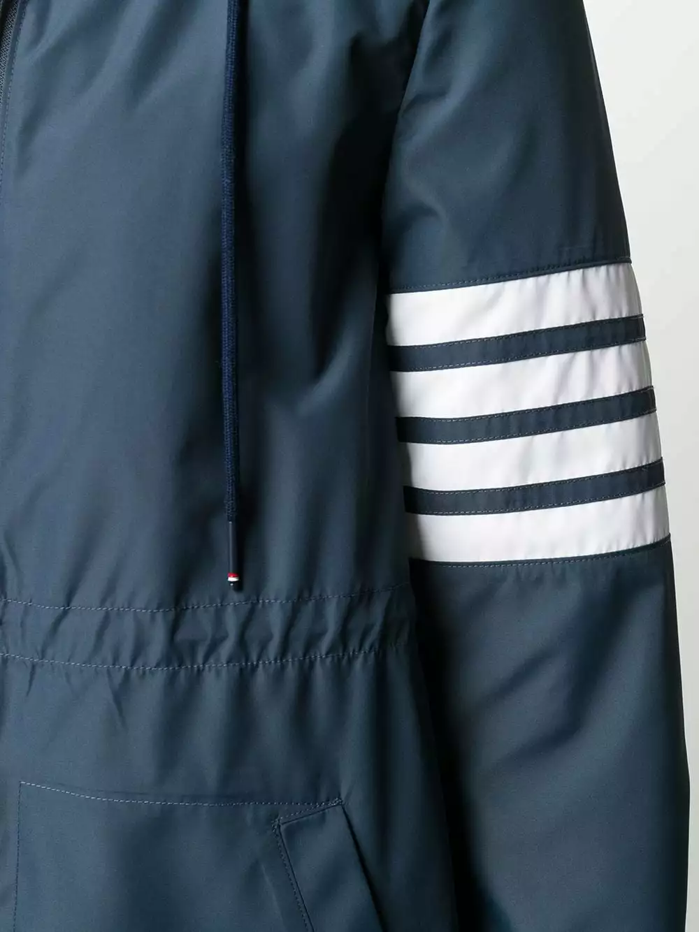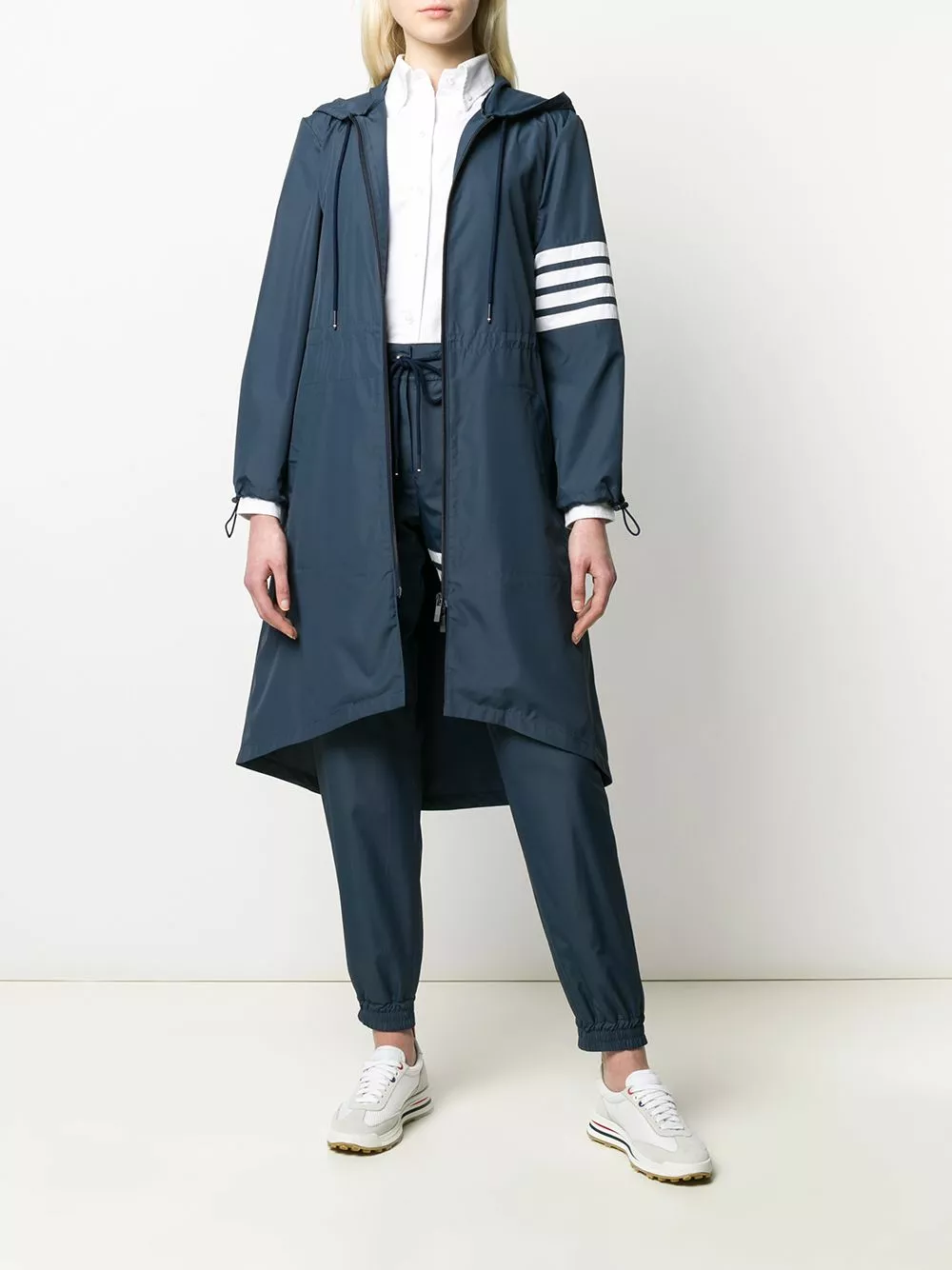 A sporty look with an elegant finish – that’s something only Thom Browne can achieve. Crafted in navy blue, this Thom Browne flyweight tech hooded parka has the signature four-bar stripe on the arm and an elongated back hem. Featuring an a-line shape, a lightweight construction, a signature tri-colour striped trim, a drawstring hood, an invisible front zip fastening, long sleeves, a drawstring waist, two front pockets, a full lining, a four-bar stripe detail, drawstring cuffs and an elongated back hem.