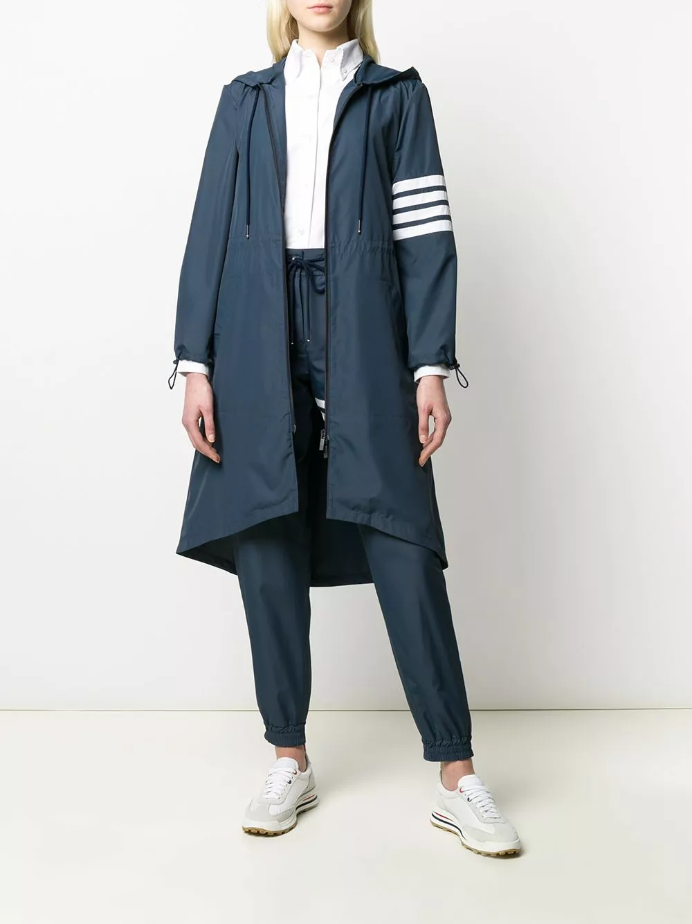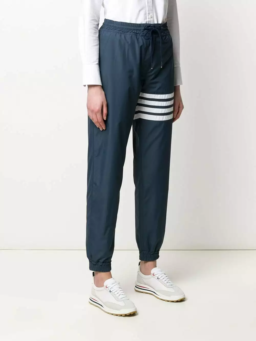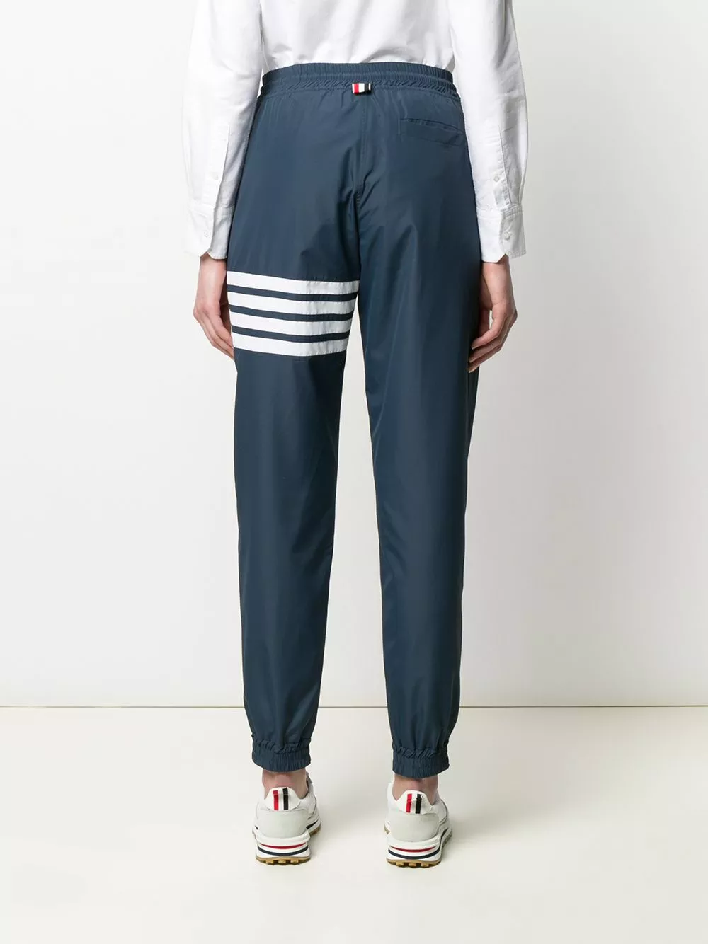 Teams are built on courage and trust – and if you’re lucky, they become friends too. Made from navy blue, these track pants with 4-bar in flyweight tech from Thom Browne makes us feel lucky for having built that with you. Tag team, baby! Featuring an elasticated drawstring waist, a back pocket, gathered ankles, a tricolour grosgrain tab on the rear and contrasting white four-bar stripes.