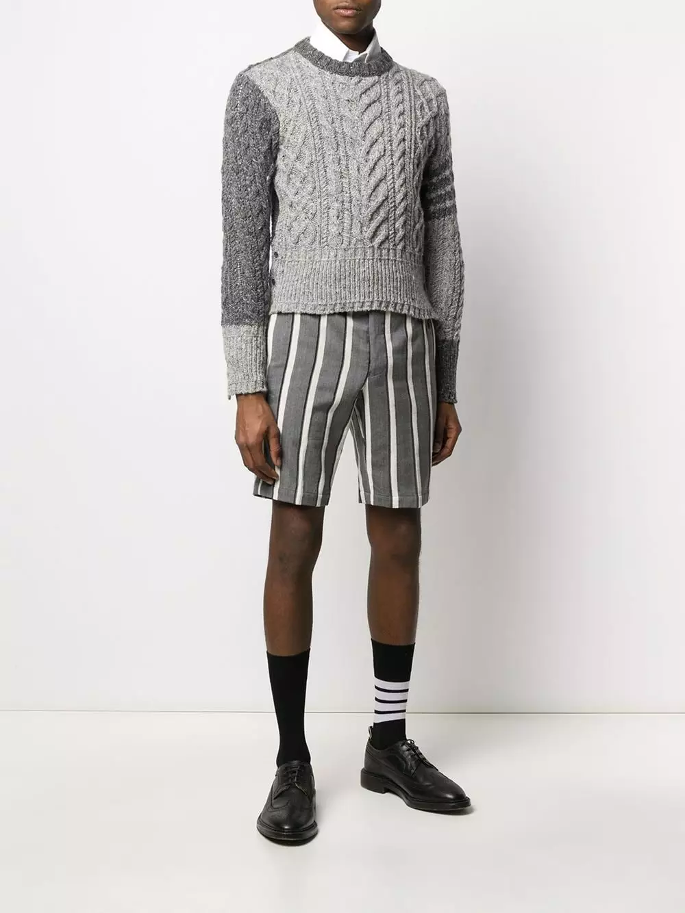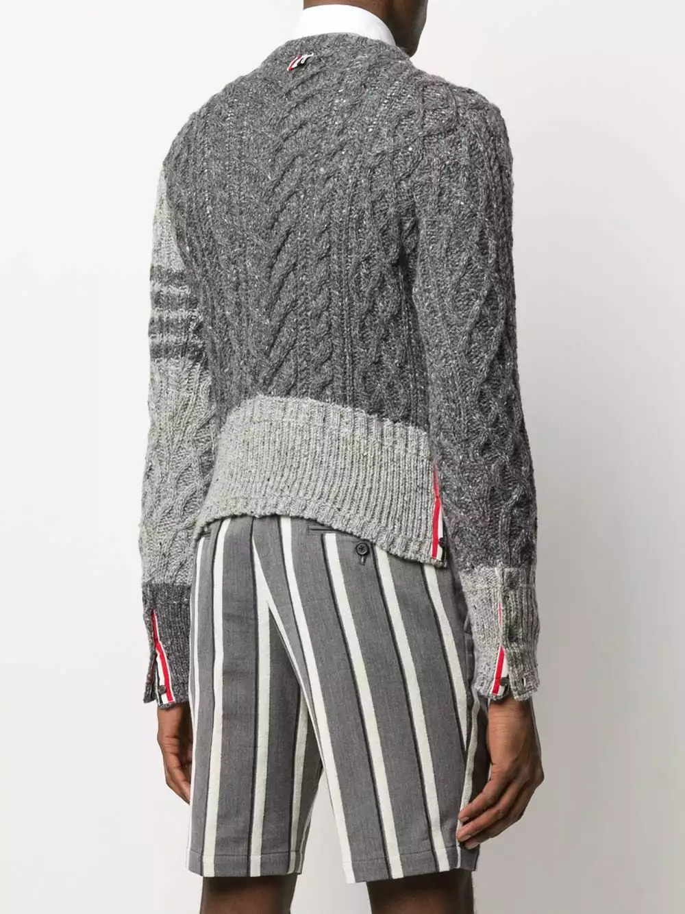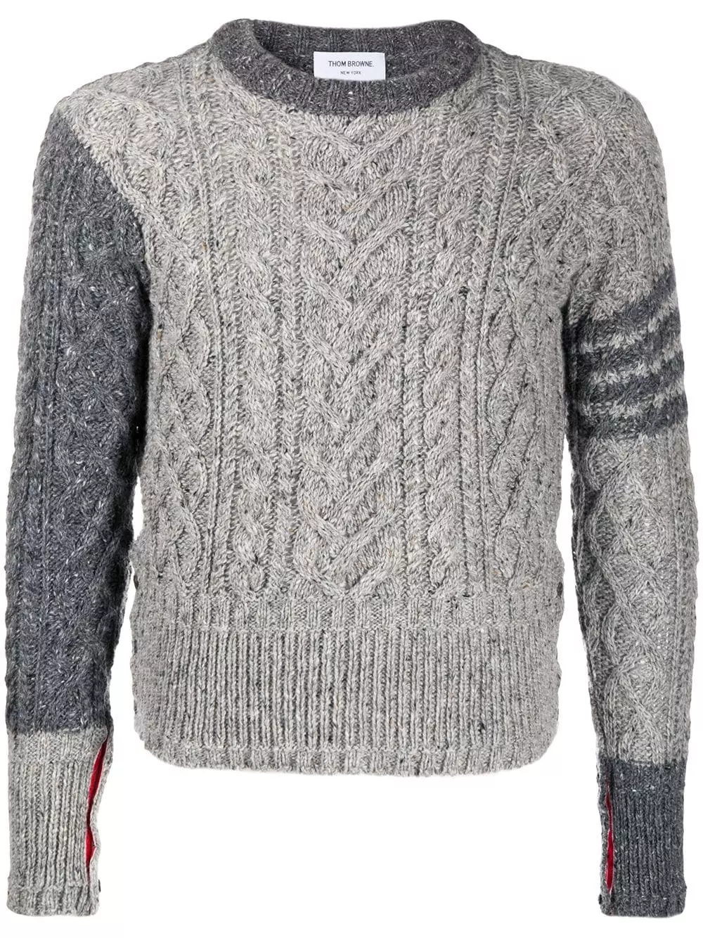 Thom Browne shows us the power of the chunky knit with this Aran cable-knit jumper. Made from a mohair and wool blend, this textured piece has been designed with the recognisable 4-Bar stripes to the left sleeve and a signature tricolour striped tab. Stylish and cosy? We’ll take it!