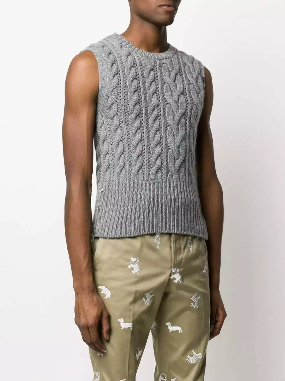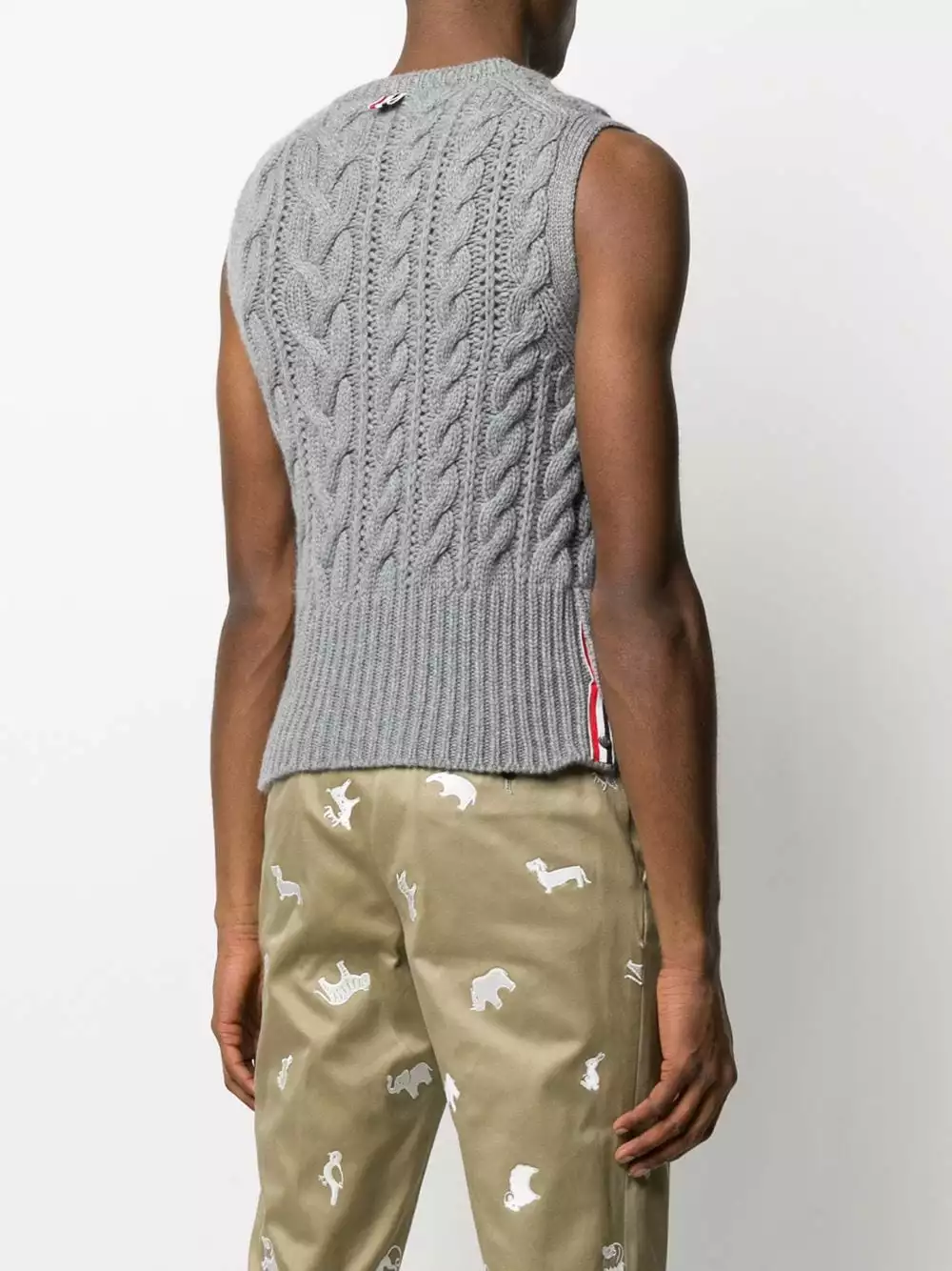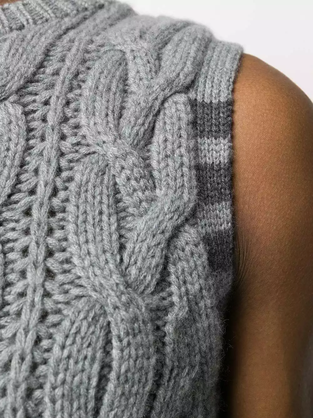 And you thought sweater-vests were just worn by Chandler Bing in Friends? How wrong you were. Crafted from cashmere, this Aran cable knit vest from Thom Browne is detailed with the signature 4-Bar Stripe to the left arm cuff to make it instantly distinguishable. Those who know, will know.