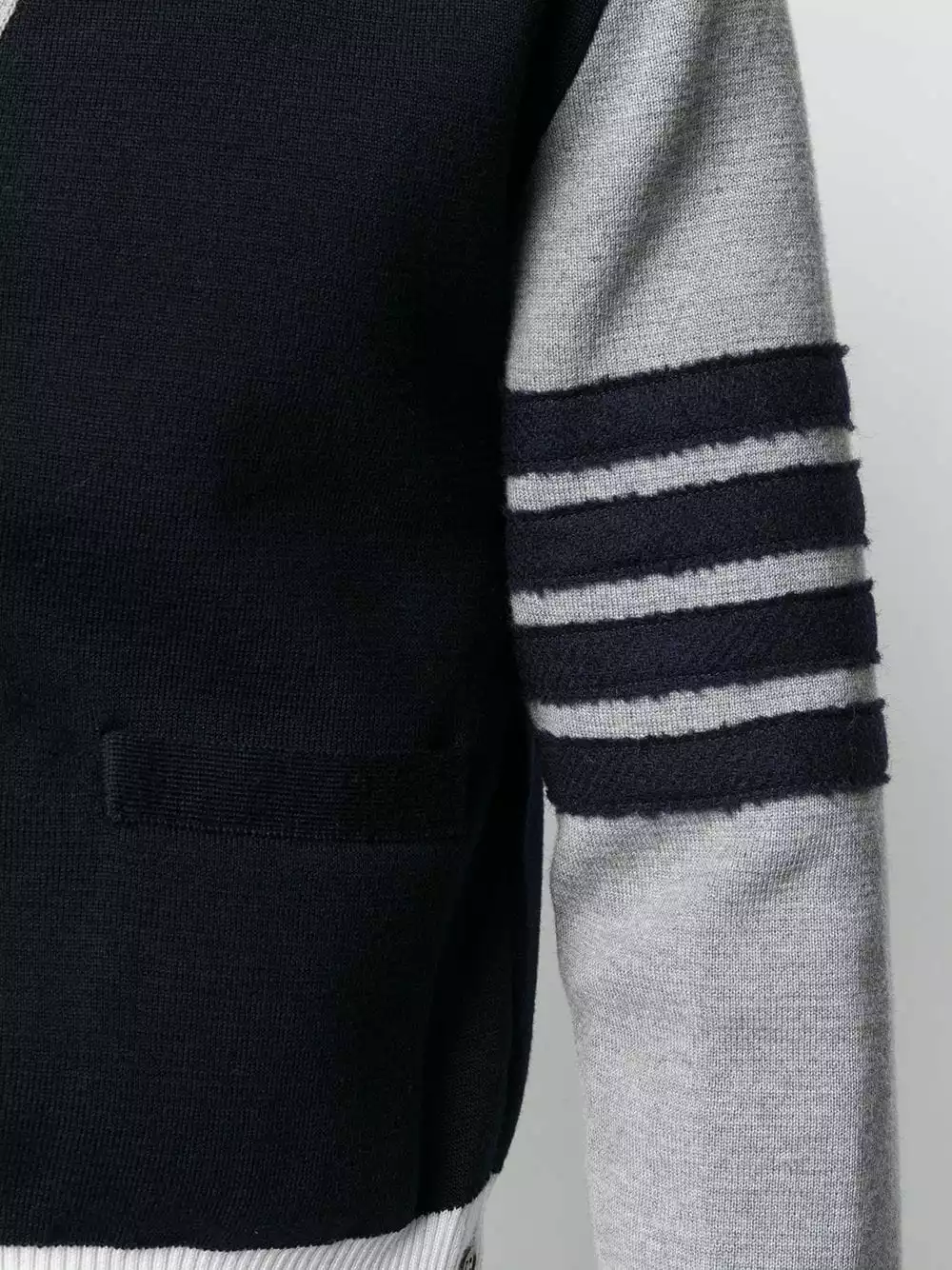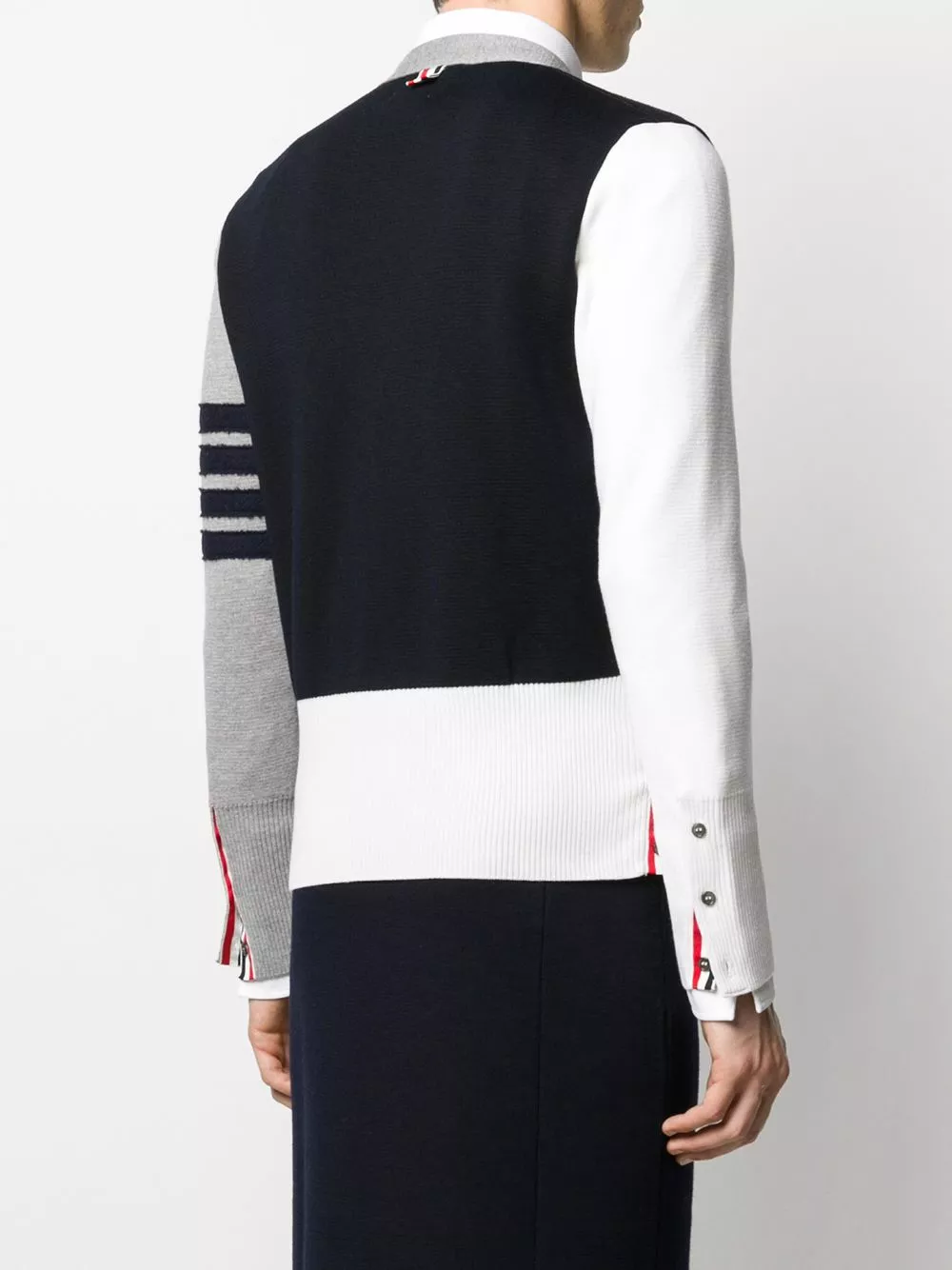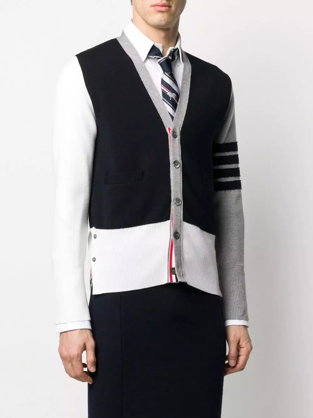 Versatile and comfortable, what else would you want? This blue, white and grey 4-bar merino cardigan from Thom Browne makes dressing in the morning an easy feat. Even before your morning coffee. Featuring a v-neck, a front button fastening, a side button fastening, long sleeves and a ribbed hem and cuffs.