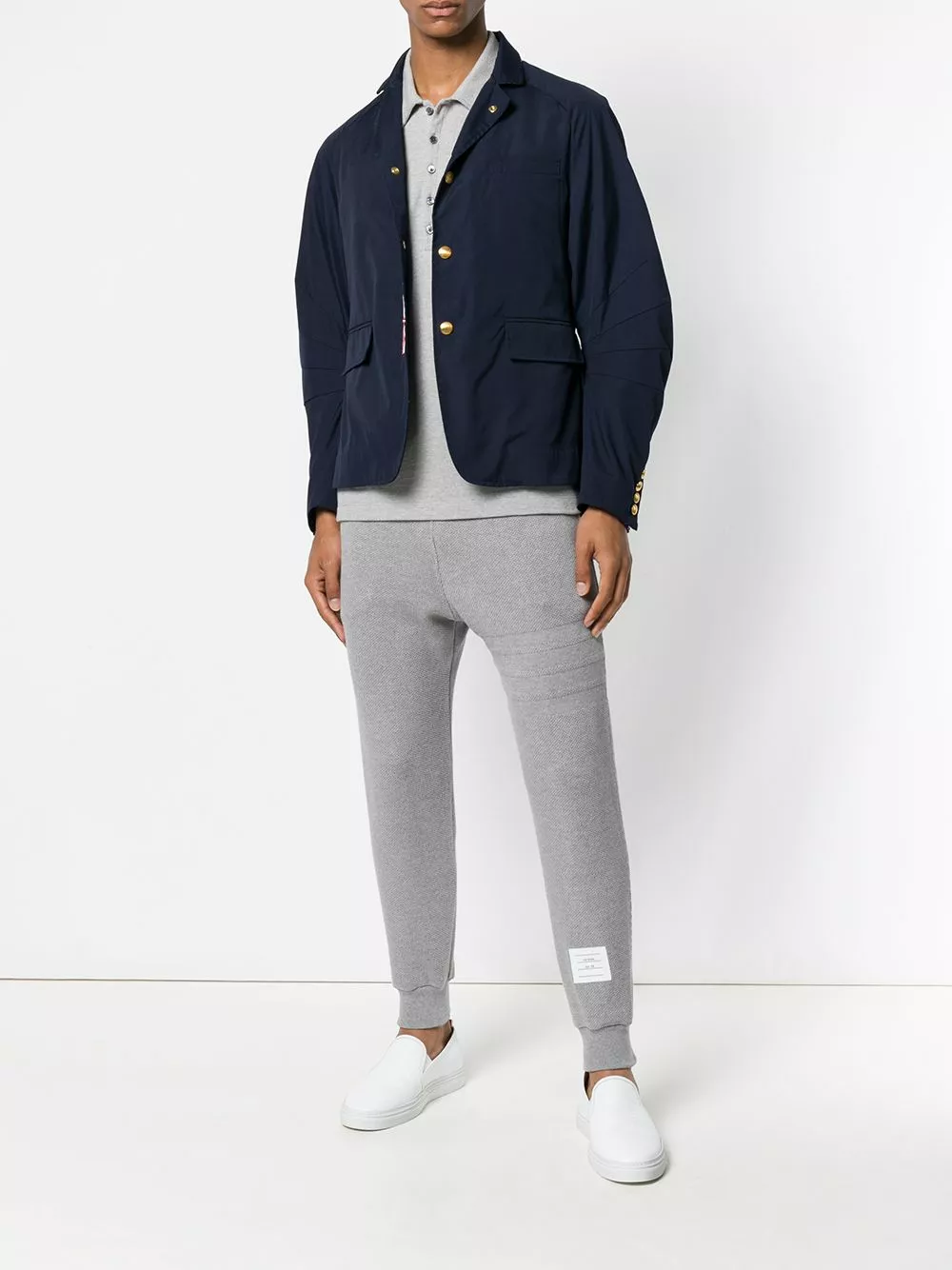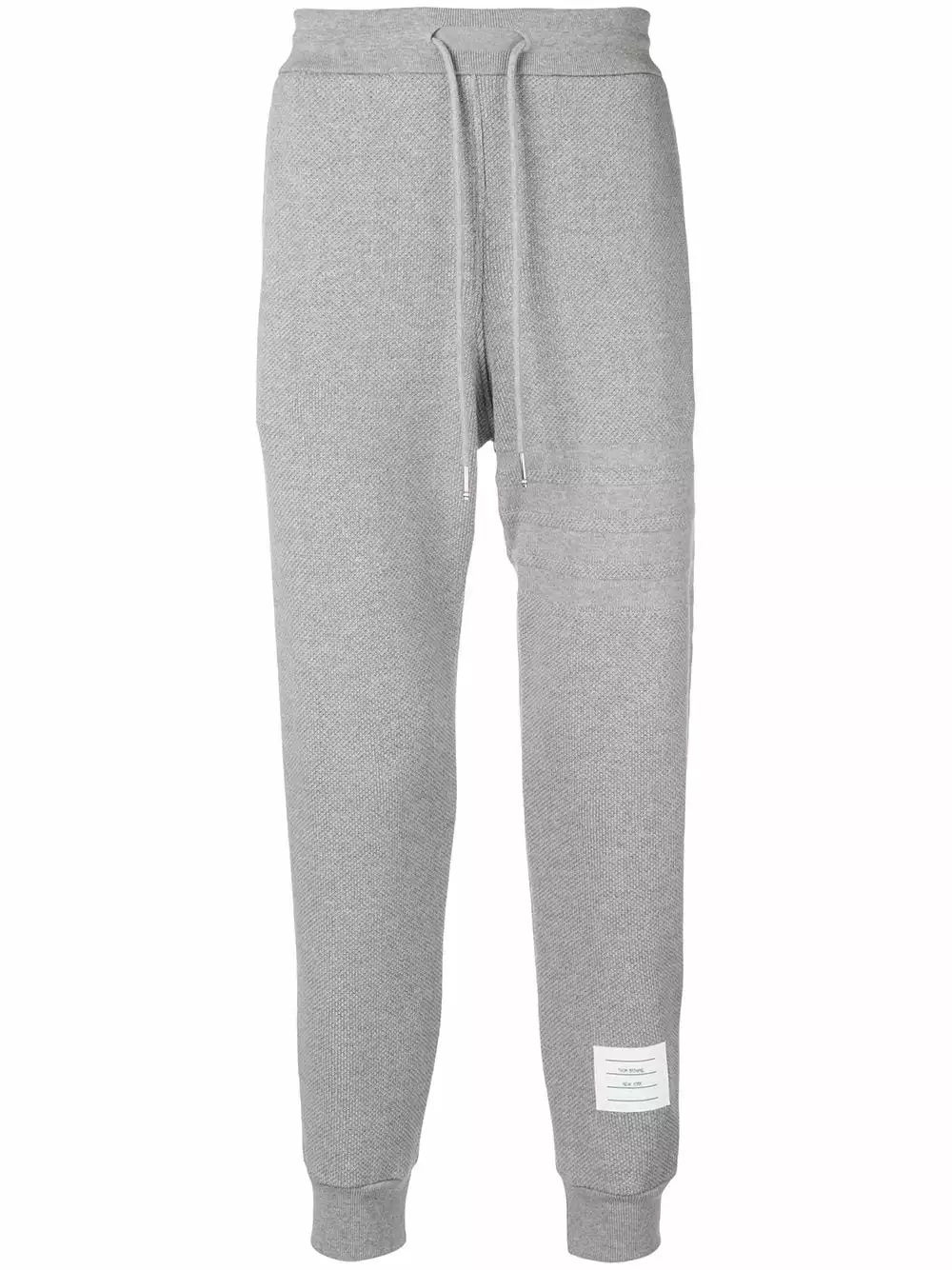 Grey cotton 4-Bar Honeycomb Piqué Sweatpant from Thom Browne featuring a mid rise, an elasticated drawstring waist, a slim fit, a tapered leg, gathered ankles, side pockets, a signature tri-colour striped trim, a back welt pocket and a logo patch at the left ankle.