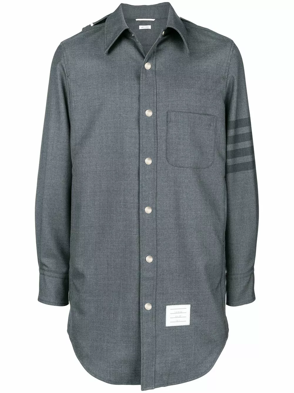 Make this Thom Browne piece your new uniform. The signature 4-Bar stripe is the ideal understated detail here. A detachable hood adds a quirky touch. Featuring a detachable hood, a collar style, a front button fastening, long sleeves, a straight fit, a patch pocket at the chest, button cuffs, a front logo patch, a RWB tab and a 4-Bar stripe.