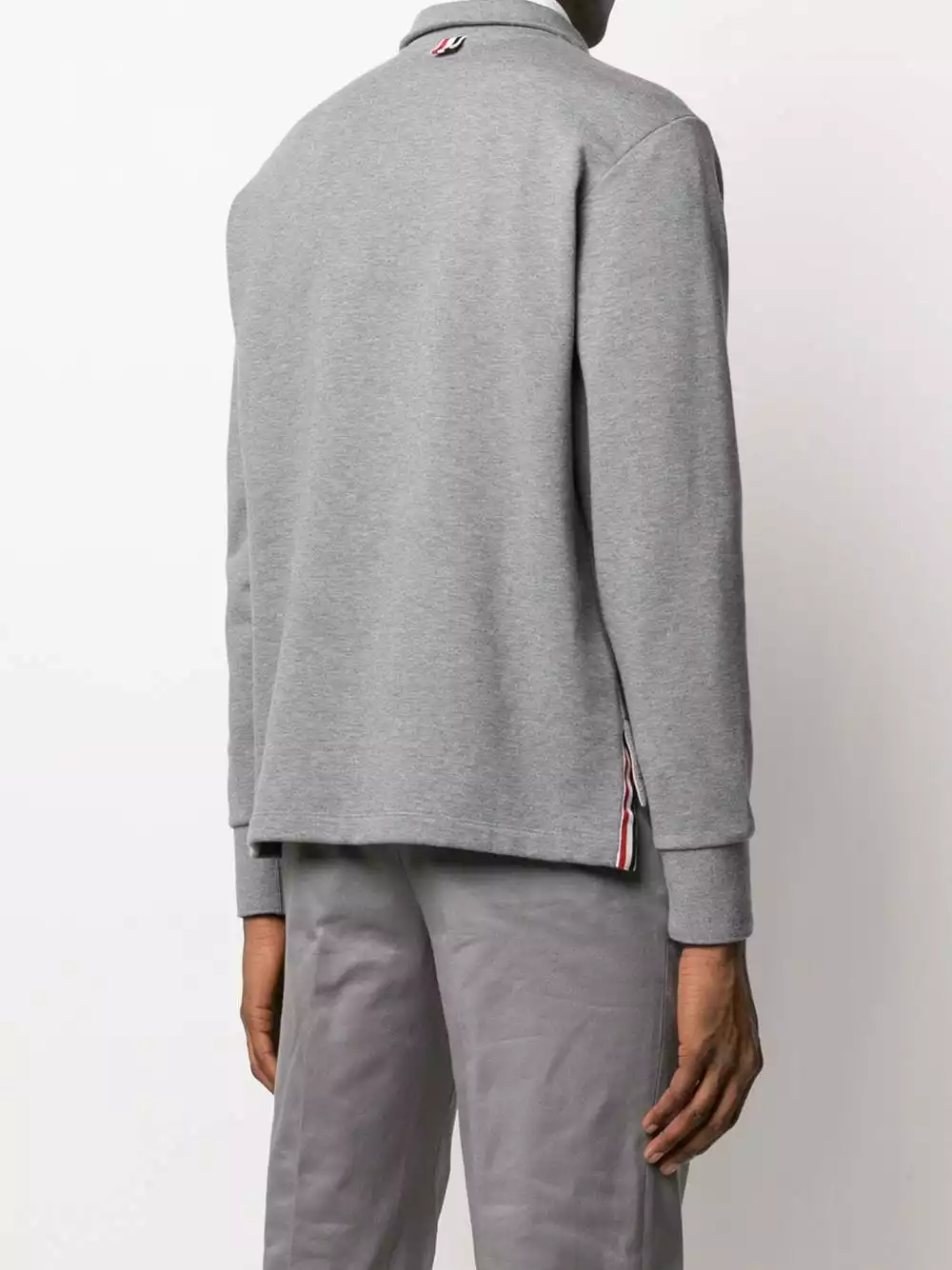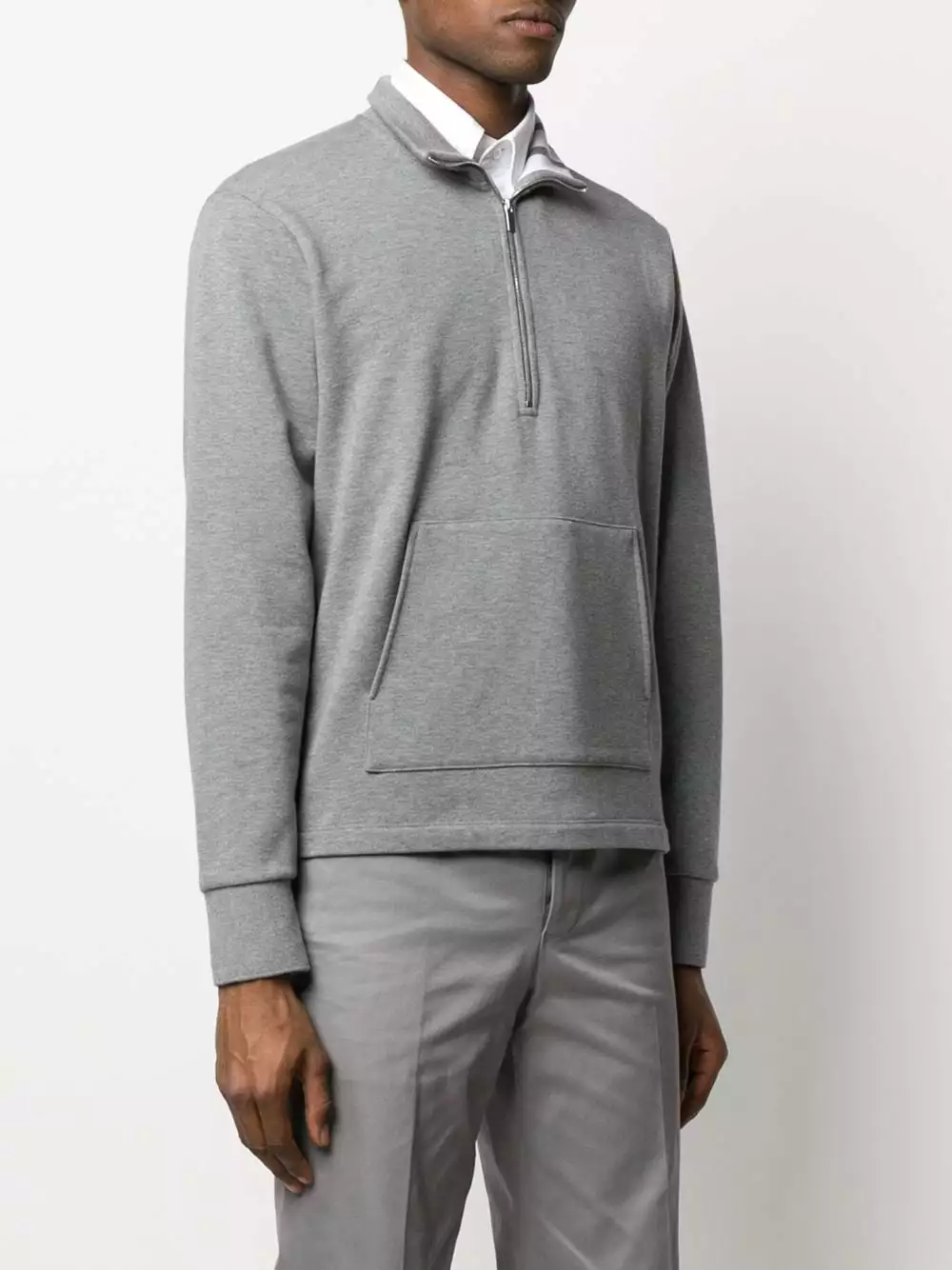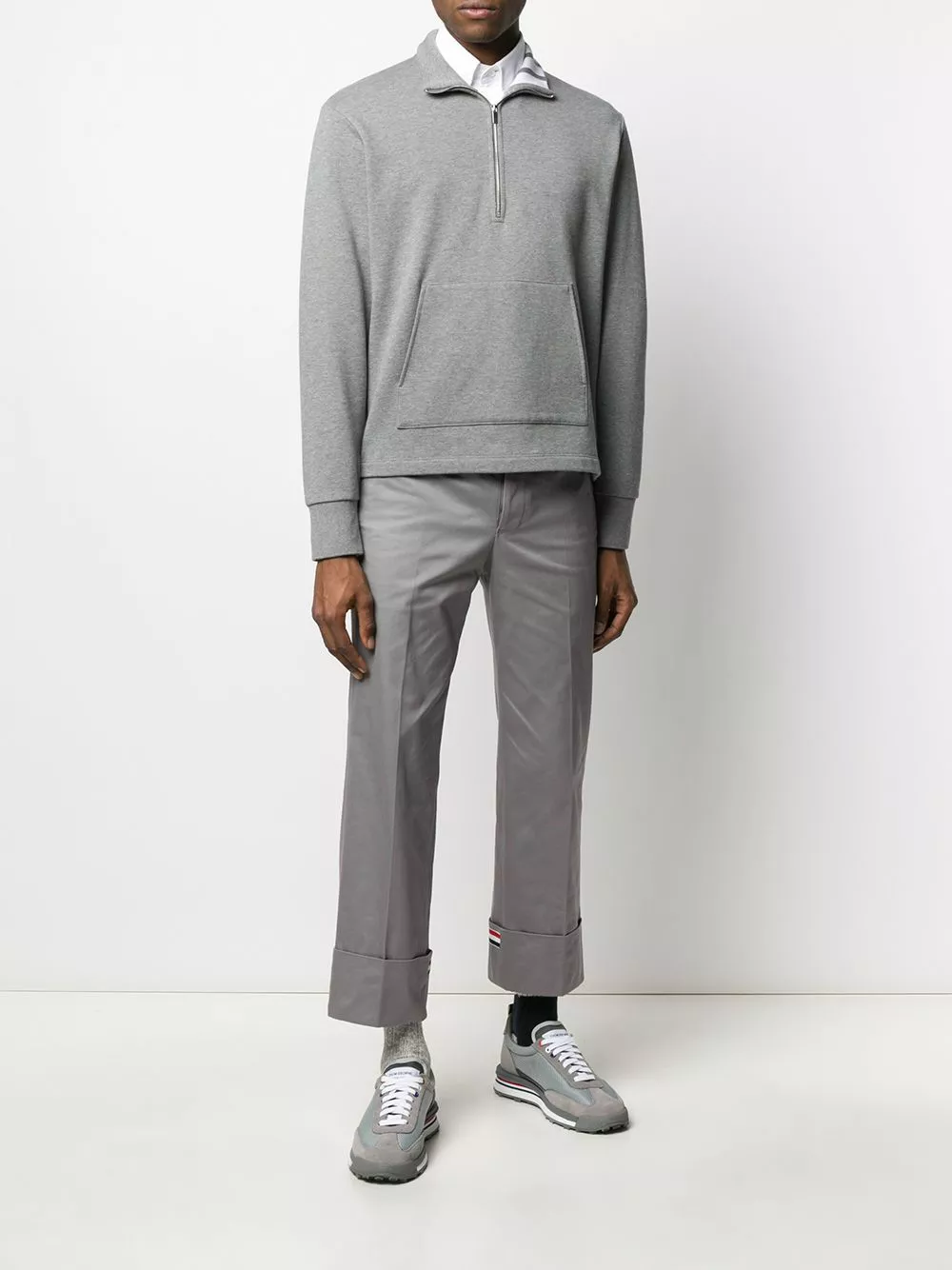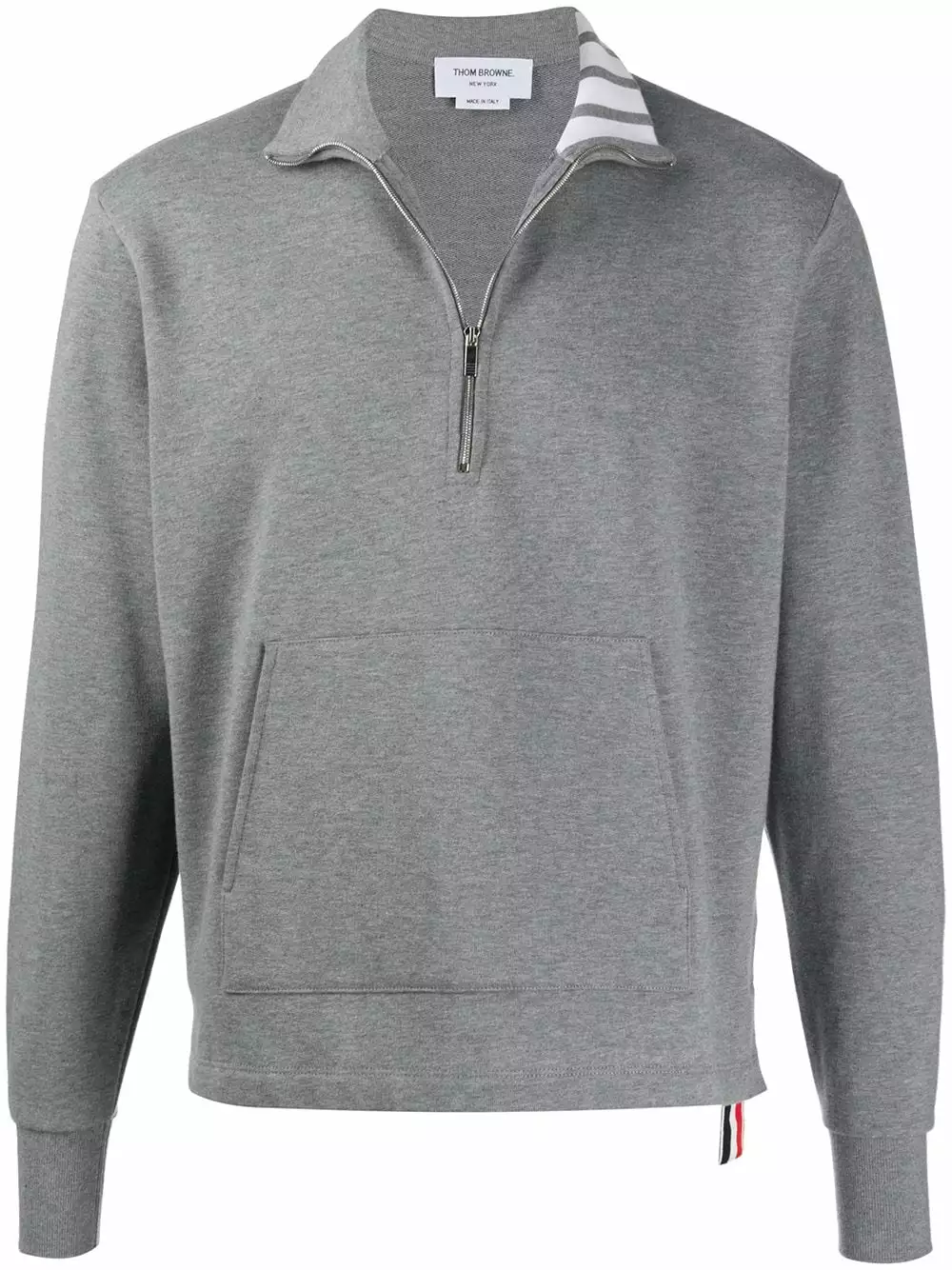 Simple, versatile and super comfy, this medium grey cotton sweatshirt from Thom Browne is the easiest to wear piece. It looks just perfect no matter your style. Already got yours? Featuring a funnel neck, a front zip fastening, a kangaroo pocket and long sleeves.