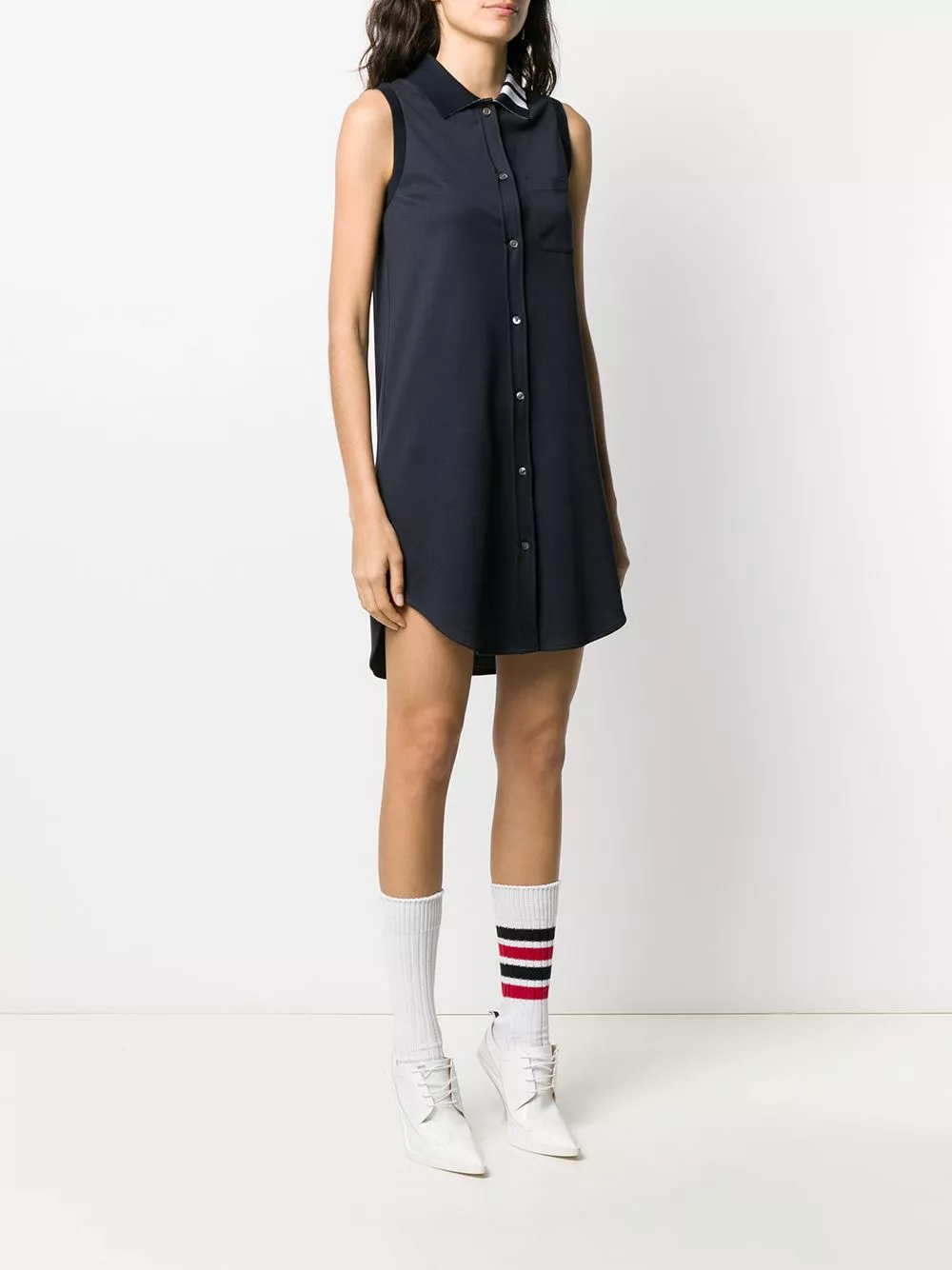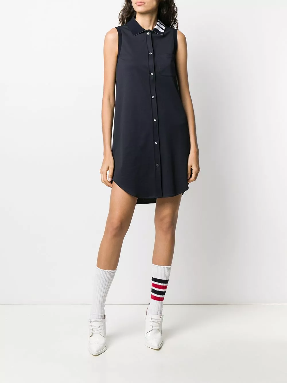 Do you love an understated detail? Take a closer look at this sleeveless Thom Browne piece, to spot the signature 4-Bar stripe to the collar. Be the best-dressed in the room. Featuring a collar style, a front button fastening, a sleeveless design, a straight fit, a patch pocket at the chest, a short length, a high low hemline, a 4-Bar stripe and a RWB tab.