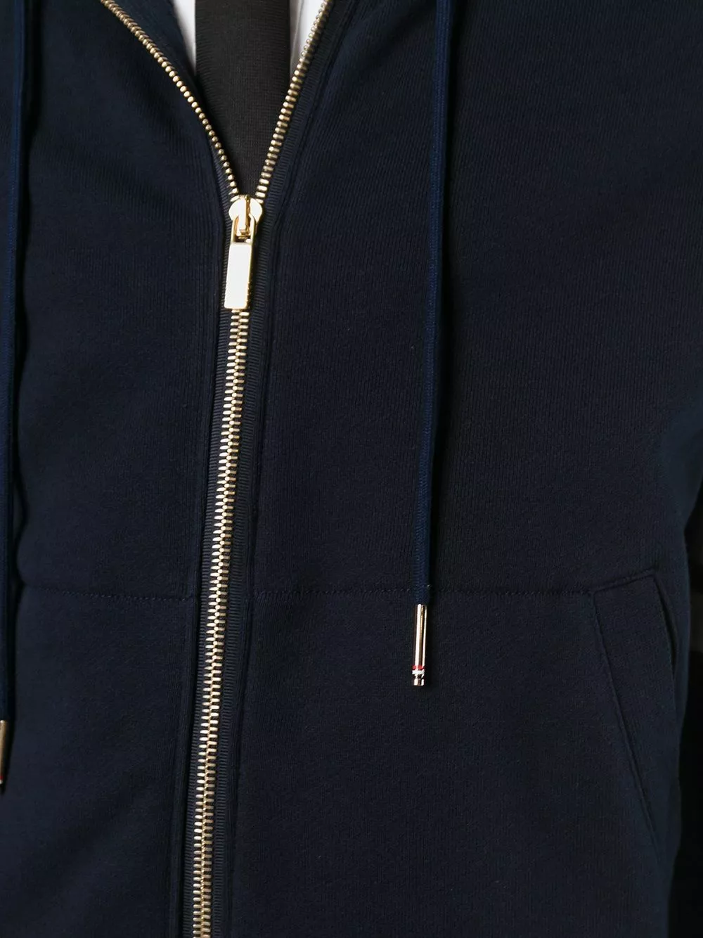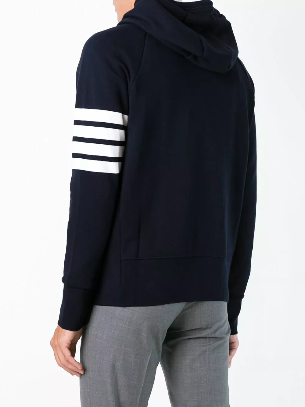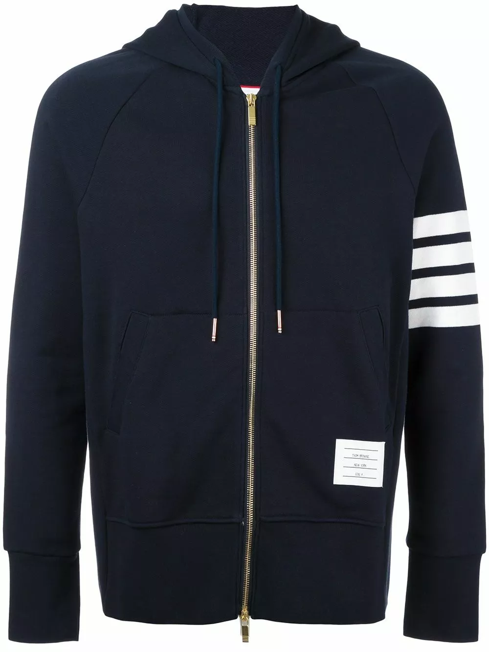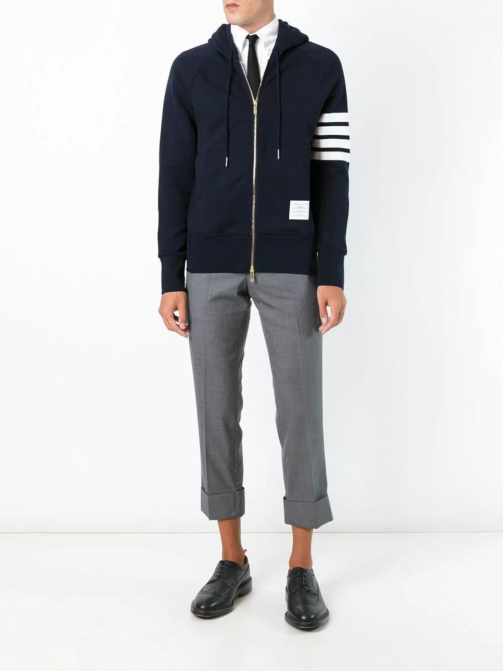 Introducing…your go-to hoodie. With Thom Browne’s engineered 4-Bar stripe detail and a logo patch to the front, this is a piece that you’ll reach for again and again. Stay warm in style. Featuring a drawstring hood, a front zip fastening, long sleeves, two front pockets, a front logo patch and a 4-Bar stripe.