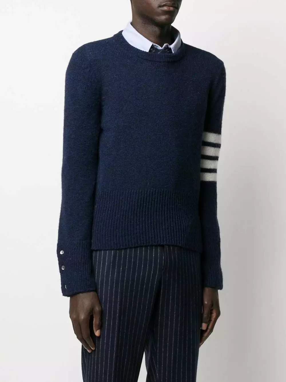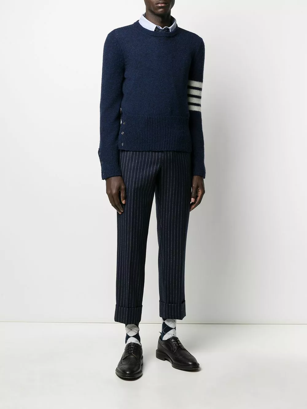 Nothing says iconic quite like that signature 4-Bar stripe. Which is exactly why this navy wool 4-Bar jumper from Thom Browne is here to leave a lasting impression. Stripes for the win. Featuring a round neck, long sleeves, a knitted style, a ribbed hem and cuffs and a striped pattern.