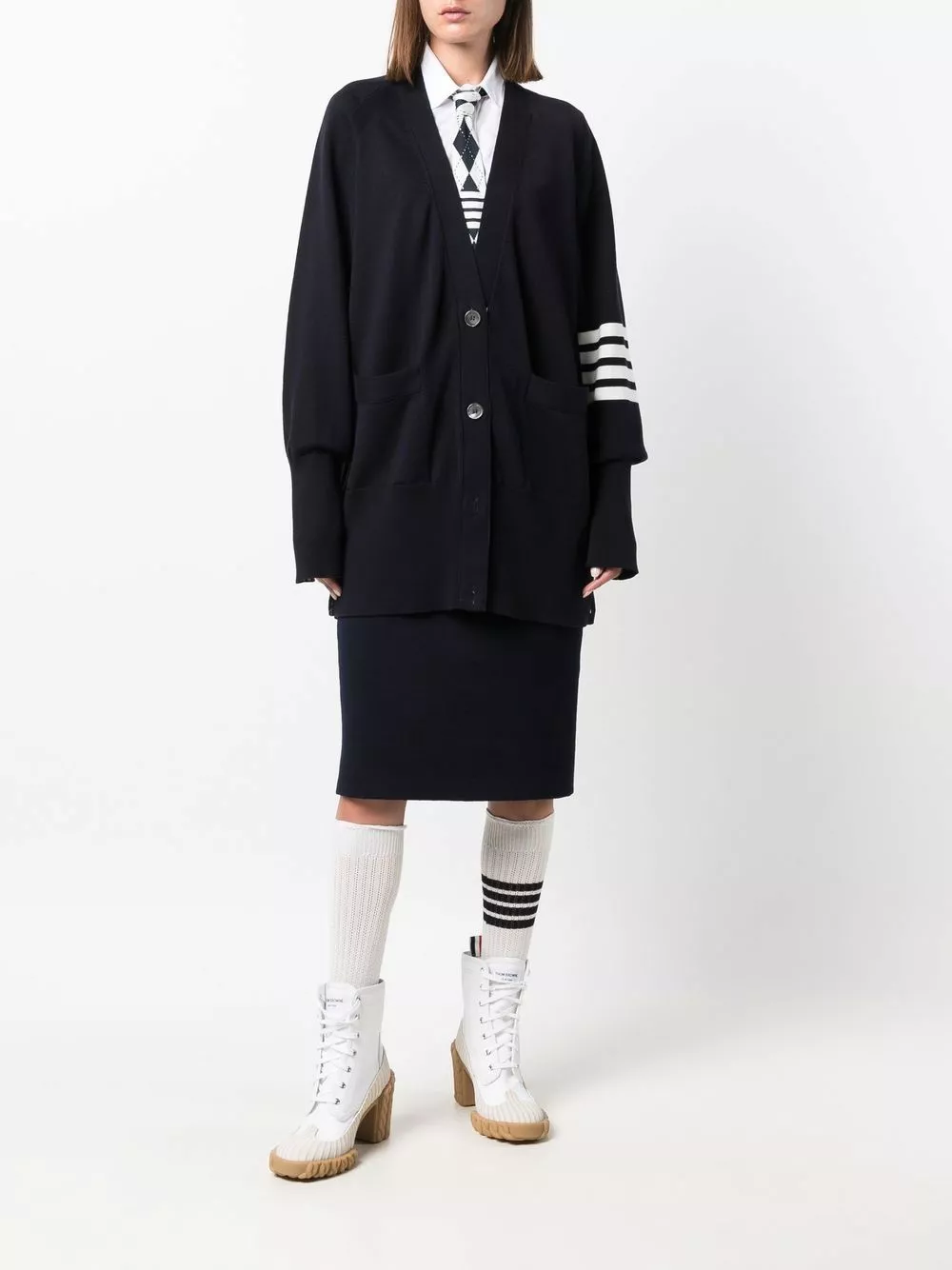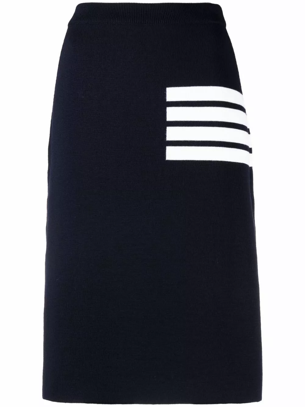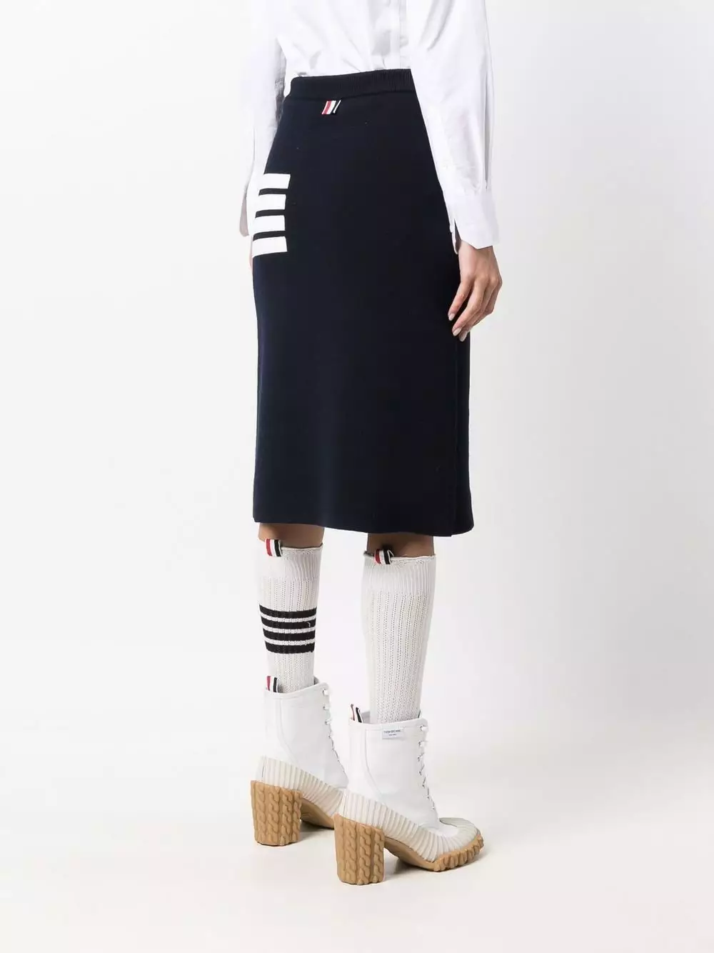 Finished with 4-bar detailing on the side, this knee-length skirt is undoubtedly a Thom Browne design. Eschewing an official logo, the brand is recognisable by this motif.