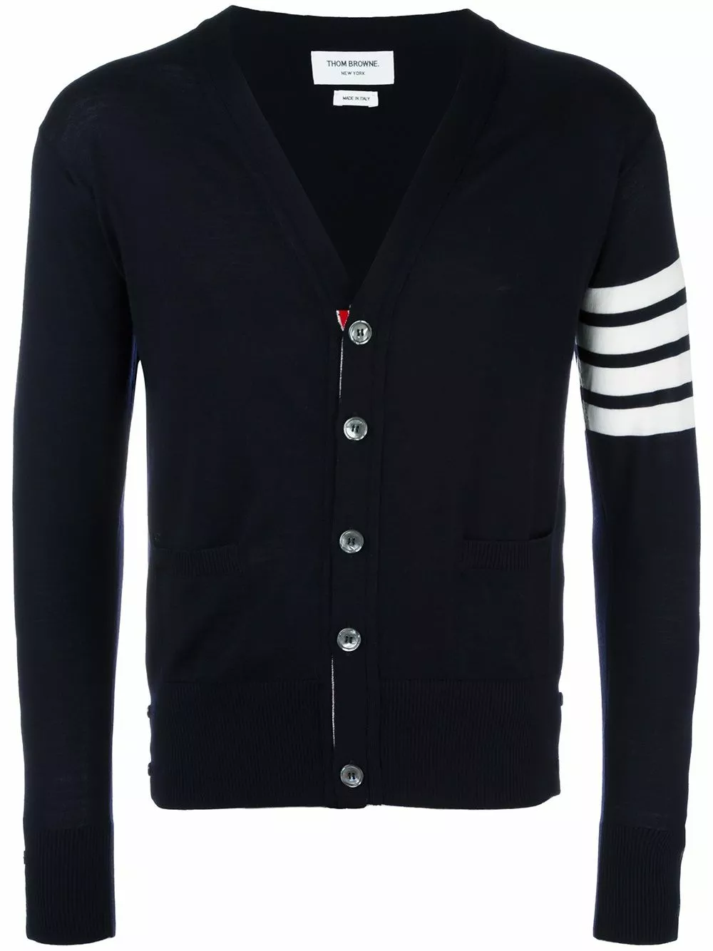 Those 4-Bar stripes on the sleeve show this is the making of Thom Browne. This cardigan has been knitted from navy-blue wool and detailed with a v-neck. Button up. Featuring a deep V neck, a front button fastening, long sleeves, decorative buttons and 4-Bar stripe on the sleeve. This item is true to fit.