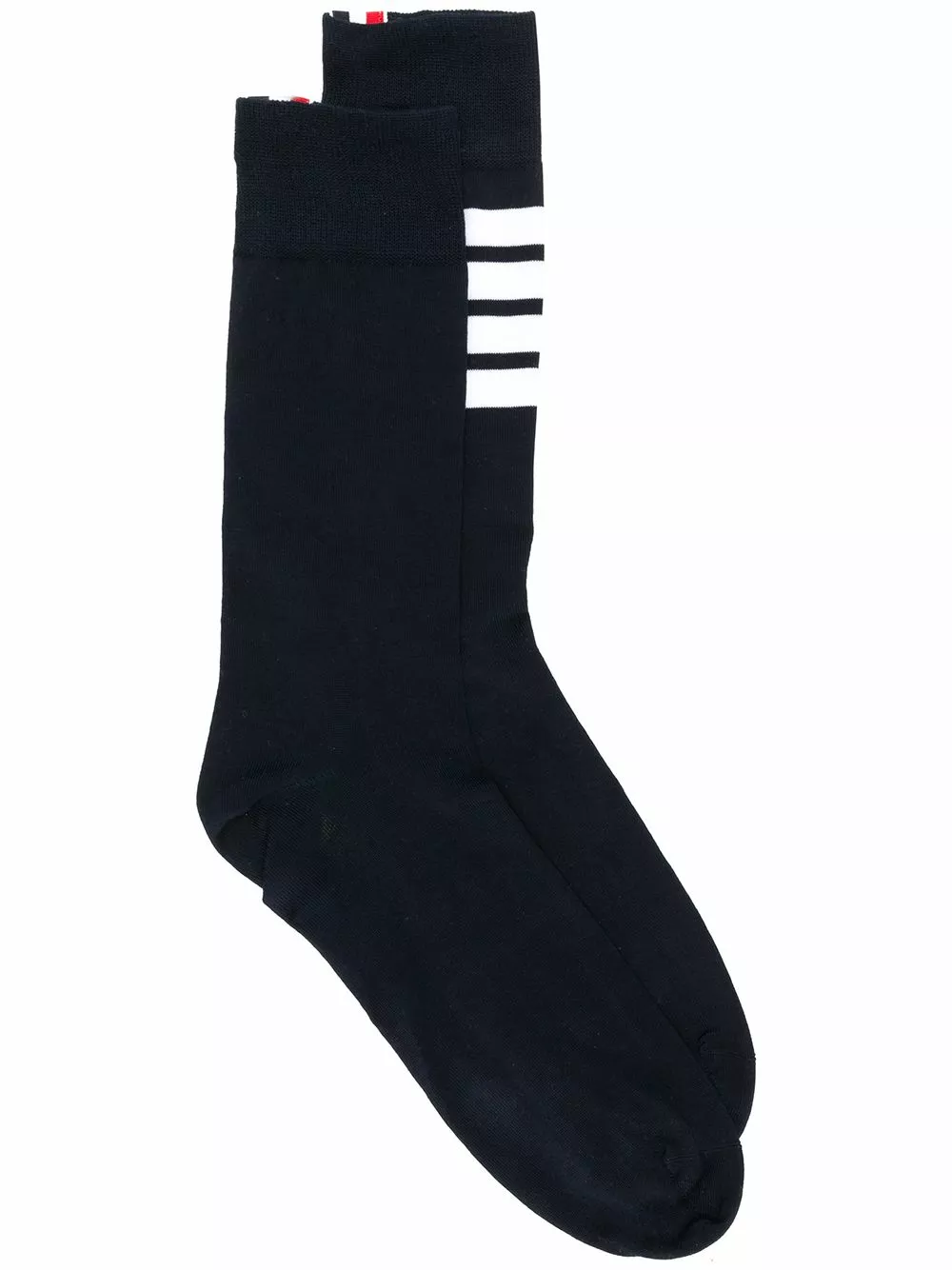 Reimagining menswear staples, Thom Browne tailors English wools and tweeds to a modernised sportswear aesthetic. Crafted from navy blue and white cotton, these lightweight 4-bar mid-calf socks feature a knitted style, a quadruple-striped detail and a tricolour grosgrain tab. Socks and Hosiery must be returned in its original unopened packaging.
