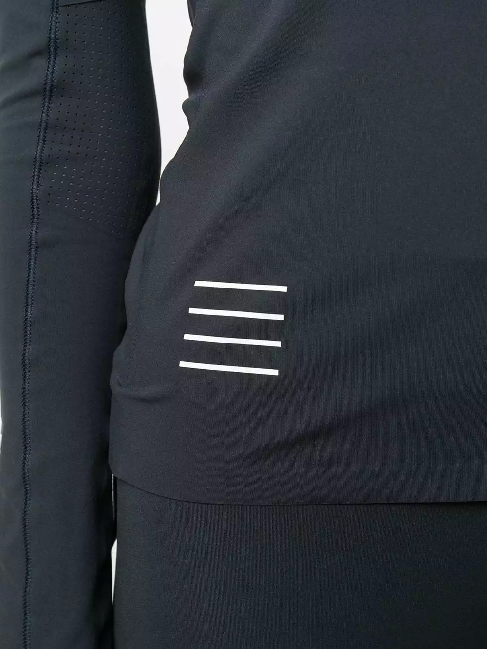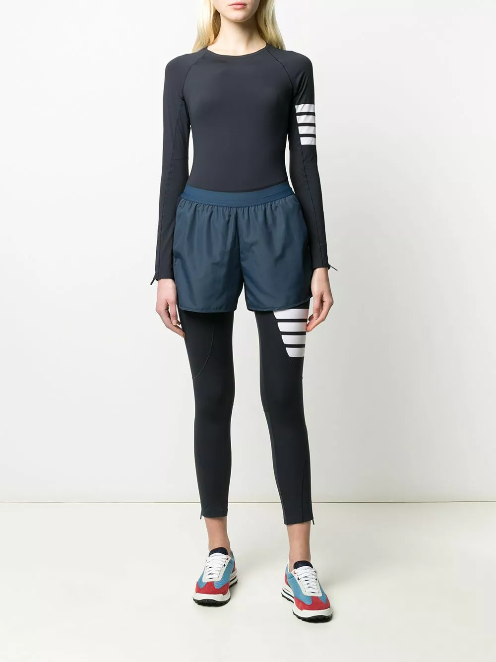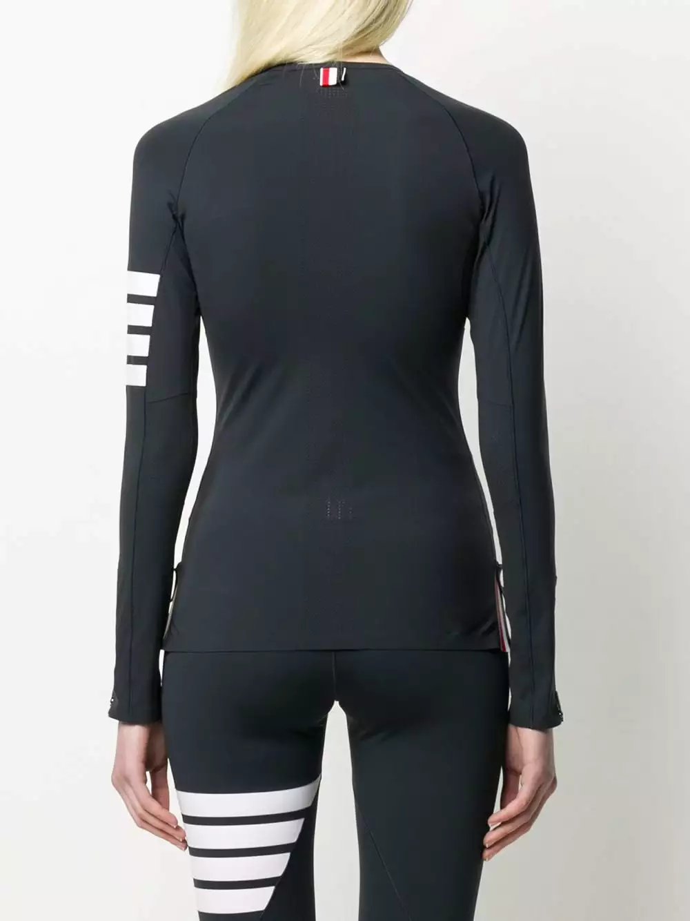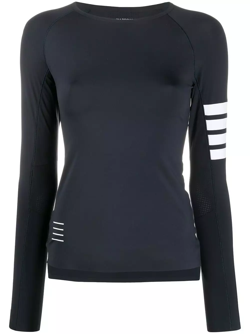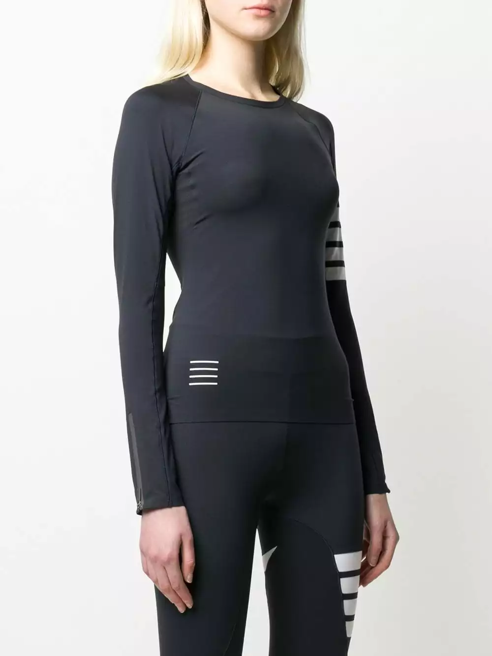 Hit the gym in style with this cool charcoal grey 4-Bar lightweight tech compression top from Thom Browne. Simple, practical and super comfortable. Undoubtedly, a necessary workout piece. Featuring a round neck, long sleeves, a stripe detail to the side, a straight hem, a stretch fit and a logo tag.