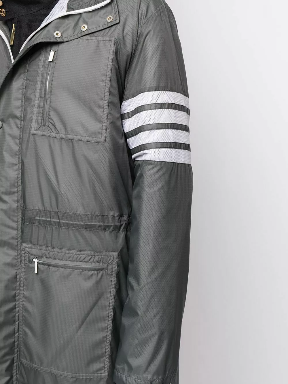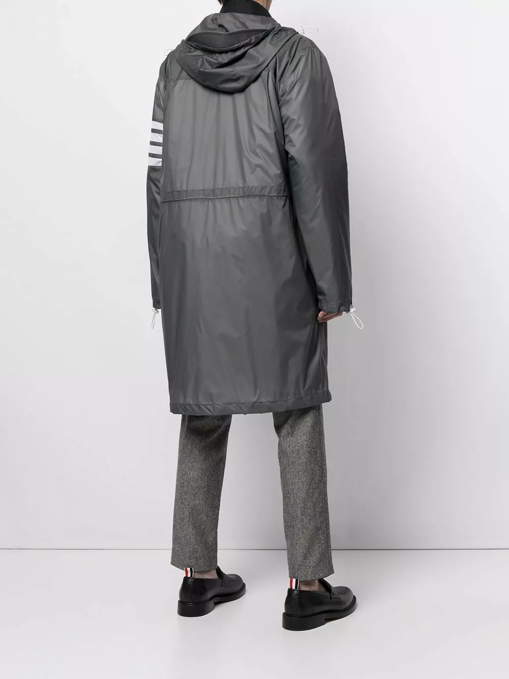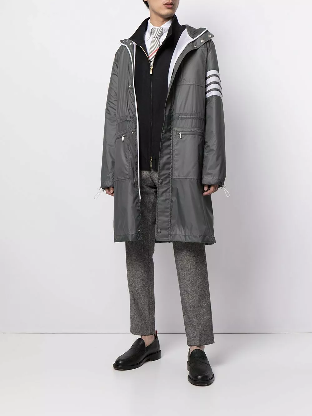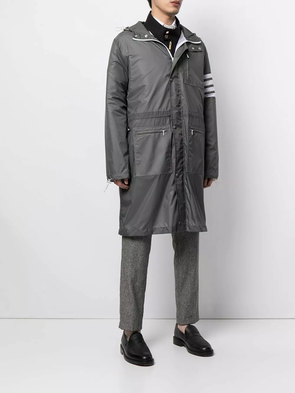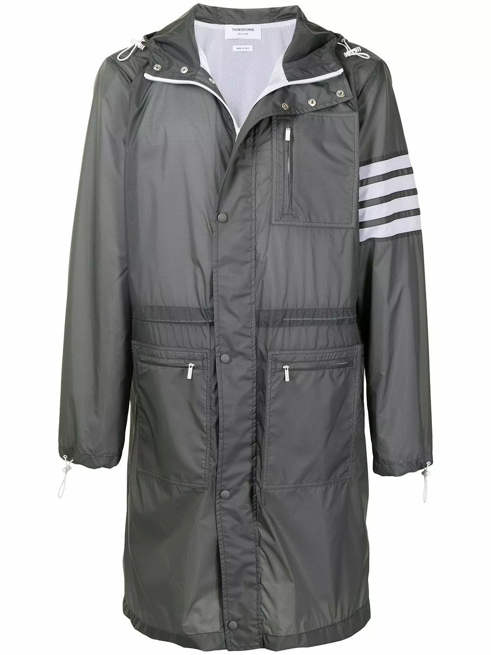 Didn’t think you could marry activewear with sportswear? Thom Browne shows us how with this 4-Bar hooded parka coat. Designed in a sheer ripstop fabrication it celebrates the best of the brand’s signature motifs in a wearable and practical silhouette. Featuring a drawstring hood, a button over front zip fastening, a drawstring waist, long sleeves, side zipped pockets, a straight hem, a zip chest pocket, drawstring cuffs and a mesh lining.