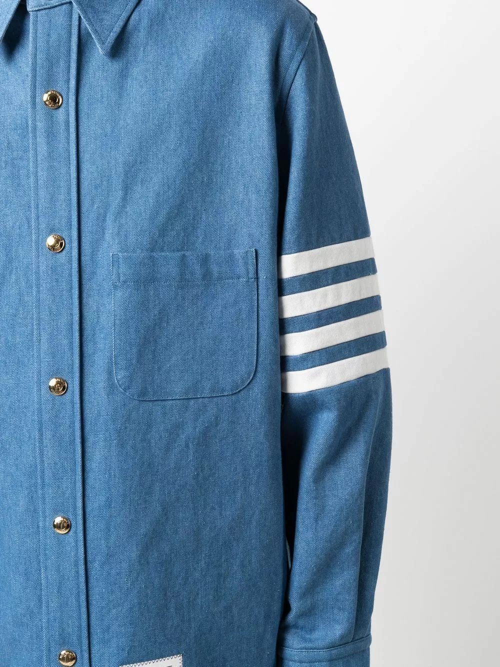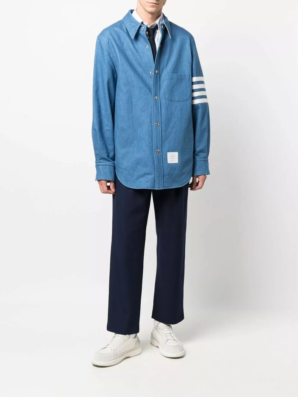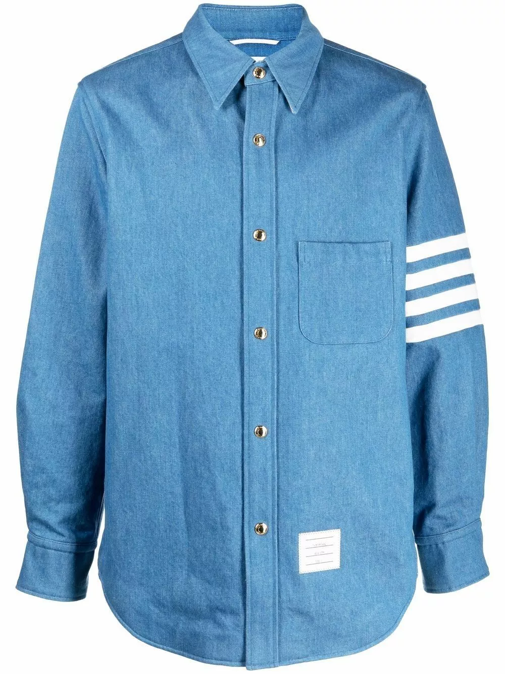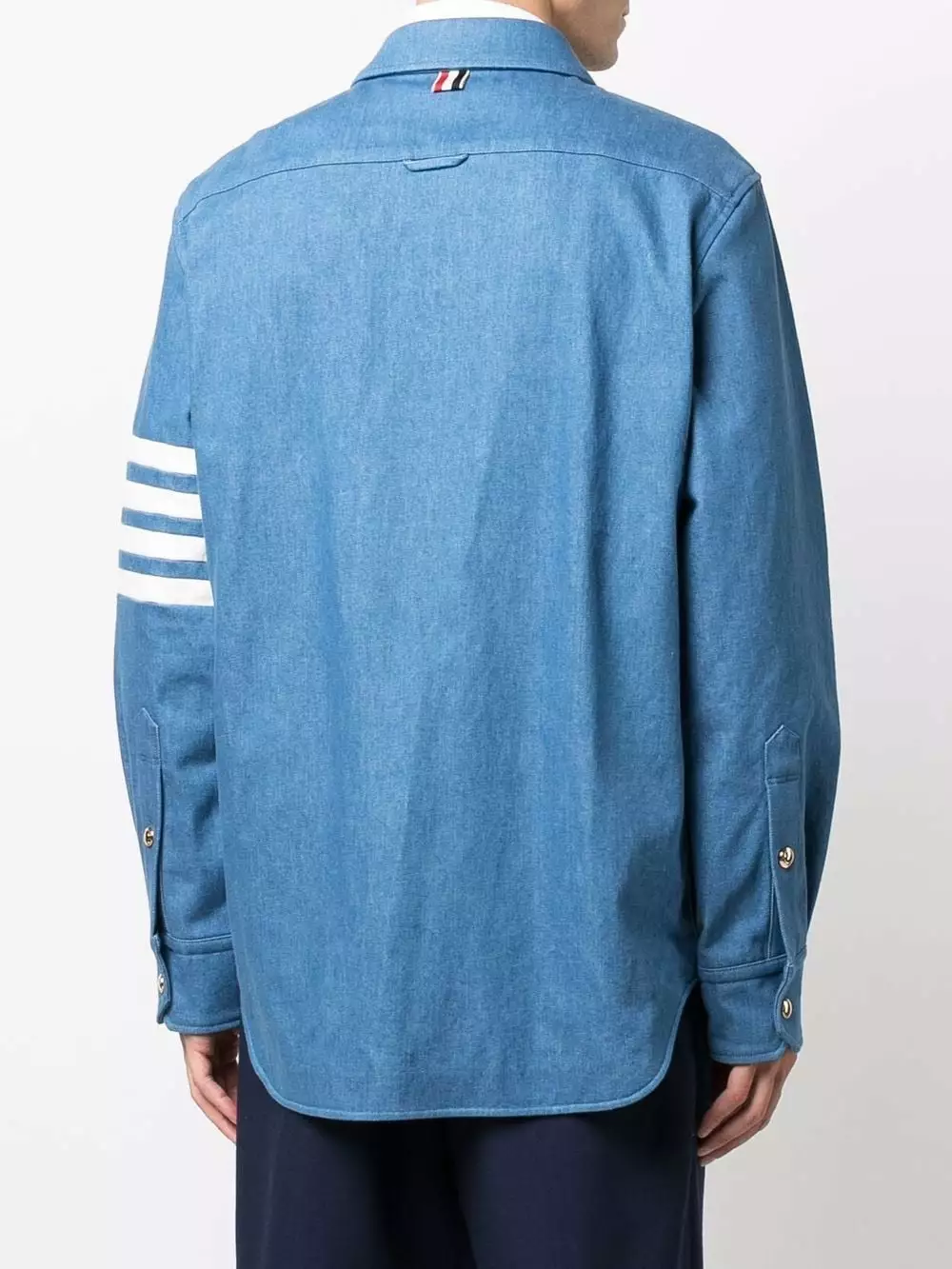 Thom Browne elevates the classic denim shirt with branding details that need no introduction. Crafted from cotton in blue, this piece is adorned by the iconic 4-Bar stripe and the signature grosgrain loop tag.