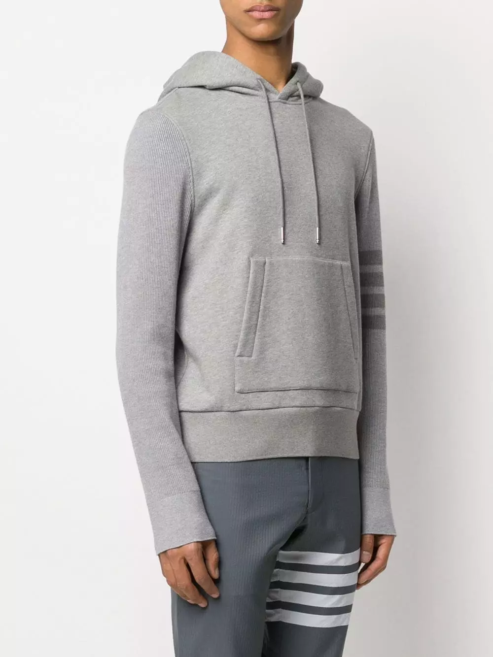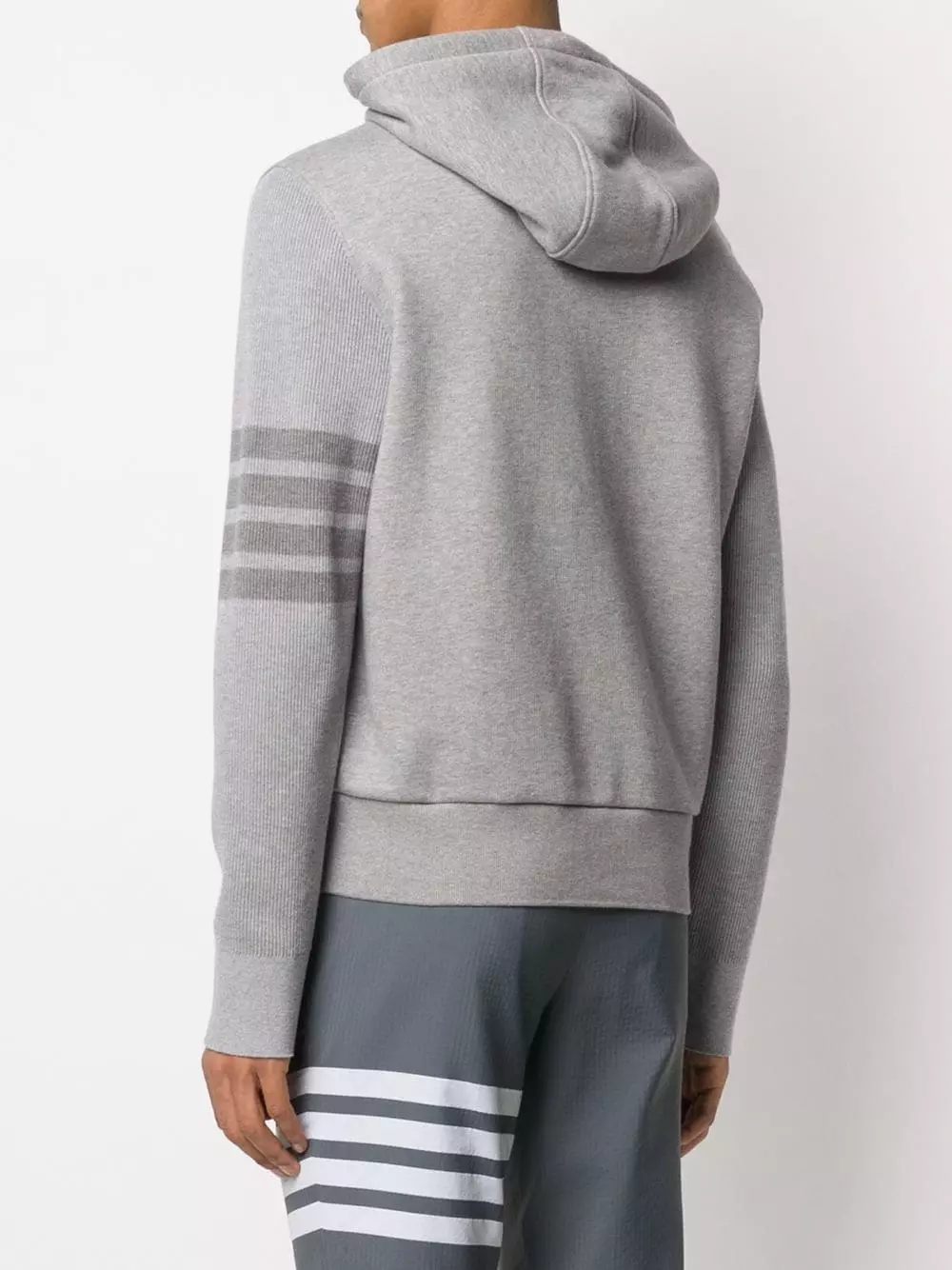 No more hitting the snooze button! This light grey cotton 4-Bar loopback hoodie from Thom Browne will make those (very early) morning walks to the gym slightly more bearable. No pain, no gain – and definitely no Thom Browne. Featuring a hood with drawstring tie fastenings, ribbed trimming, a short length, a stripe detail to the side, a kangaroo pocket and a straight hem.