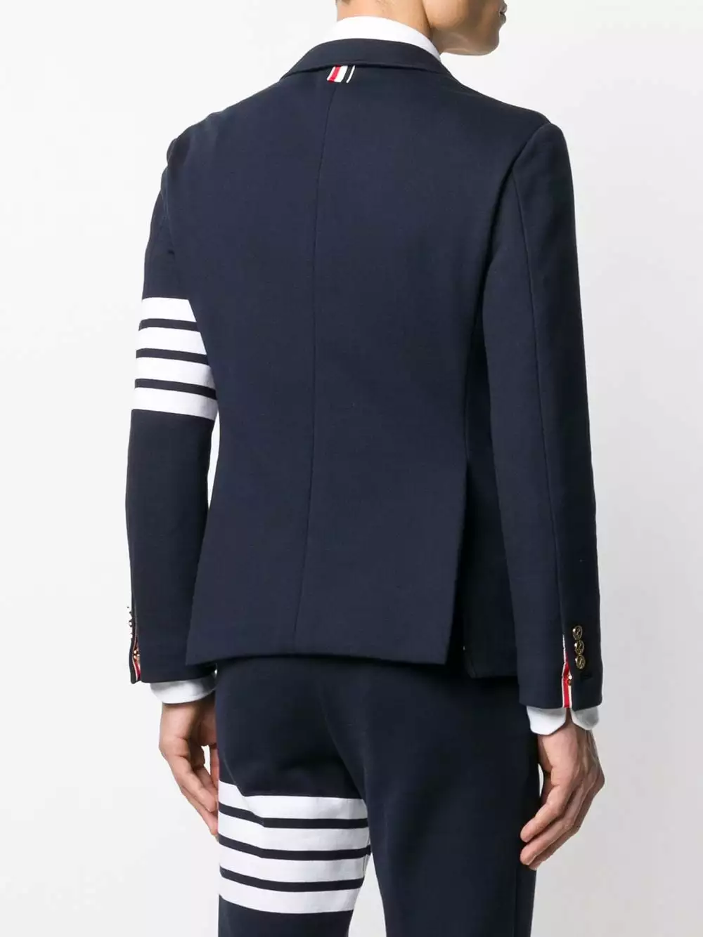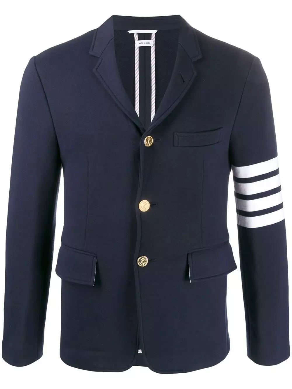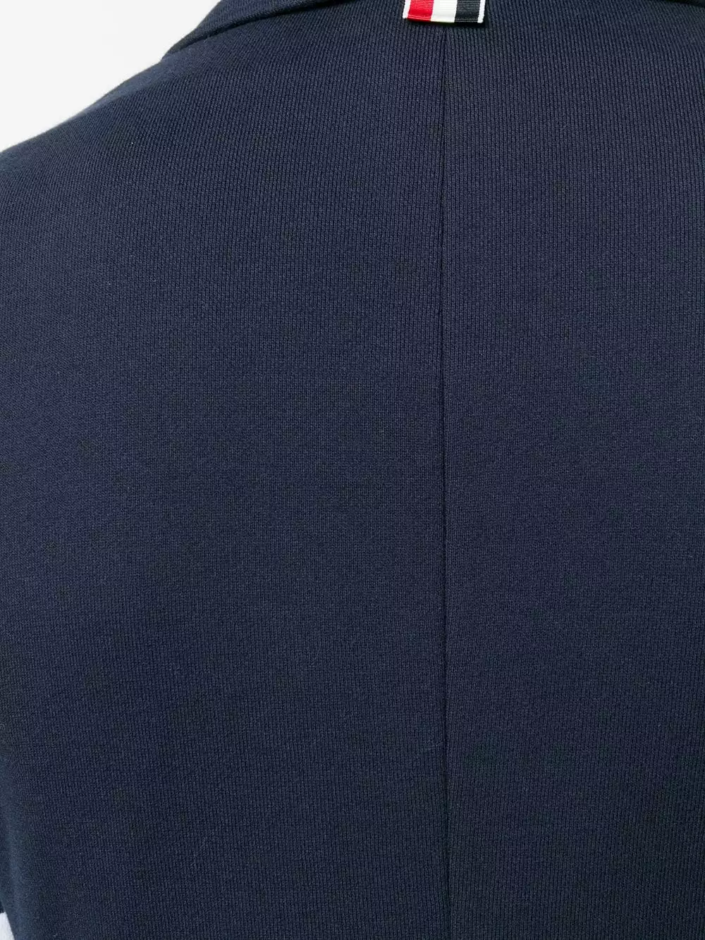 Add a casualwear element to your outerwear with this sporty style blazer from Thom Browne. Crafted in navy cotton, this fitted jacket is engineered with the designer’s four white bands to the left arm. Stripe it. Featuring notched lapels, long sleeves, button cuffs, horizontal stripes, a chest pocket, front flap pockets and a rear central vent.