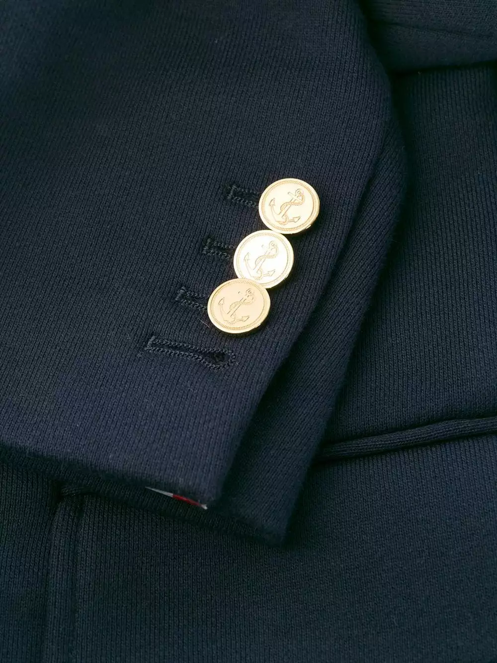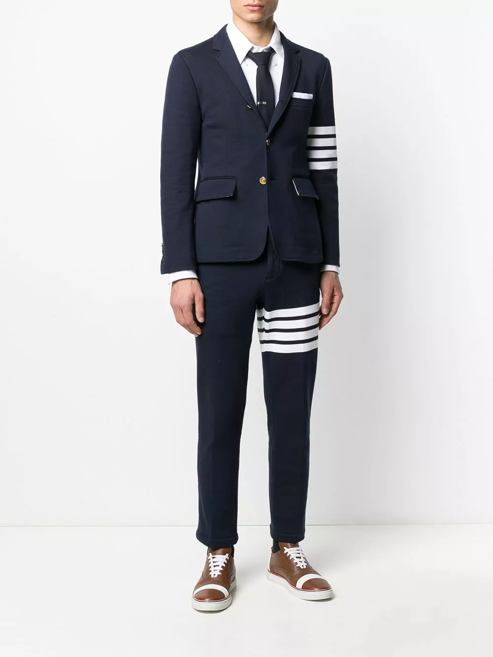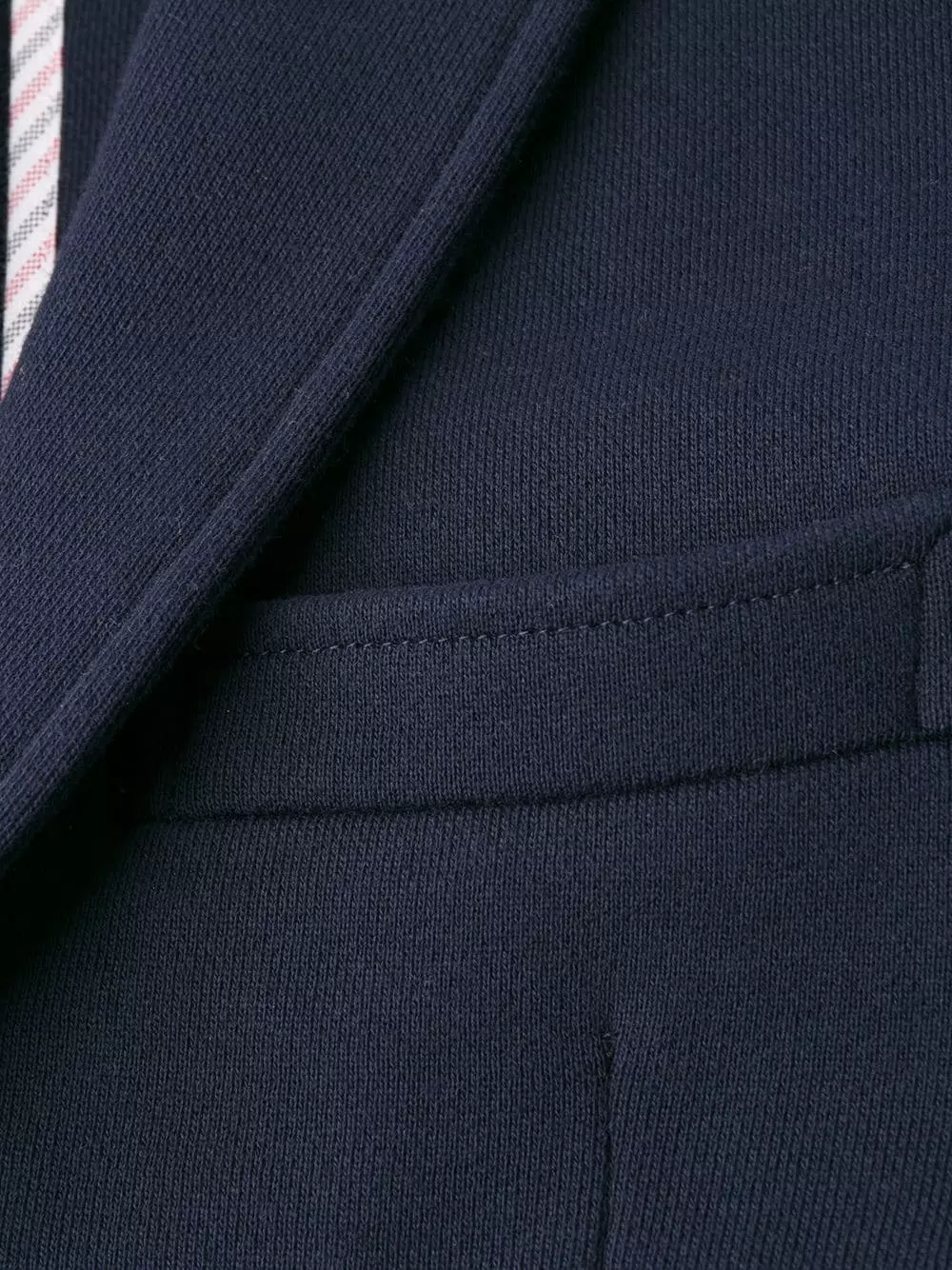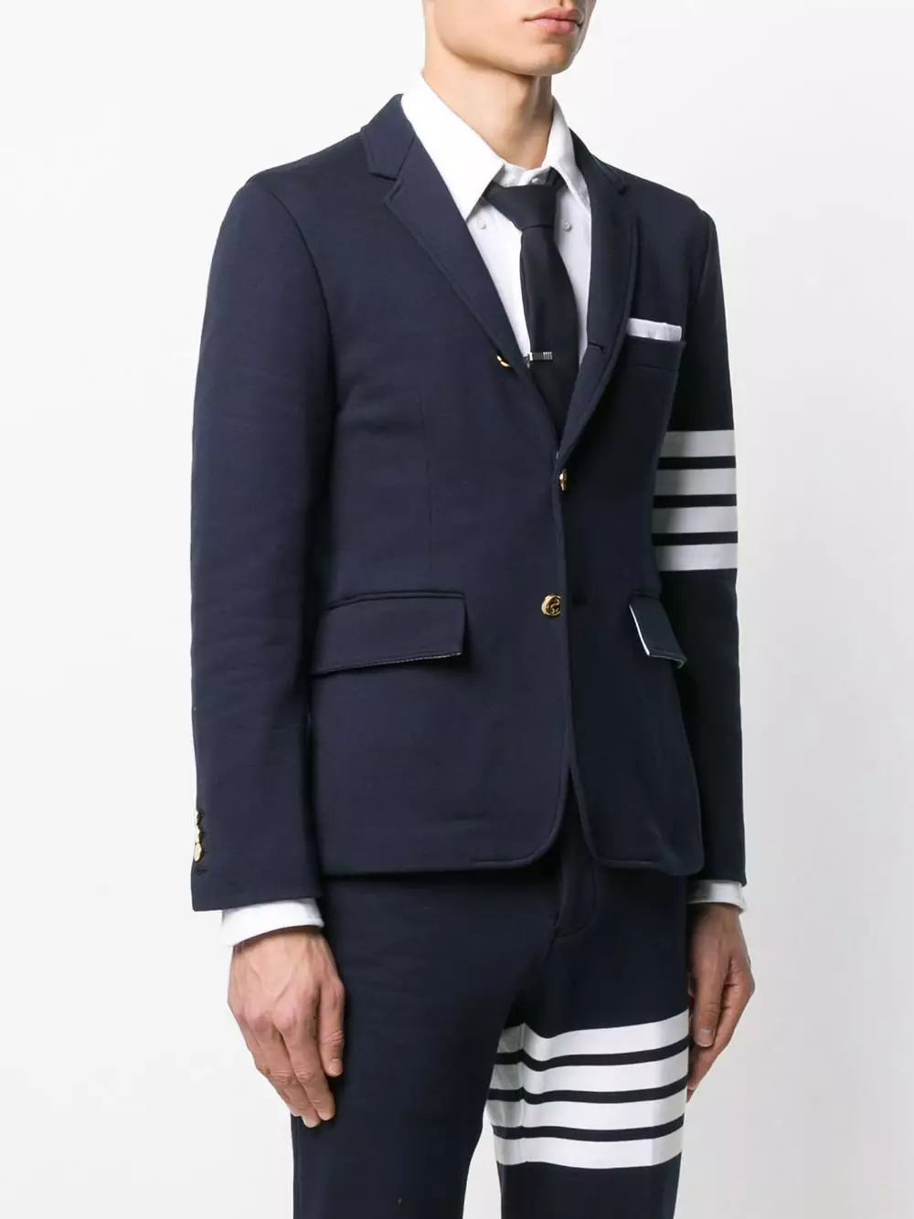 Add a casualwear element to your outerwear with this sporty style blazer from Thom Browne. Crafted in navy cotton, this fitted jacket is engineered with the designer’s four white bands to the left arm. Stripe it. Featuring notched lapels, long sleeves, button cuffs, horizontal stripes, a chest pocket, front flap pockets and a rear central vent.