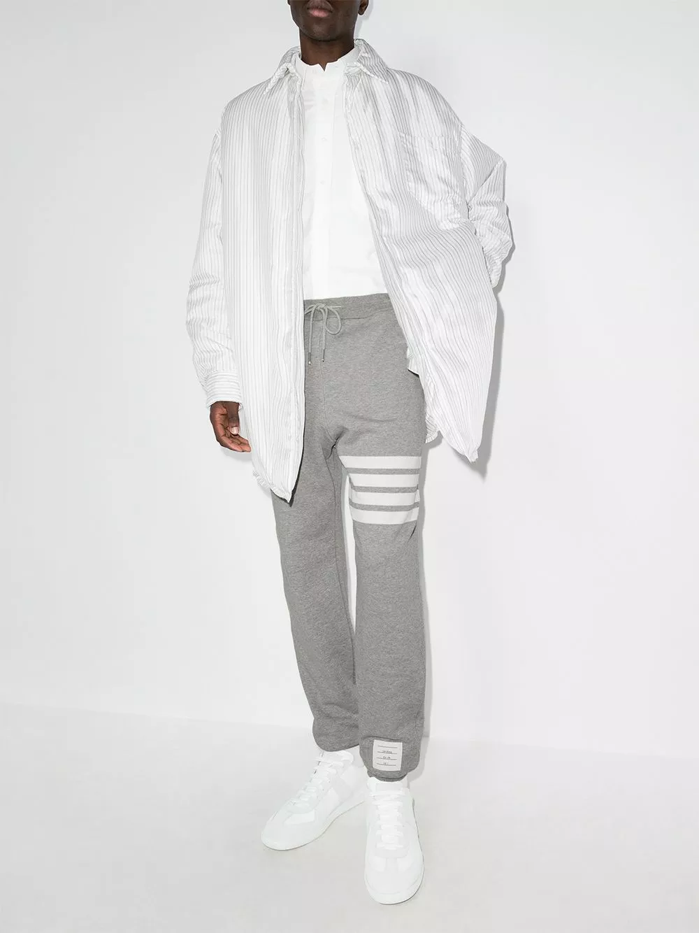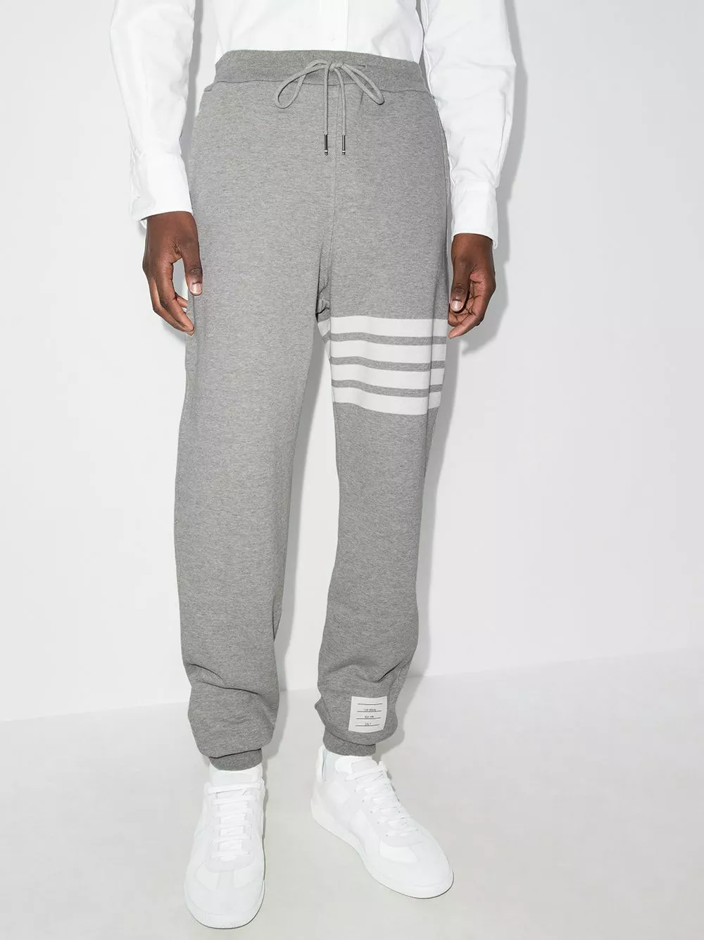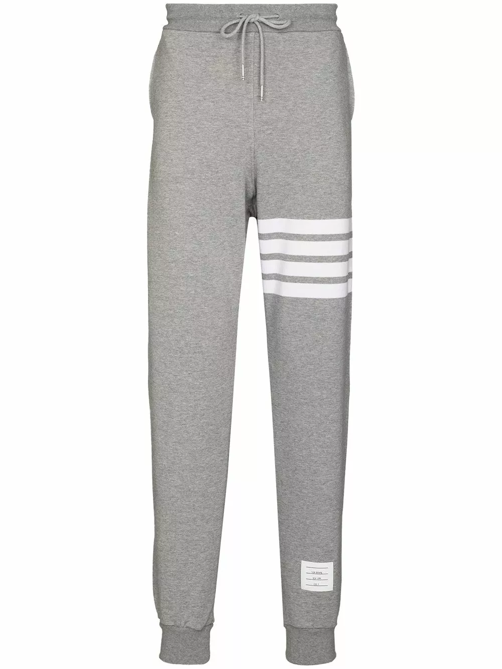 Comfort is key – but style is always appreciated, too. Crafted from cotton, these grey and white track pants from Thom Browne are decorated with a front logo patch and the brand’s signature white, red and blue tag to the rear. The perfect go-to for a relaxed look. Featuring an elasticated waistband with a drawstring fastening, side slit pockets, a back pocket, horizontal stripes to the left leg, a relaxed fit, ribbed cuffs and a regular length.
