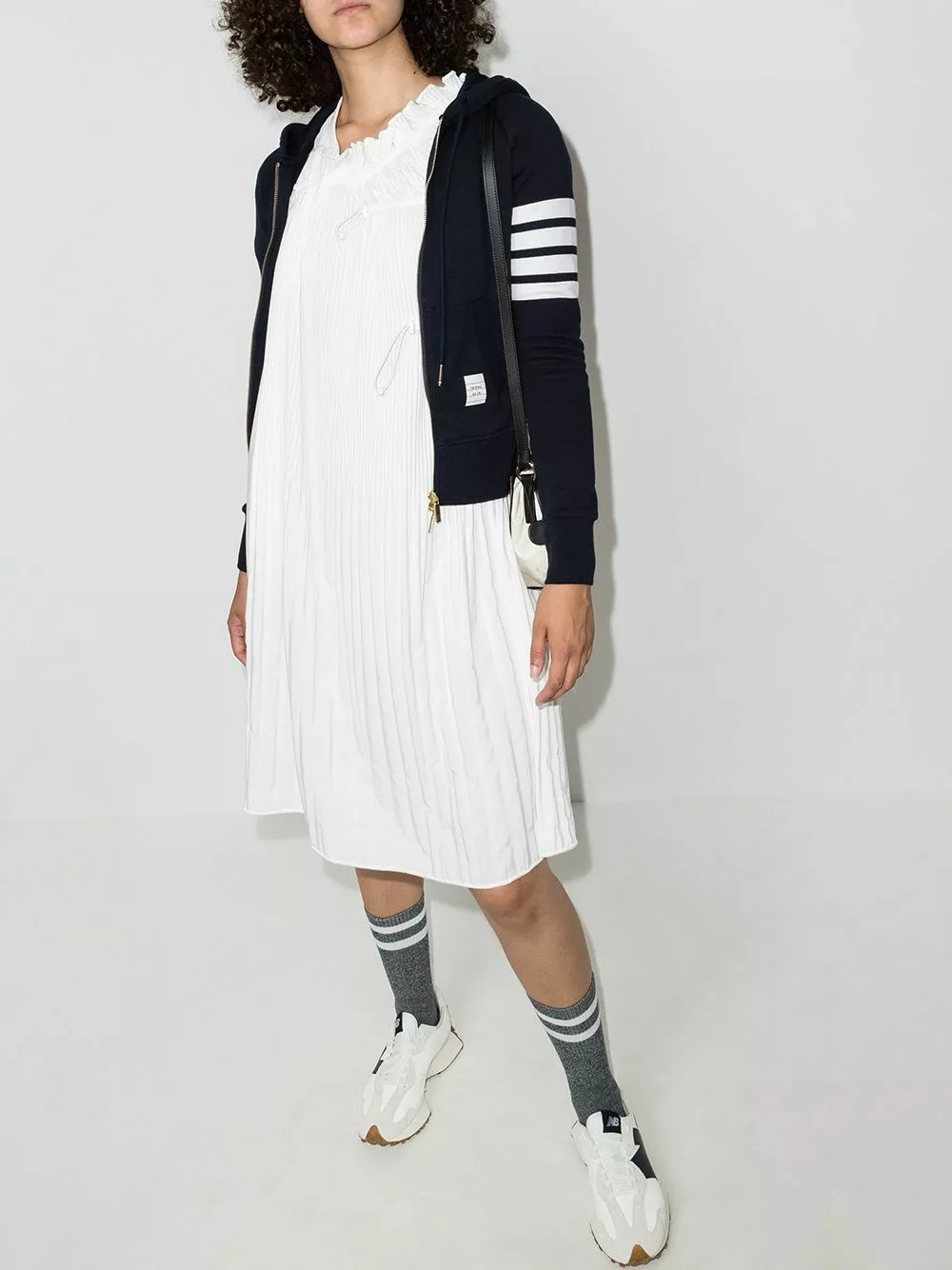 Embrace a sporty aesthetic in the sleekest way possible. This navy blue cotton engineered 4-Bar stripe zip-up hoodie from Thom Browne is your answer to laid-back Sundays. Comfort never looked so good. Featuring a drawstring hood, a front zip fastening, long sleeves, two front pockets, a front logo patch, a ribbed hem and cuffs and 4-Bar stripes to the sleeve.