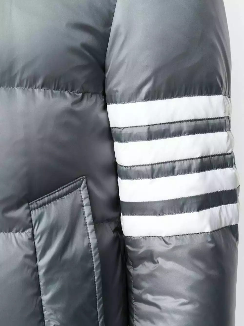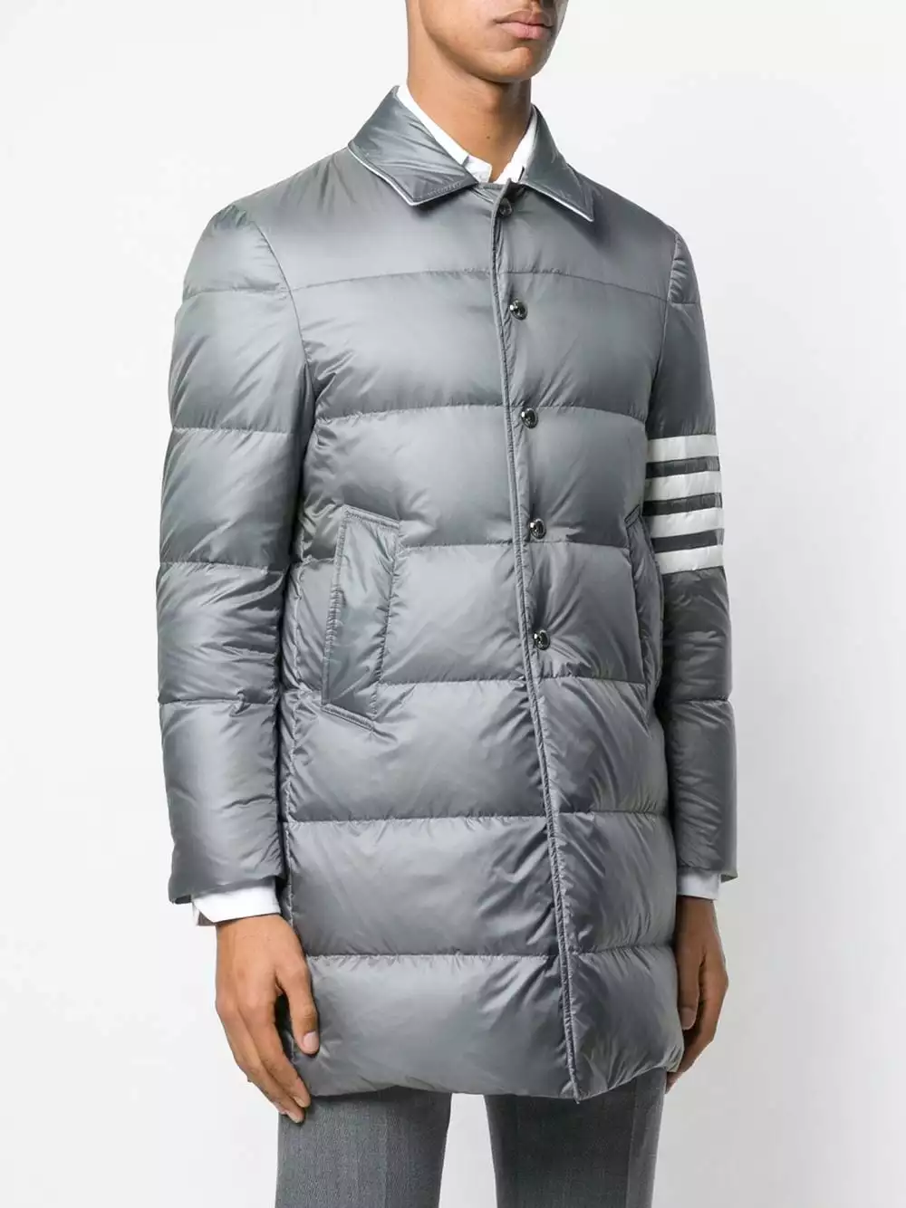 Thom Brown’s expertise in technical, tailored and luxuriously fabricated aesthetic is clearly evident in this Italian-crafted grey coat. Expertly quilted and padded with natural feather down, this straight-fit style features a pointed collar, a snap button closure, side pockets, fitted cuffs, a rear central vent, a lining and four-bar stripes at the sleeve.