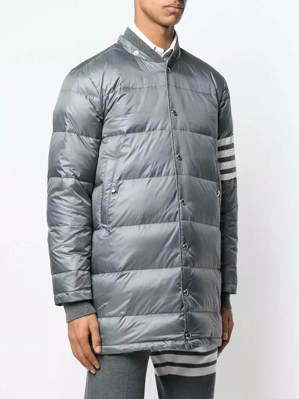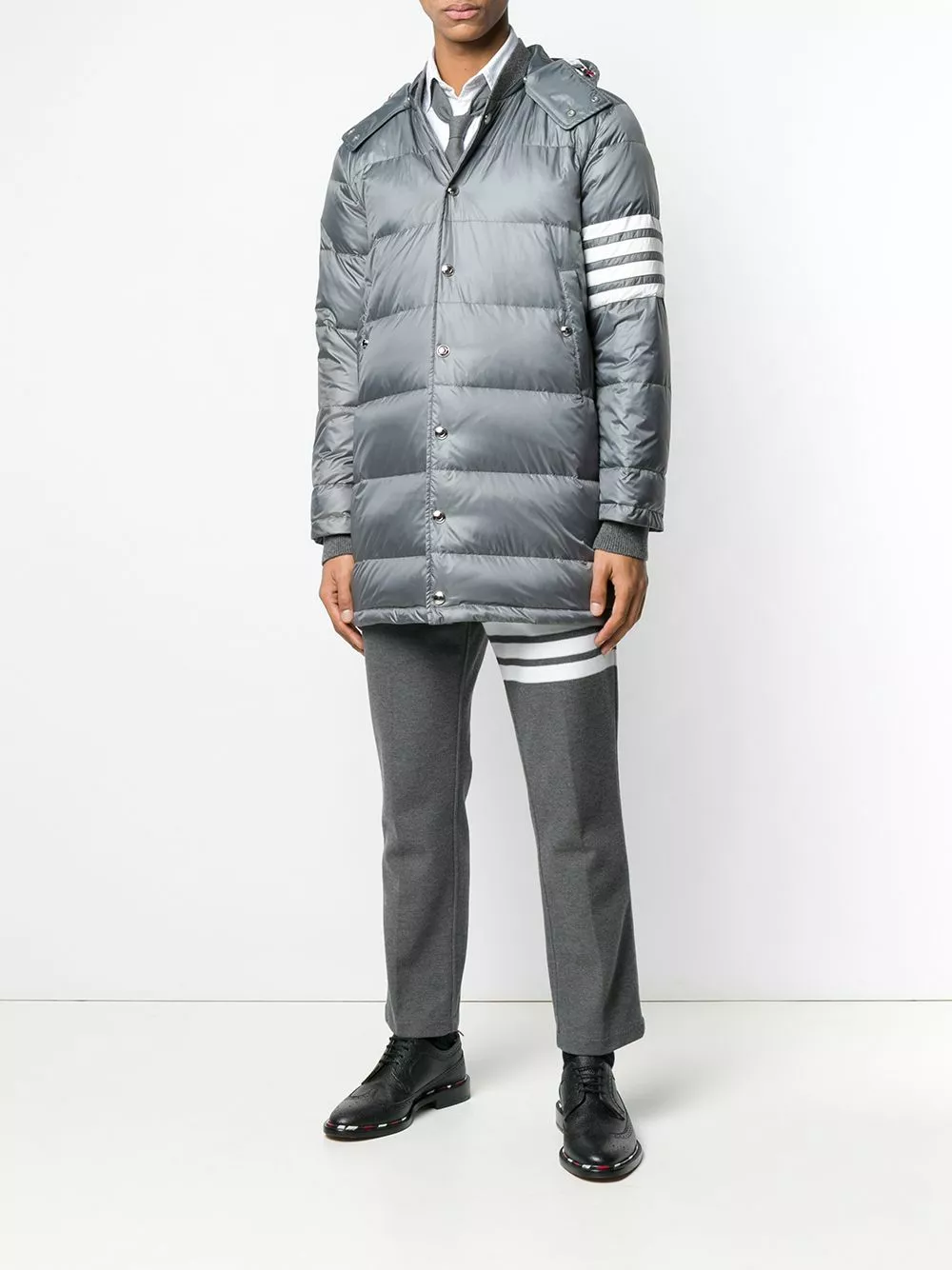 Reimagining menswear staples, Thom Browne tailors wools and tweeds to a modernised sportswear aesthetic. Quilted and padded with natural feather down, this Italian-crafted wool coat features a straight fit, a quilted effect, a snap fastening, a high standing collar, a hood, fitted cuffs, side pockets, a lining and four-bar stripes at the sleeve.