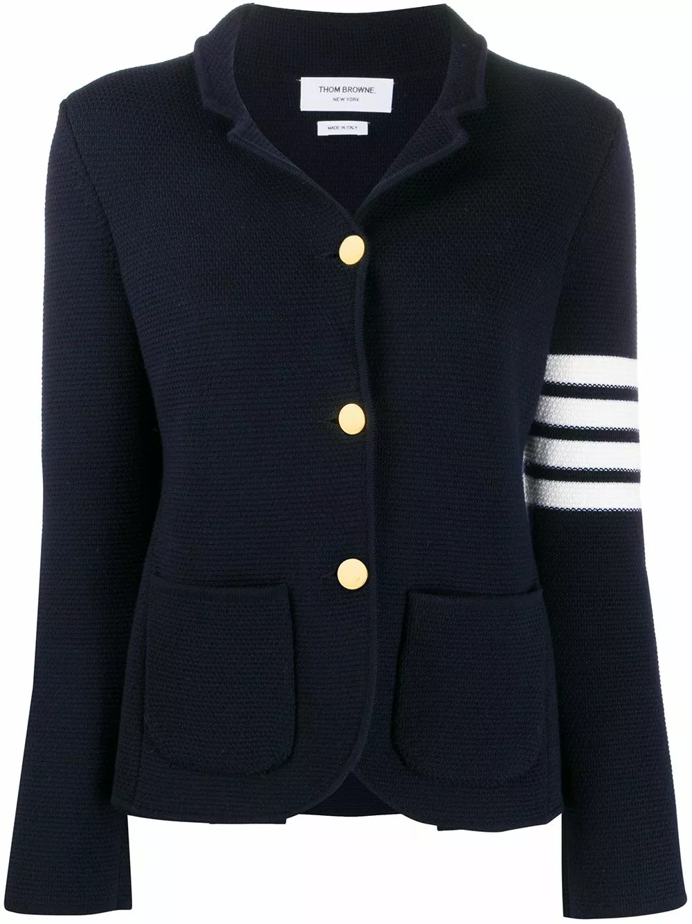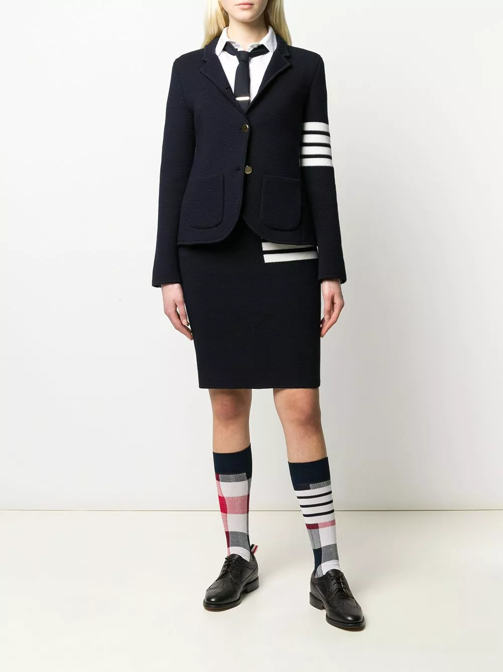 Get ready to elevate your style with this navy fine merino wool links stitch 4-Bar jacket from Thom Browne. Simple, but super classy! Undoubtedly, an essential piece. Featuring a classic check print, a button fastening, a chest pocket, two front pockets, long sleeves, a stripe detail to the side and a double vent to the rear.