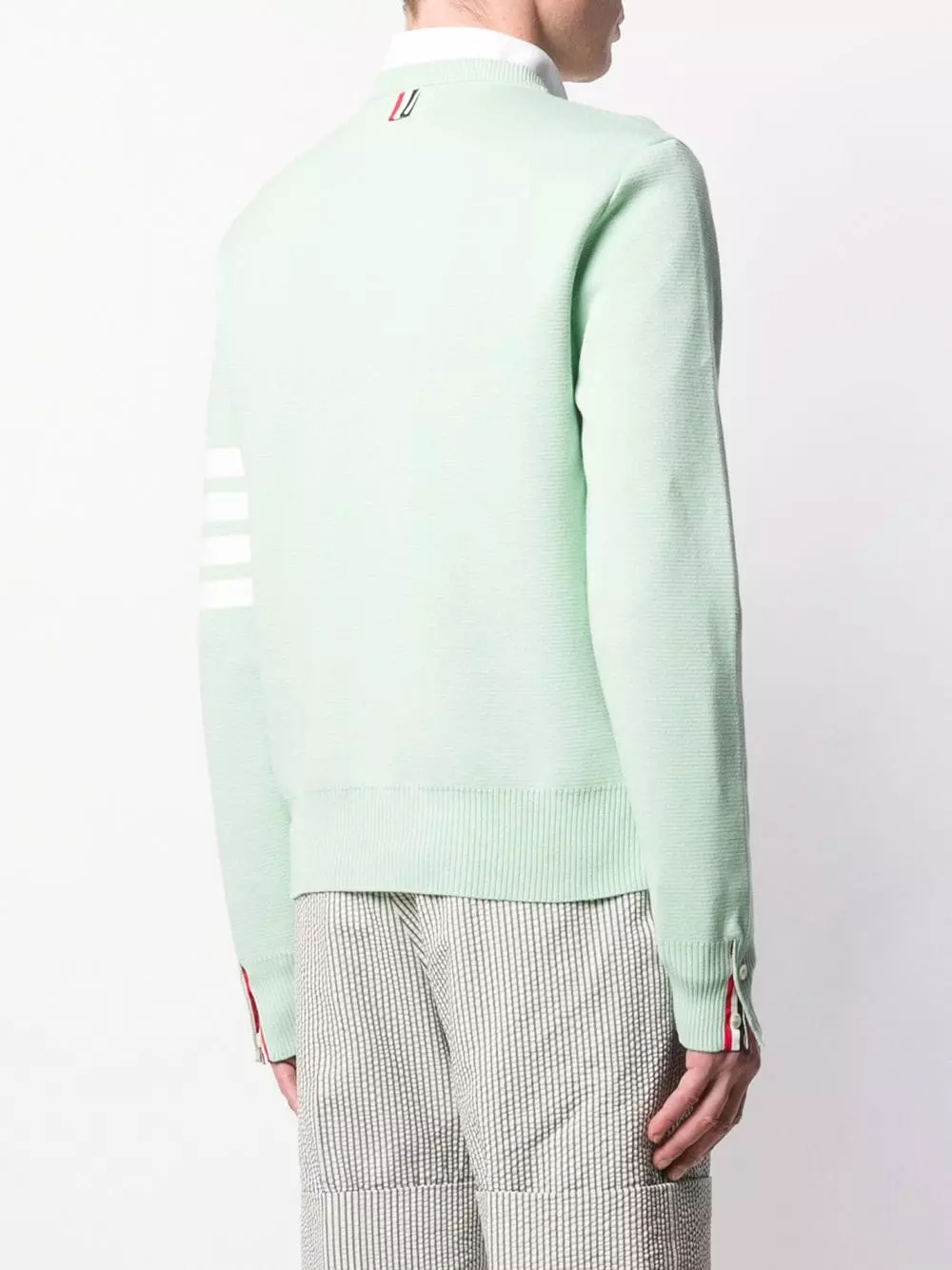 Reimagining menswear staples, Thom Browne tailors English wools and tweeds to a modernised sportswear aesthetic. Crafted from light green and white wool, this 4-Bar Milano stitch jumper features a ribbed crew neck, dropped shoulders, long sleeves, a ribbed hem and cuffs and four-bar stripes at the sleeve.
