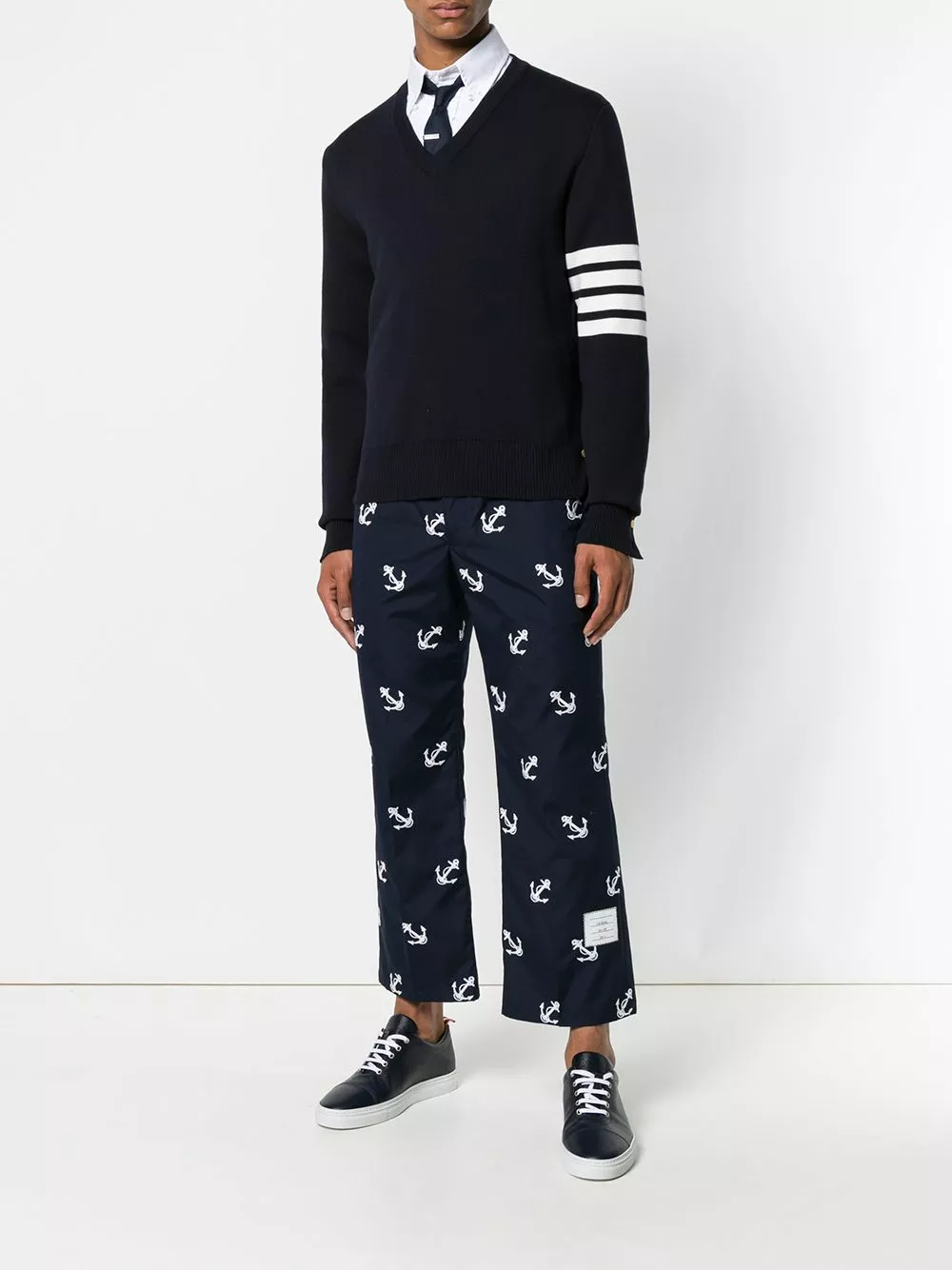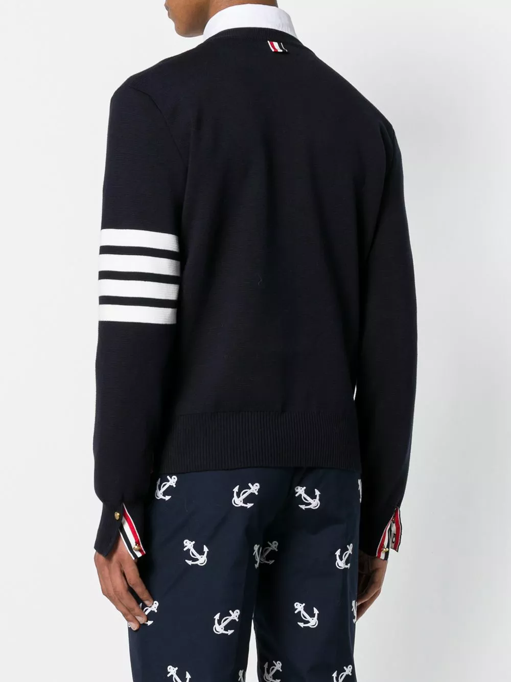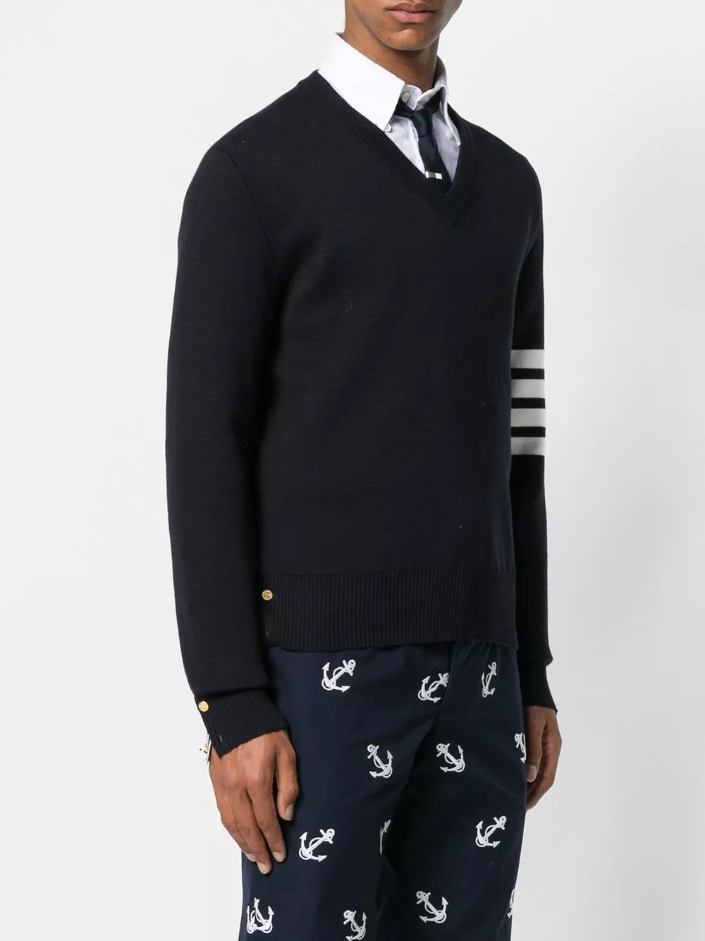 Navy cotton 4-Bar Milano Stitch V-Neck Pullover from Thom Browne.