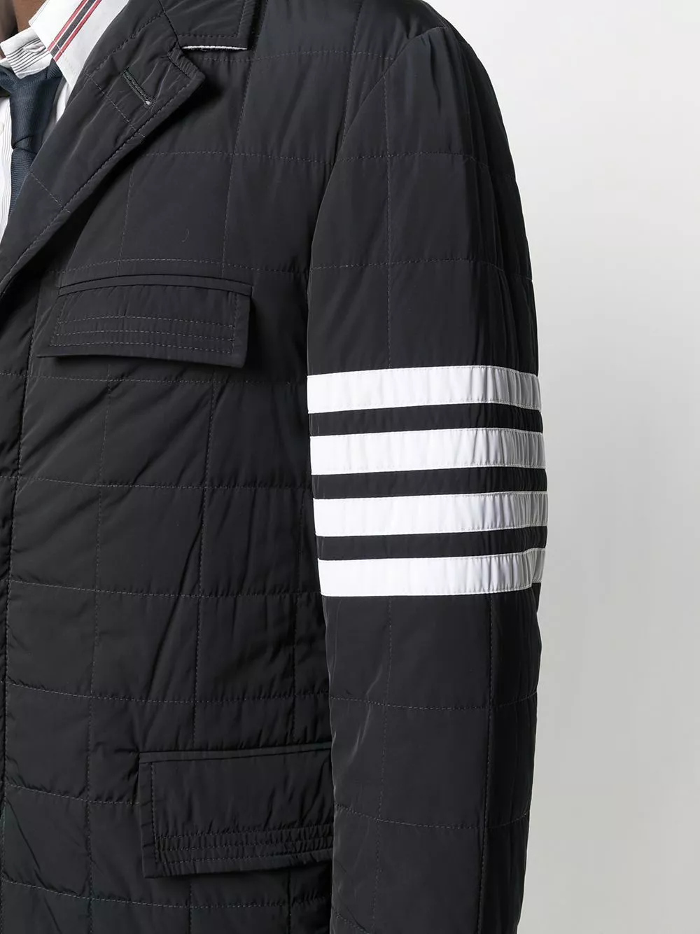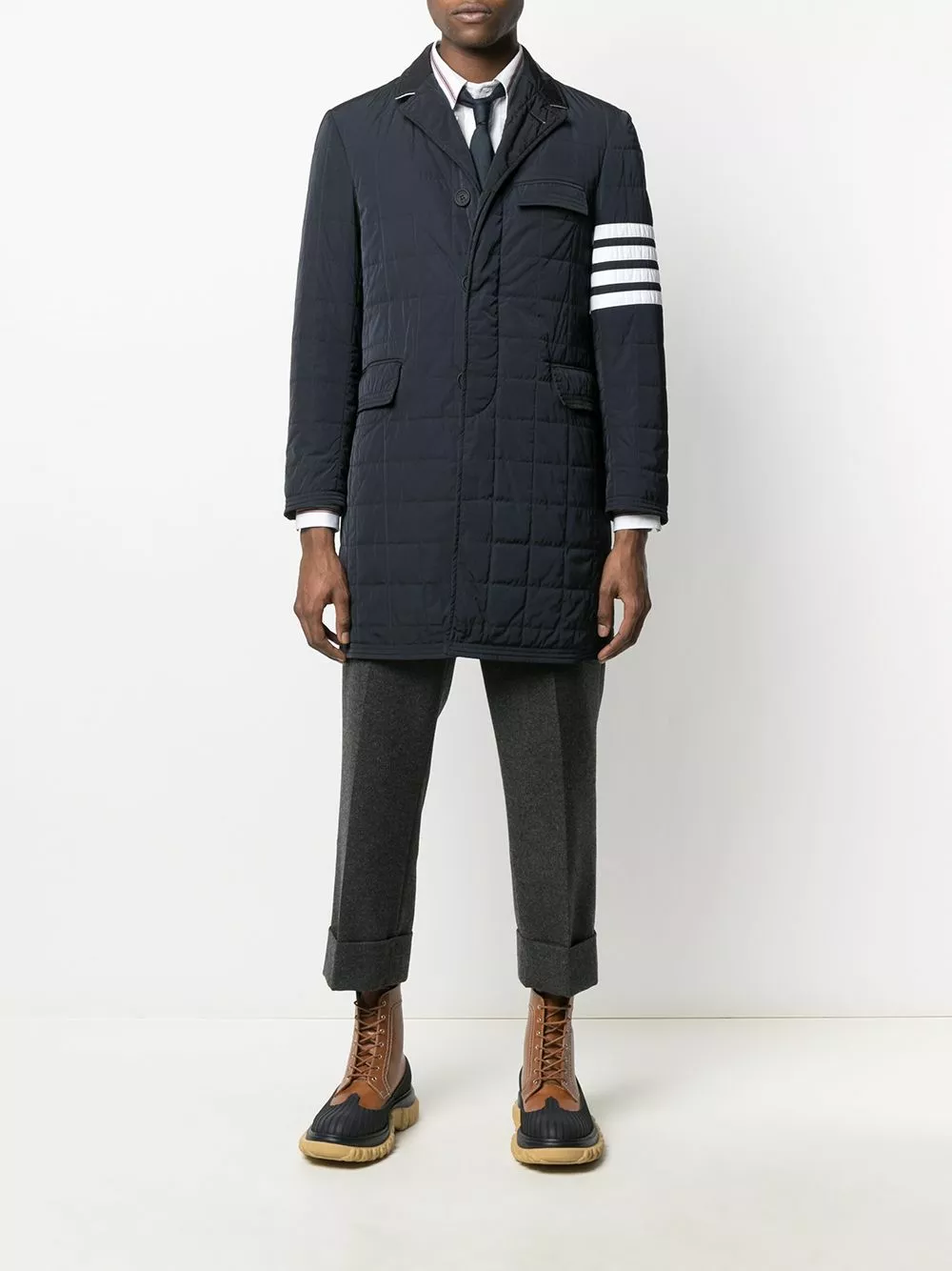 Indulge in a hyrbid. In a tailored cut but padded design, this jacket from Thom Browne benefits from the best of both worlds. Wrap up and remain dapper.
