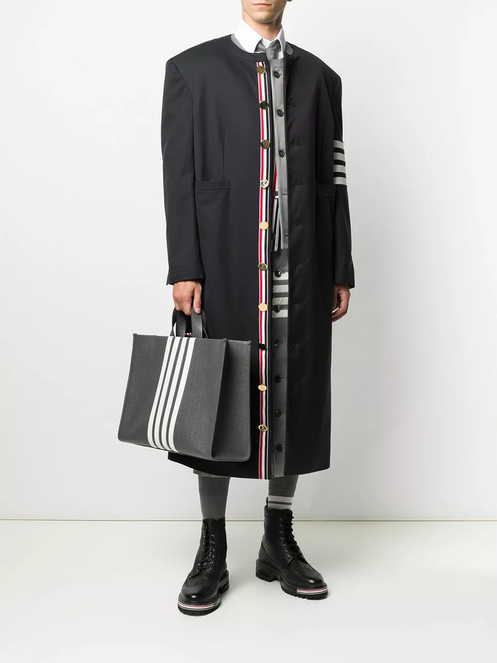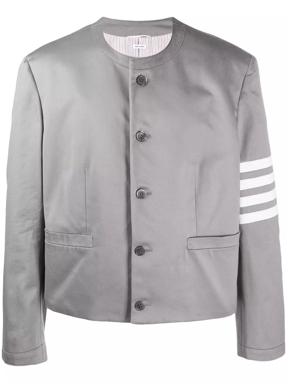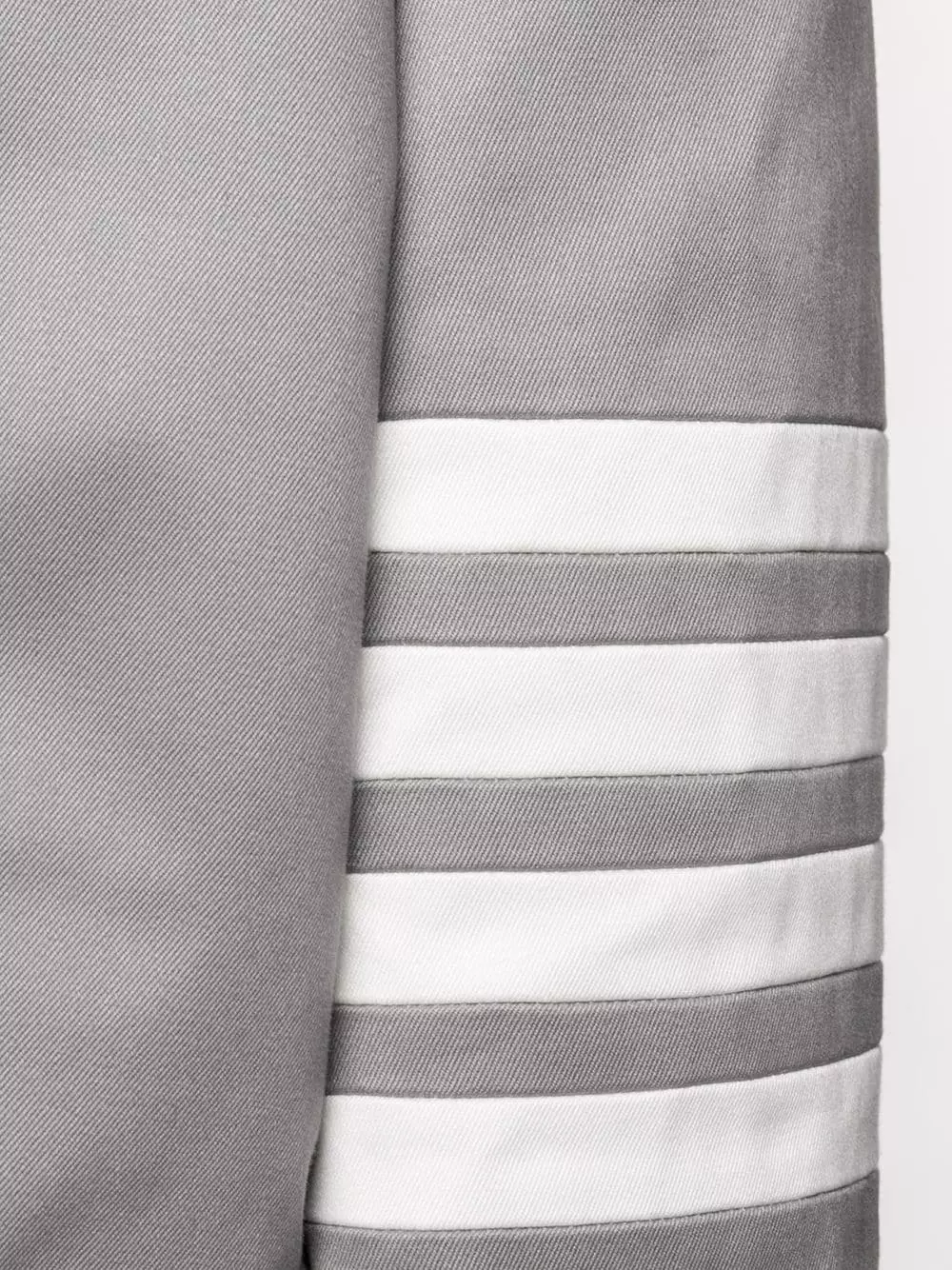 Show where your loyalties lie. Crafted from grey cotton, this oversized jacket from Thom Browne is finished with the siganture 4-Bar stripe pattern along the sleeve for added definition. Say it loud.