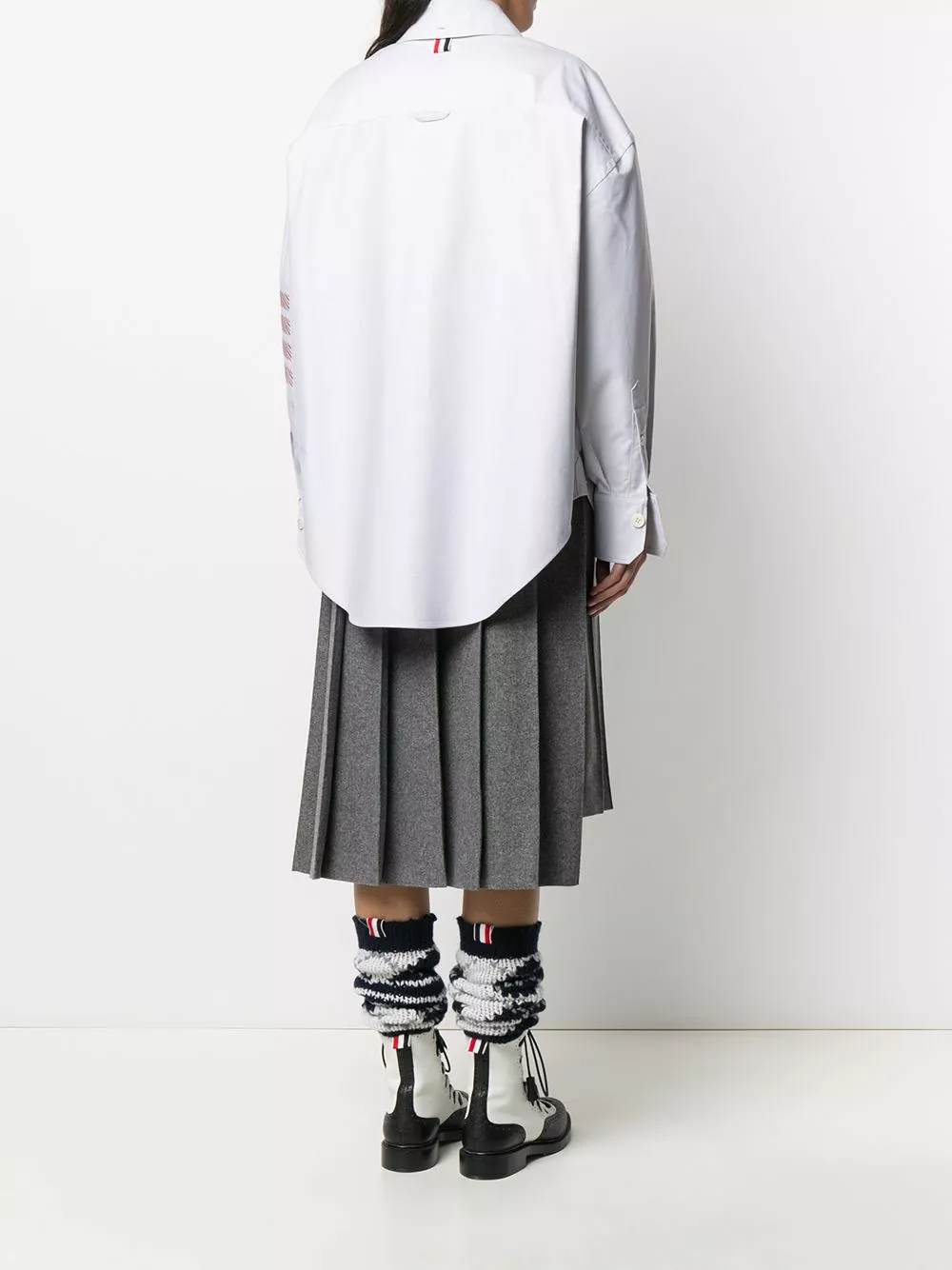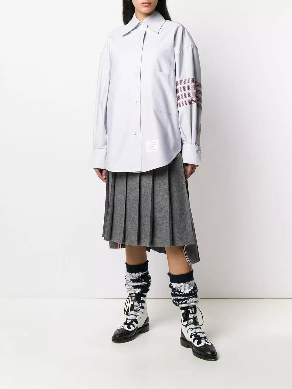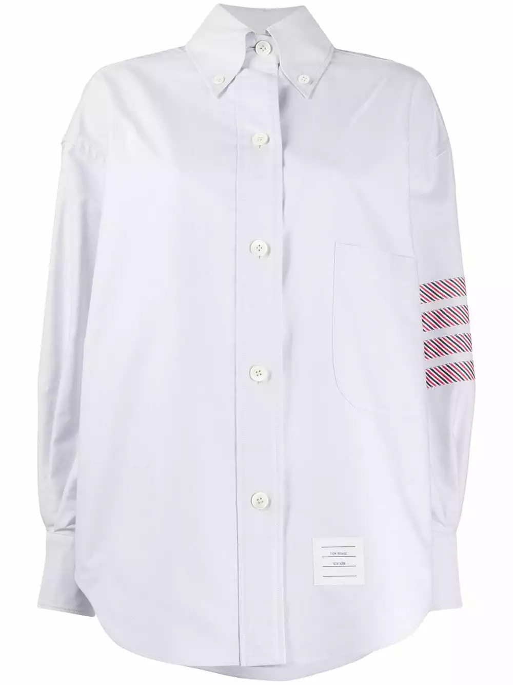‘Stripe’ a pose. But make sure you’re wearing this 4-Bar stripe shirt from Thom Browne before you do. Say cheese! Featuring a button down collar, a front button fastening, dropped shoulders, an oversized fit, long sleeves, button cuffs, a front logo patch, a RWB tab, a 4-Bar stripe and a patch pocket.