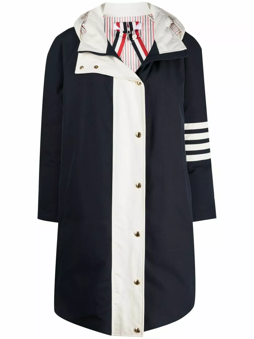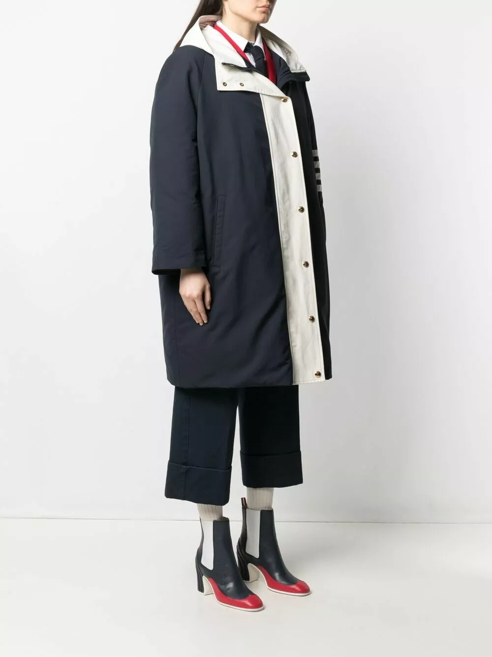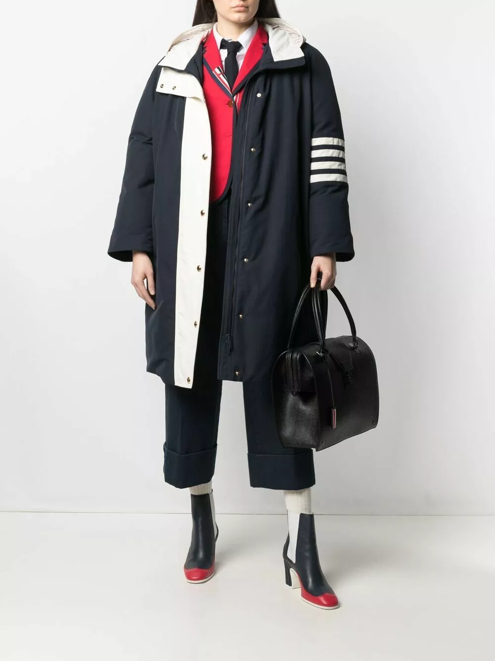 Looking for a steady outerwear option that you can wear for years to come? Thom Browne has just what you’re searching for. In navy and white, this 4-bar padded coat is a versatile pick.