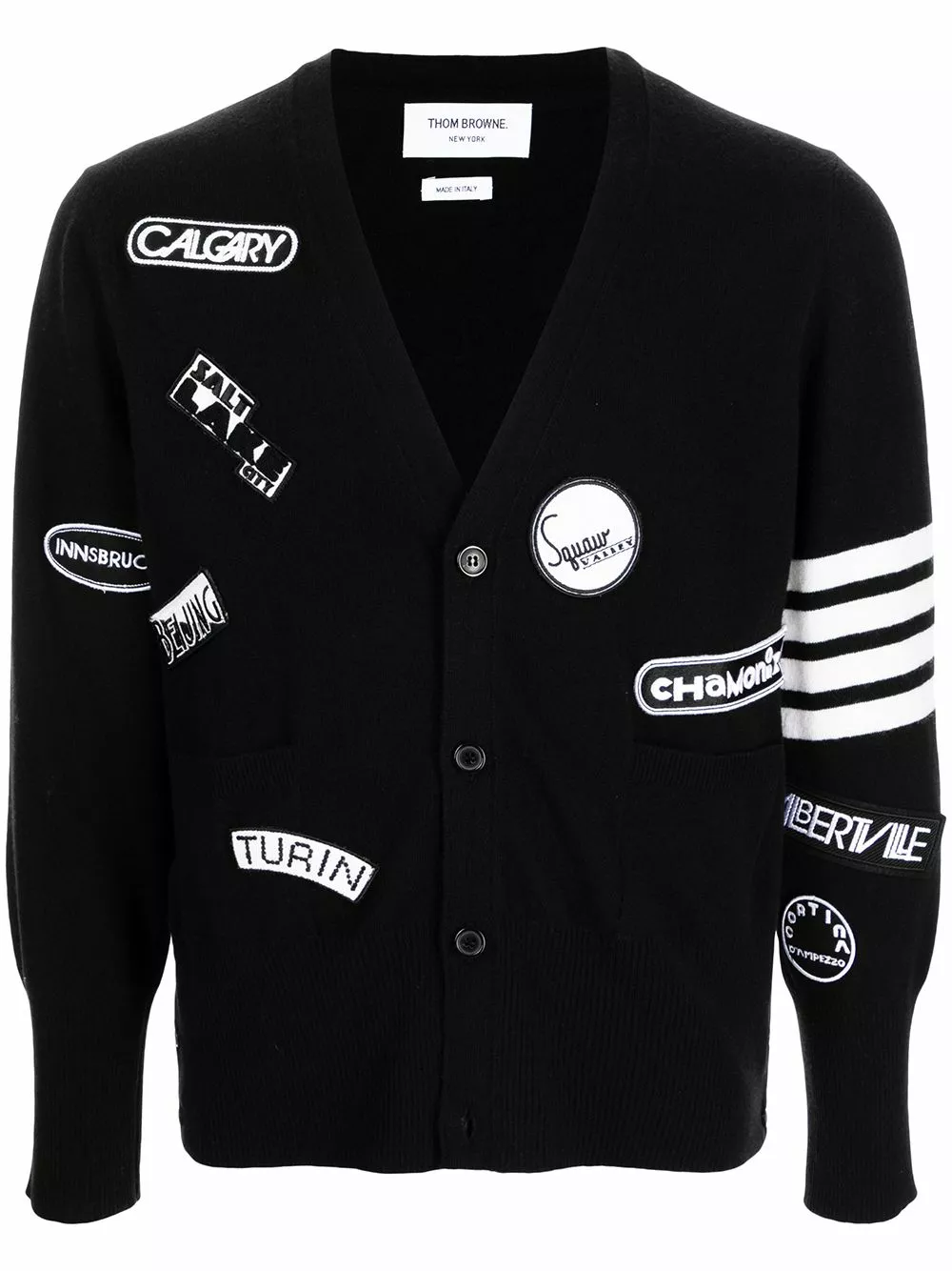 Mirroring the clean lines and signature house codes of the American brand, this merino-wool cardigan is decorated with embroidered patches, while Thom Browne’s 4-Bar stripe brings fashion knowledge to the scene.