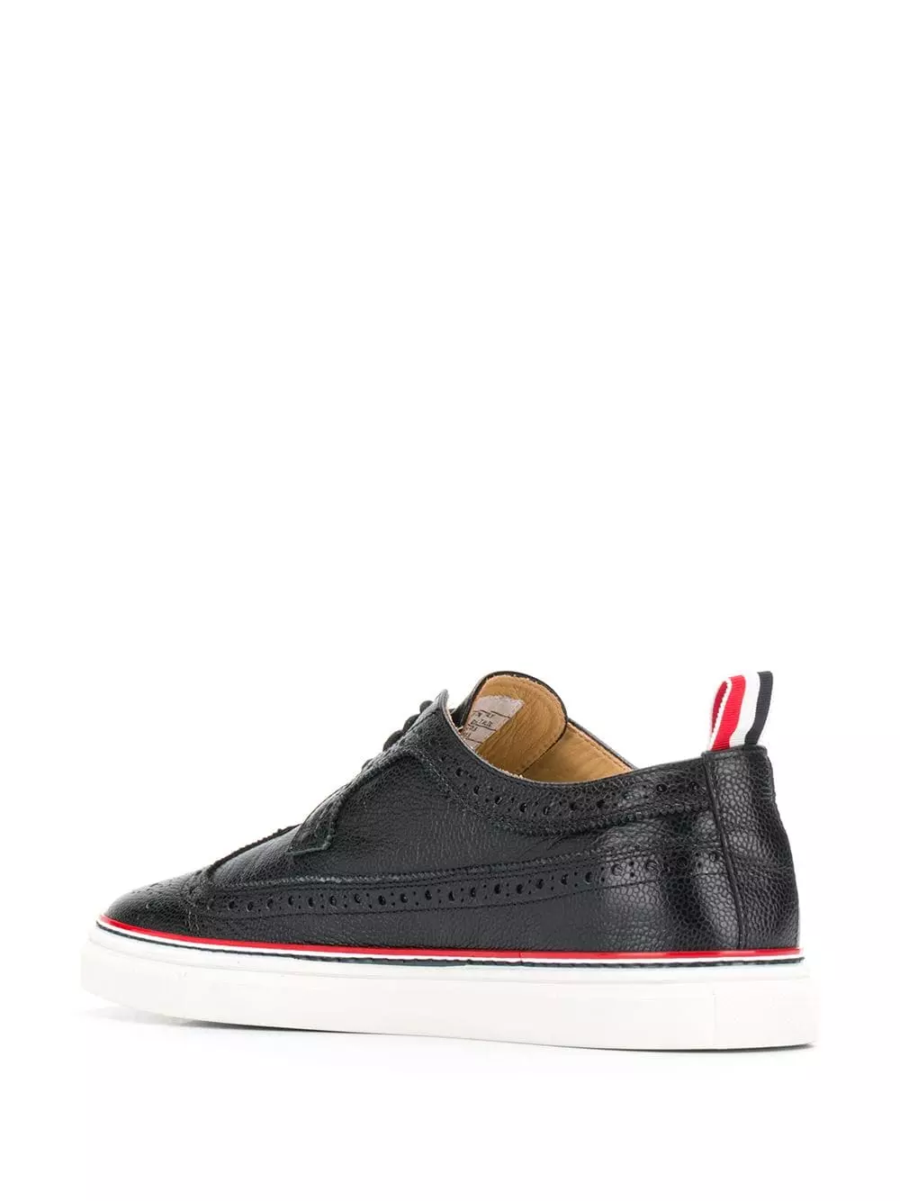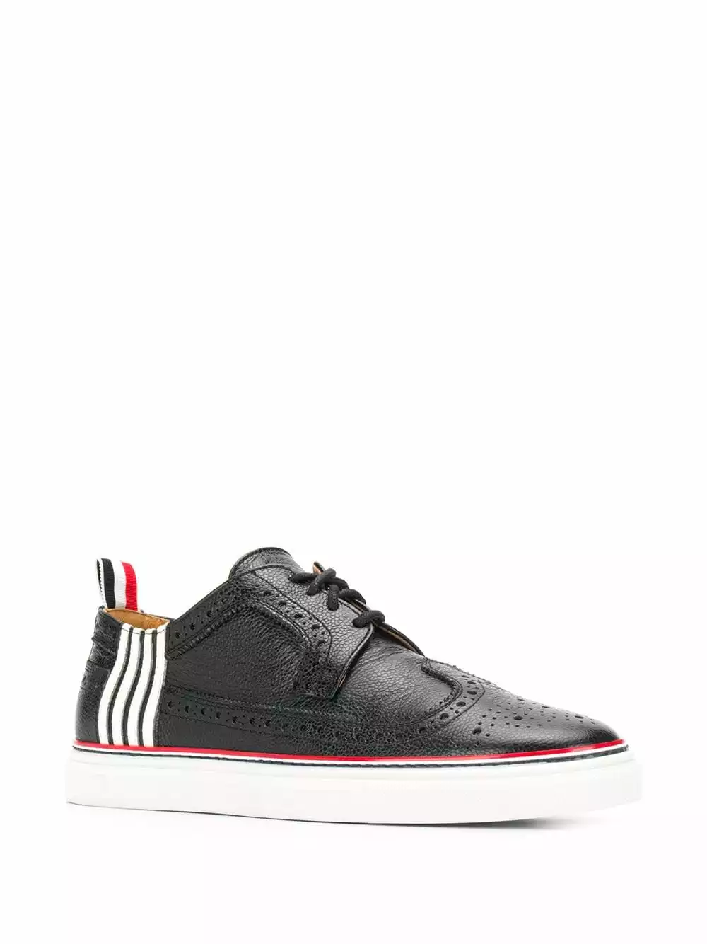 Thom Browne’s newest edit captures the immaculate craftsmanship and minimalist designs that have come to define the American label. Crafted from black pebbled leather, these brogue sneakers feature a round toe, a lace-up front fastening, decorative perforations, a stripe detail to the side, a flat rubber sole and a signature tri-colour striped trim.